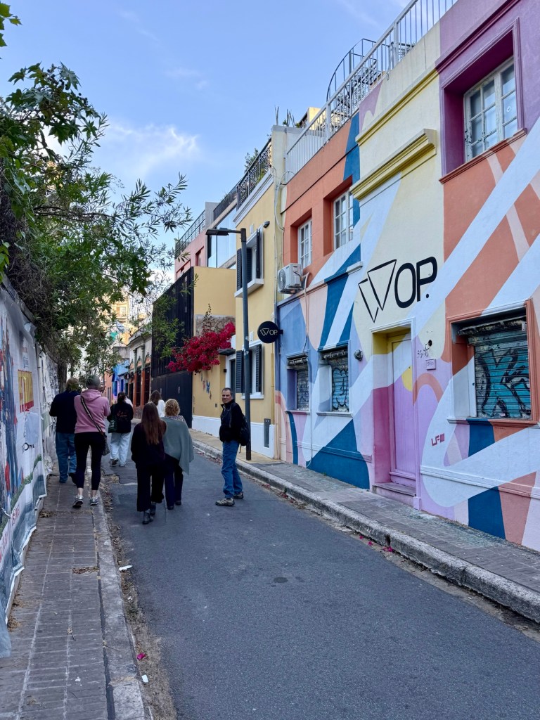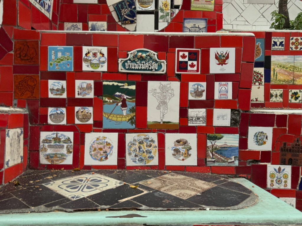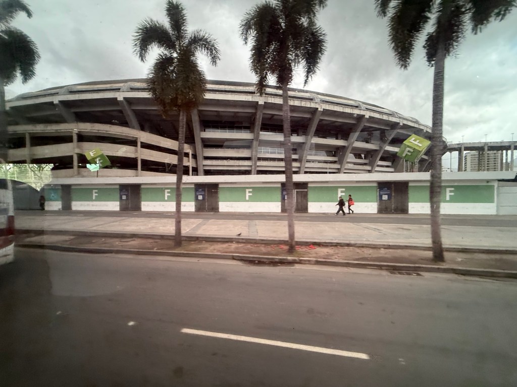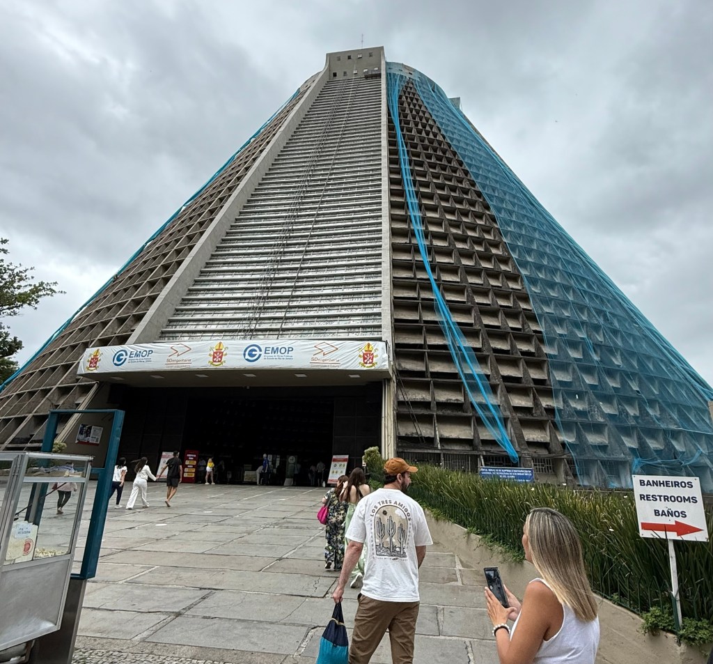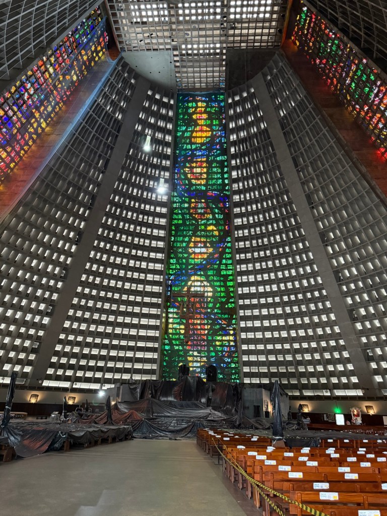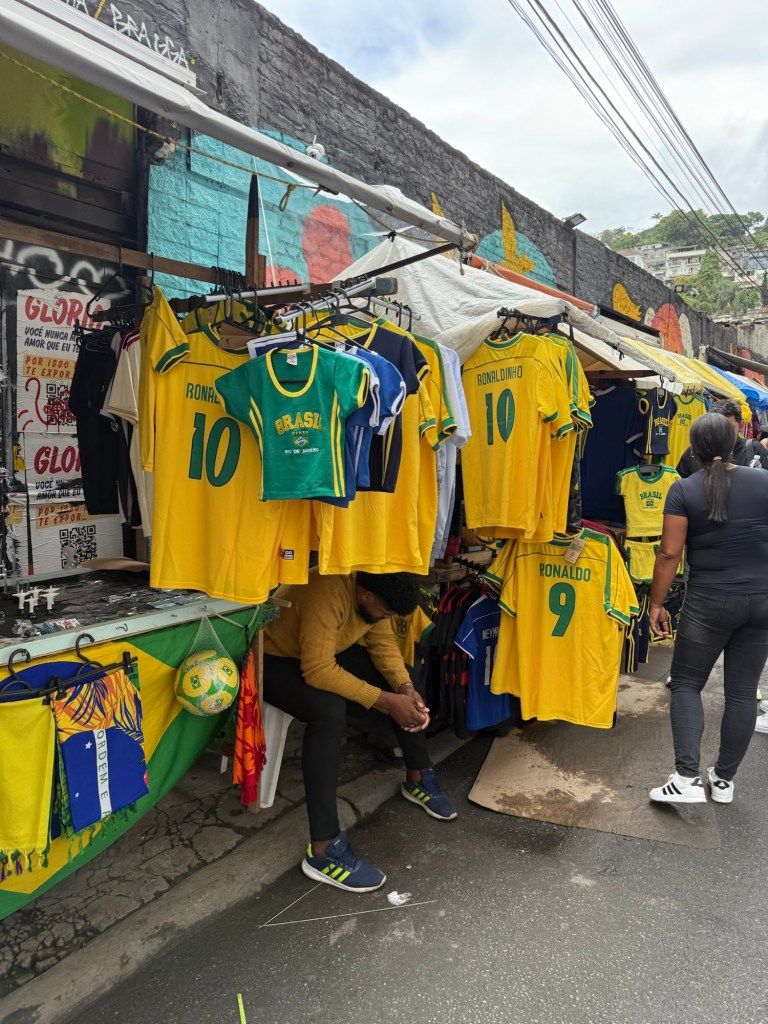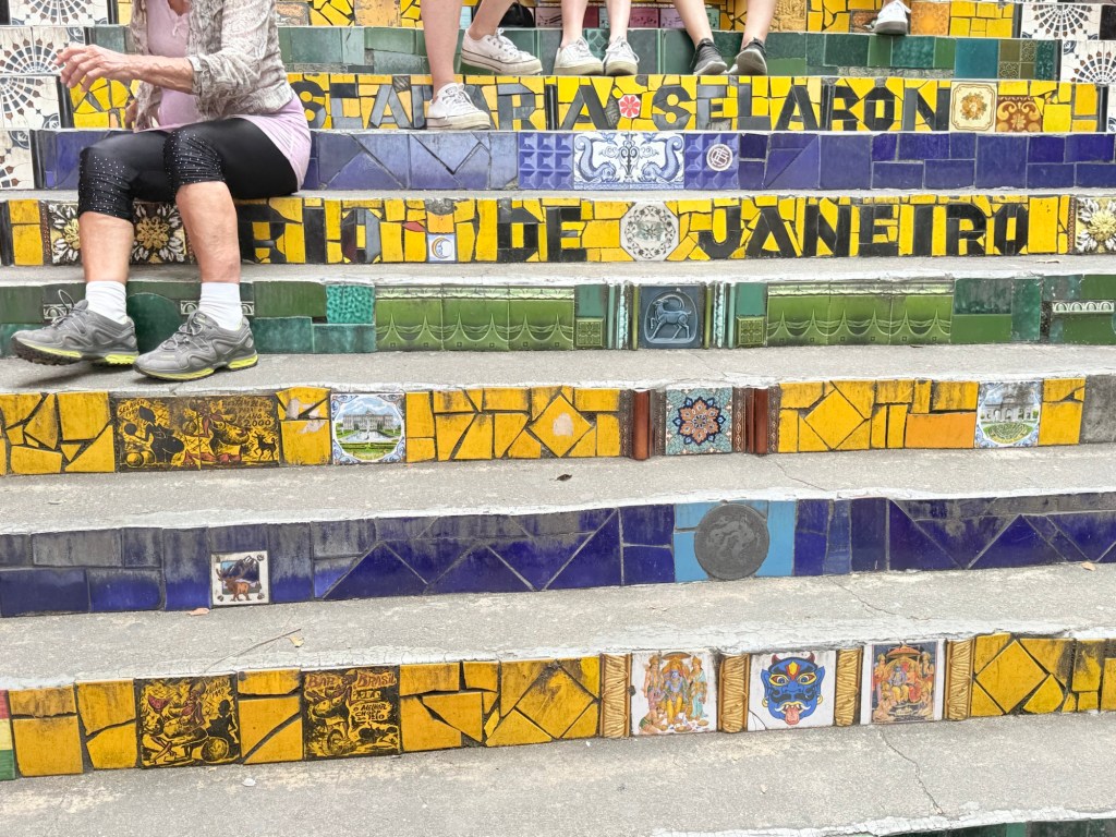Paolo talked a little about the favelas (impoverished neighbourhoods) where squatters have built small homes working their way up the valleys and on the sides of the mountains in the city. There are rumoured to be roughly 1.5 million people living in favelas where the services are limited but there is some self-owned, built and maintained infrastructure for water and power. Sewage, garbage removal, proper water, and crime are issues as well as powerful drug gangs in many of the favelas. You may have heard on the news about crackdowns by police in Rio that ended in 132 deaths in the week before we arrived when 2500 police officers, soldiers and snipers targeted the Red Command, a criminal organization that has ruled some of the hillside towns for decades. There are some where you can take guided tours, though tourists are encouraged not to wander into them on their own. It reminded me that I took a tour of the “Townships” in Johannesburg when I was there years ago. It was an uncomfortable but educational experience that would likely be a similar experience here. The graphic depiction of the favelas is used in many of the textiles we saw for sale in tourist shops throughout Rio.