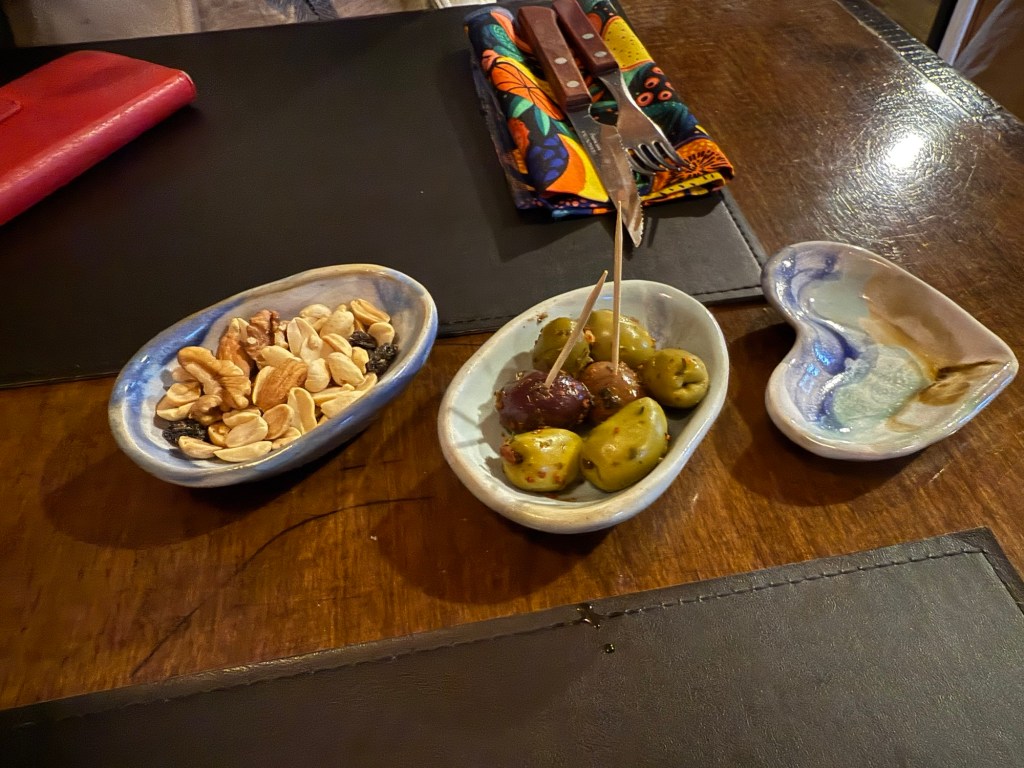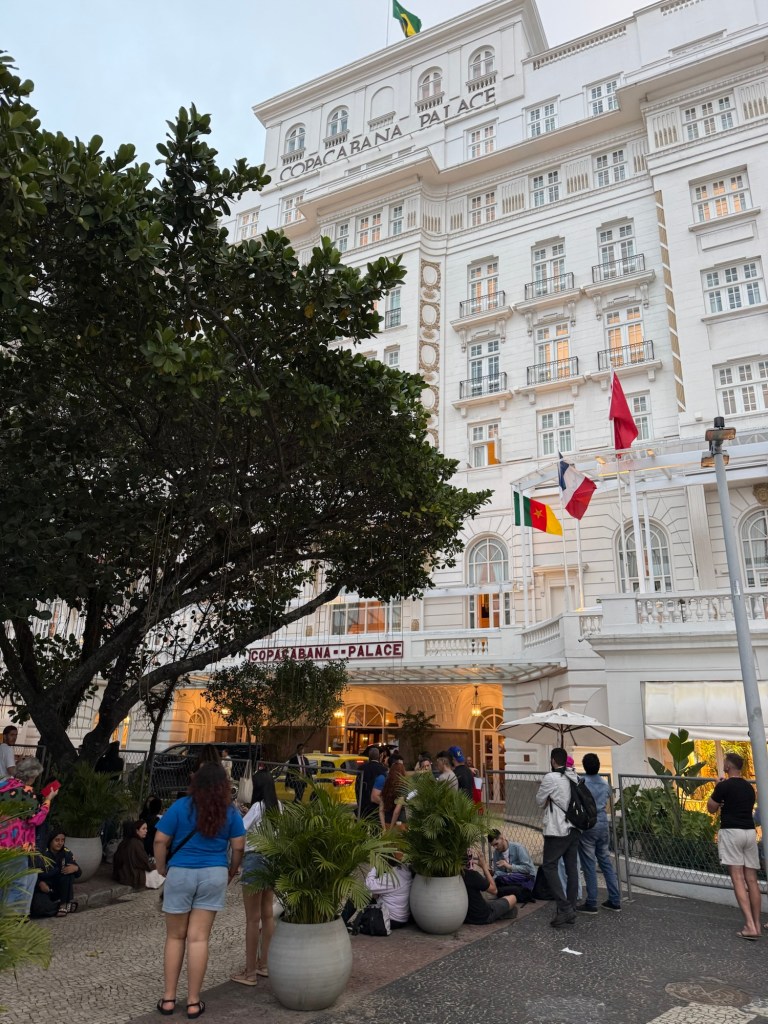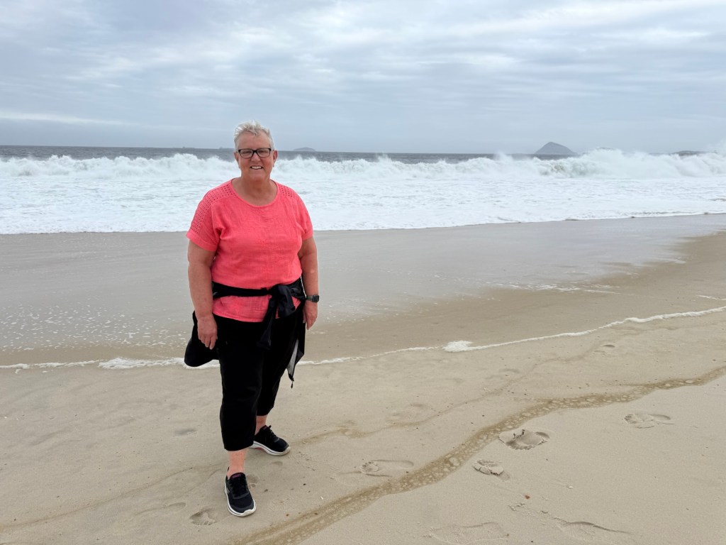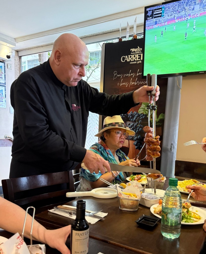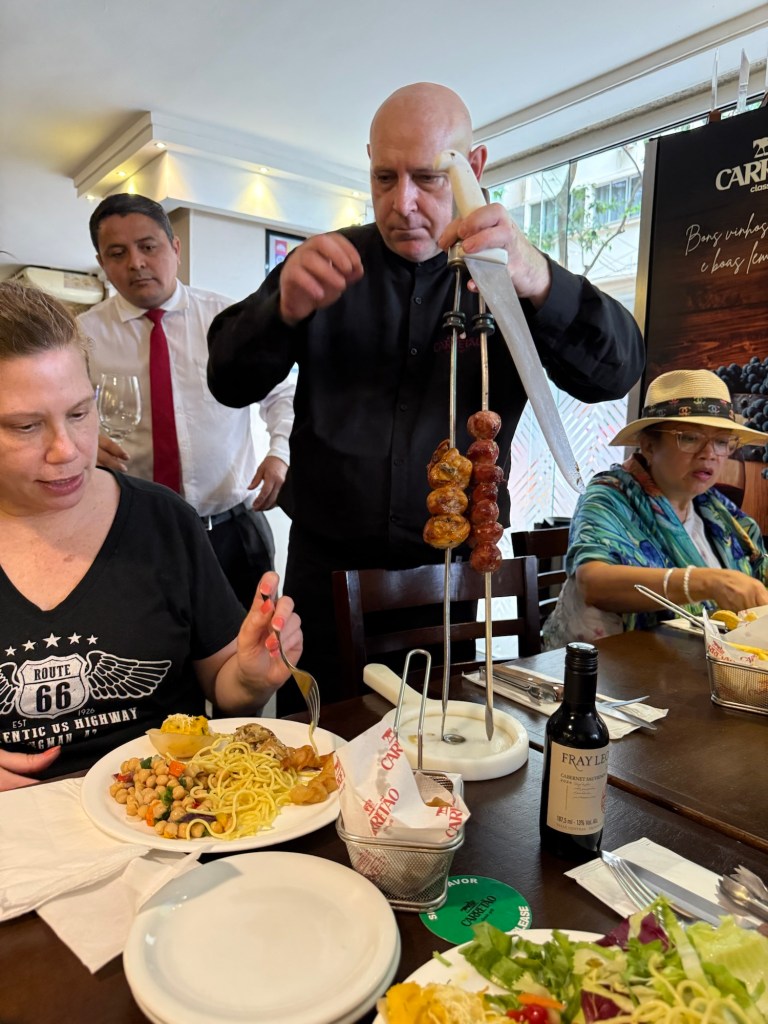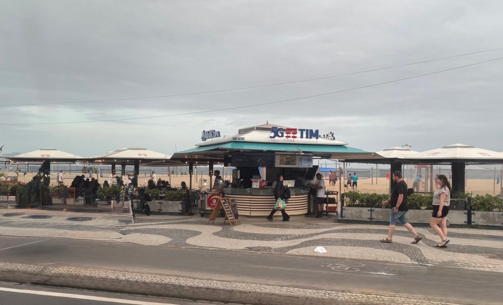 Copacabana Beach and one of the casual outdoor restaurants that line the beach seemed to be a good idea for our last lunch in Rio. I had the best hot dog I’ve tasted in my life. Served on a warm, incredibly fresh white bun, it had melted brie and hot pepper jelly smothering it. Yum! We sat for some time watching the action on the beach where there were vendors selling and renting all manner of things, including beach chairs and umbrellas, hats, scarves, food and more. It wasn’t exactly warm and as a result there weren’t many people on the beach and some of the vendors were already packing up and leaving by 2 pm or so.
