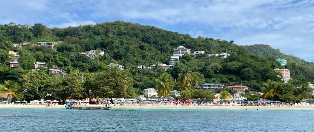 After our snorkelling adventure our guide took us at high speed (our boat had 2, 250 hp engines and could go like stink) on a tour of some of the nearby sites. He started at Grand Anse Beach where many of our fellow passengers took water taxis and spent the day on the beach in rented lounge chairs and attendants bringing food and drink. One hotel, the Silversands, apparently owned by Egyptians, costs $1100 a night! But there are many others that are reasonably priced and the beach is pretty spectacular. It’s 2.5 km of beautiful white sand and warm water.