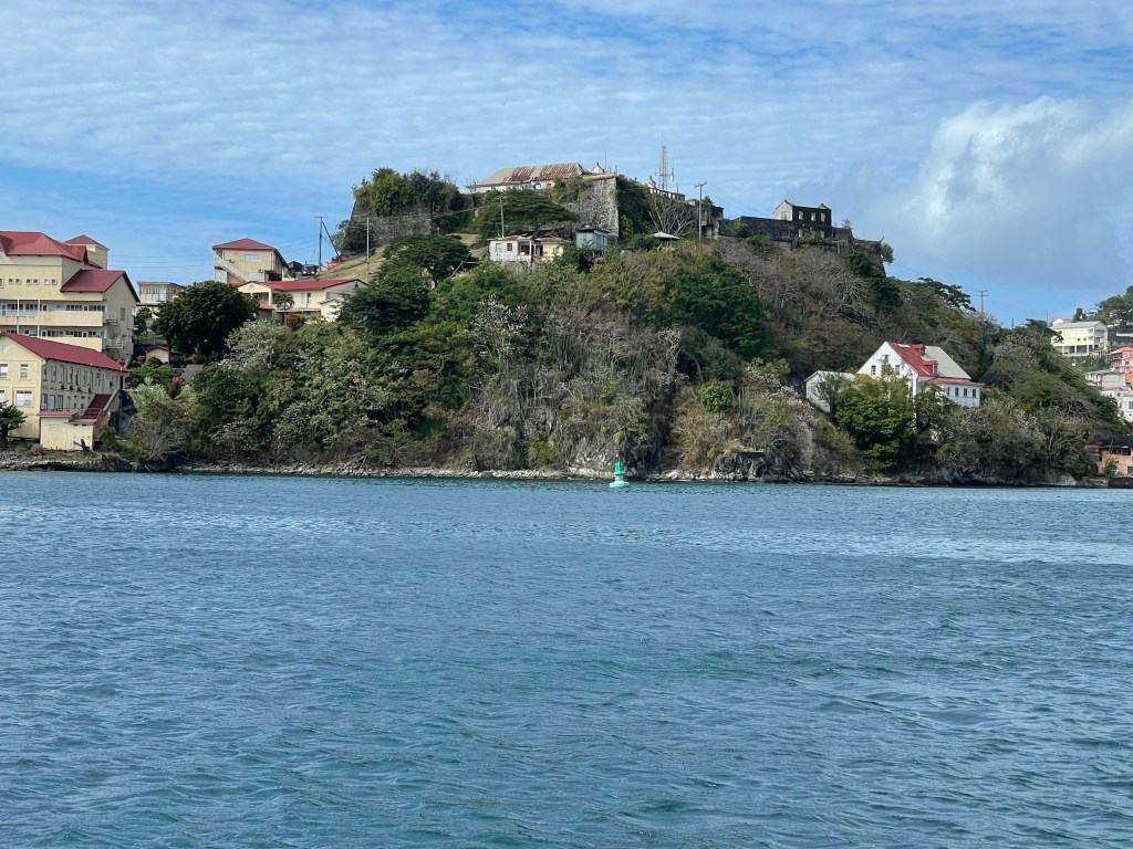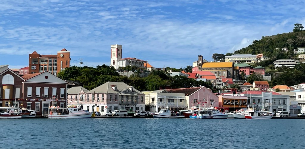 Part way through the night, I realized that the rock and rolling had stopped just as the Captain had promised. I easily went back to sleep being gently rocked. And when I woke up again this morning, we were approaching St George’s, the capital of Grenada. Unfortunately it was grey and raining. From 8 am to 10 am while I was having breakfast and getting ready to explore it had drizzled, poured rain and been sunny. It is close to 100% humidity I’m sure. There is a reason that Grenada is green and lush. Fear not, the sun came out and the day was gorgeous.