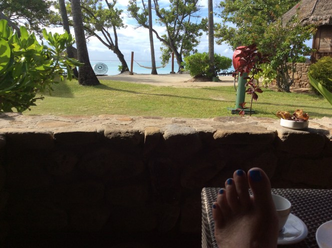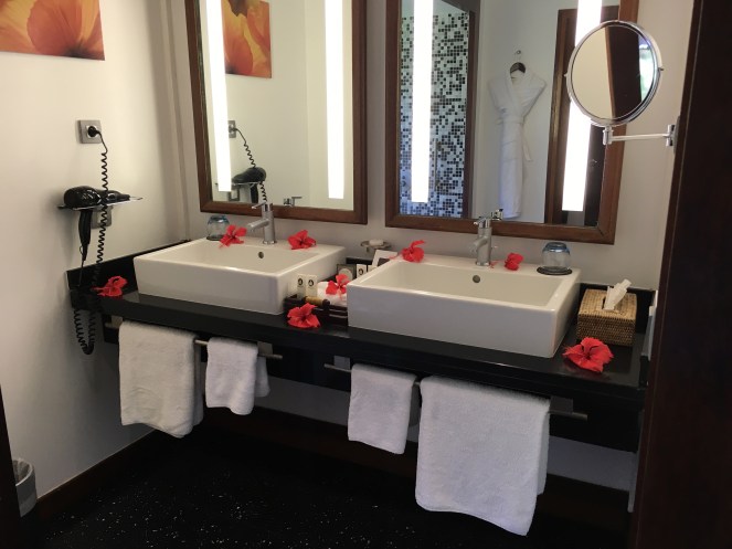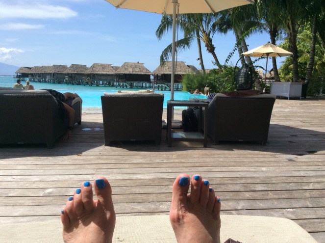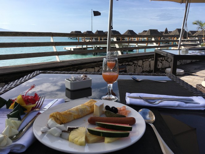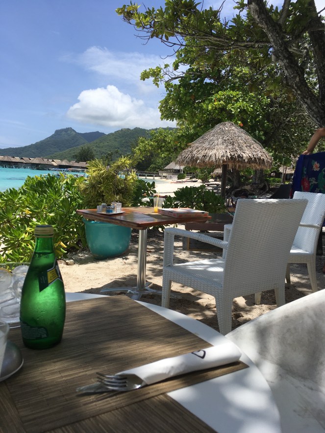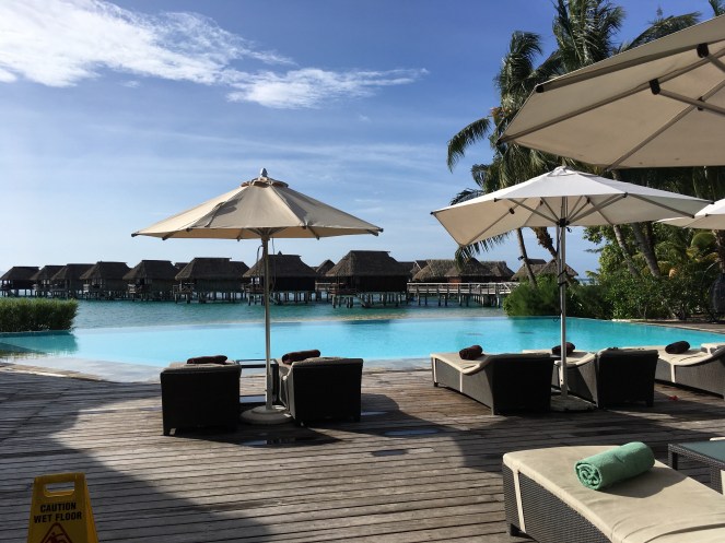 The islands are known for the over-the-water-bungalows which you will have seen pictures on in my last post, as well as the beautiful clear water, coral reefs and safe lagoons. The beach at our resort is similar to beaches we’ve seen all over the island (except I heard rumour that the beach at the Hilton is imported sand) and is hard packed sand with lots of sun bleached shells. It’s excellent for swimming with a gentle drop and sandy bottom. Within the lagoon in front of the hotel, which is closed to motorized boat traffic except those owned by the hotel. We’re hopefully going to snorkel here before we leave.