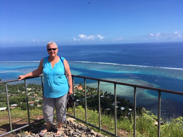 Back into the 4 X 4 and down the narrow road and on to drive around the largest bay on the island, Opunohu Bay on our way to Magic Mountain. Again up a narrow winding one way road. And I have the bruises on the inside of my upper arms to show as to how difficult it was to stay put in the 4 X 4. At the top of the road was a short steep path to get to the look out, but it was worth every step. It’s beautiful everywhere you look on this island but they were extra special from this view point. We could see down over the entrance to Opunohu Bay where a medium size cruise ship was unloading it’s passengers on to tenders to spend the day on the island. You could really see the different depths of water from this vantage point and the natural break in the coral reef at the entrance to the bay.