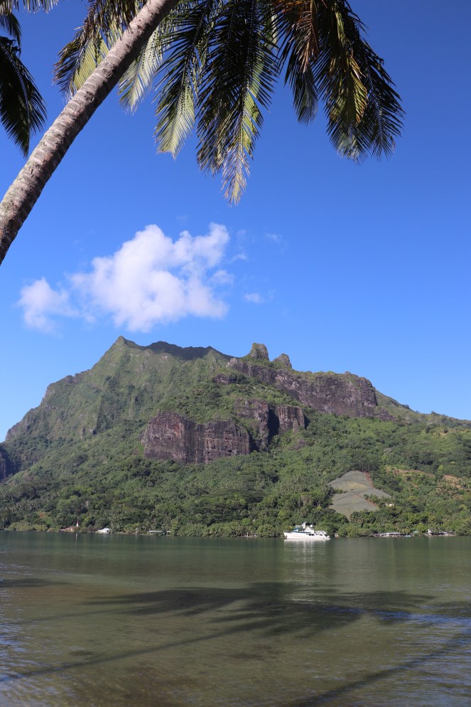 We also got a look at Mount Mouaputa (830 metres) which has the distinction of having a hole right through the top of the peak. Ron helped us to use our imaginations to see the princess with her hands in prayer in the profile of the mountain. Later in the day when we came back through Cooks Bay, the cloud had covered up the hole and most of the princess.