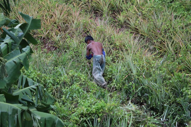 Back on the road, we followed an inland road through the PaoPao Valley and into Cooks Valley to join up with the main road again. Along the way, we got to see the commercial growing of pineapples. It’s very labour intensive and we saw one fellow at work with a machete carving back the weeds to expose the pineapple plants. He had to wear protective clothing on his arms and legs to prevent him from getting cut by the razor sharp leaves of the pineapple plants. A full 80% of the pineapples grown commercially (generally by farmers renting small plots of land from the owners) are sold to the pineapple juice factory on the island. The rest is sold domestically and we’ve had great pineapple on our fruit plates while we’ve been here.