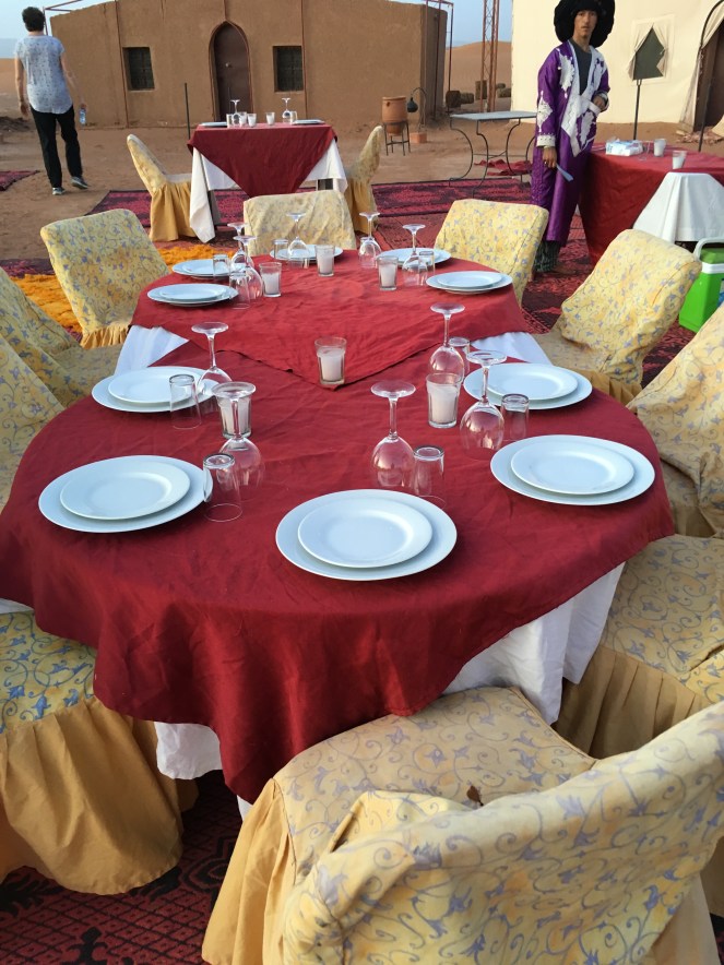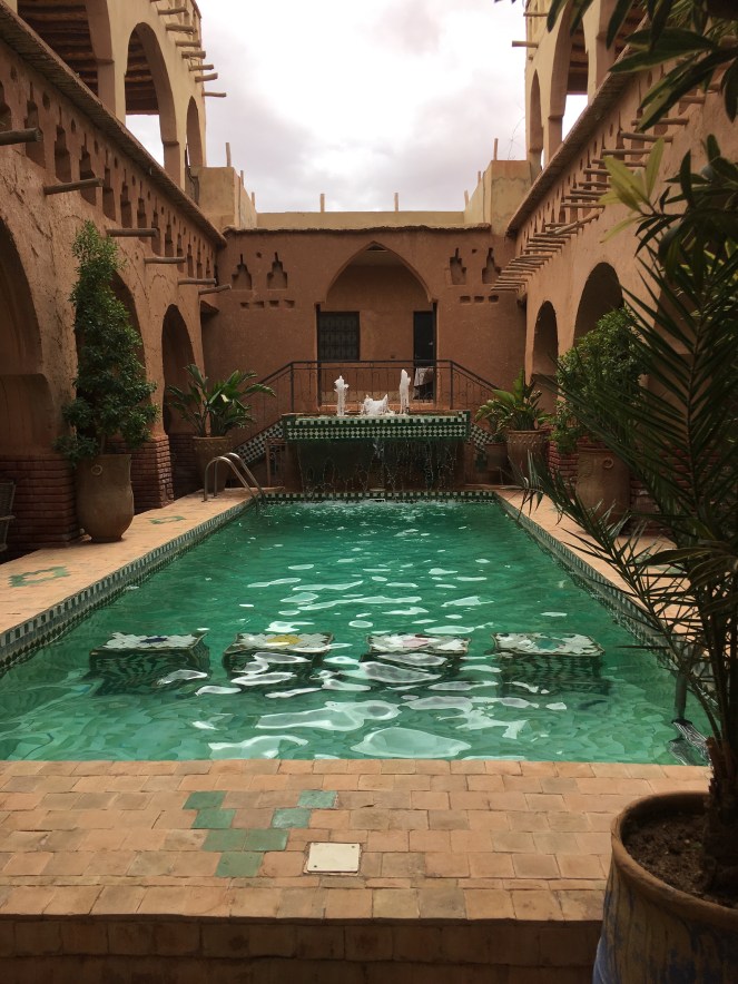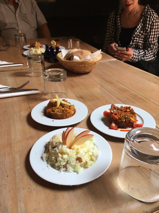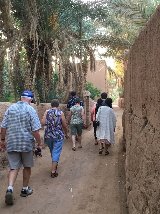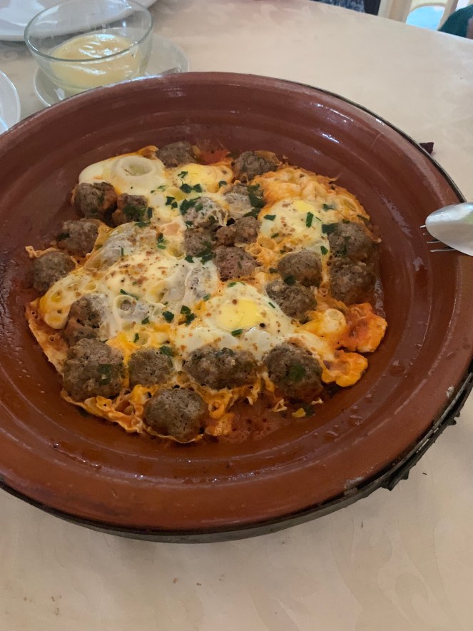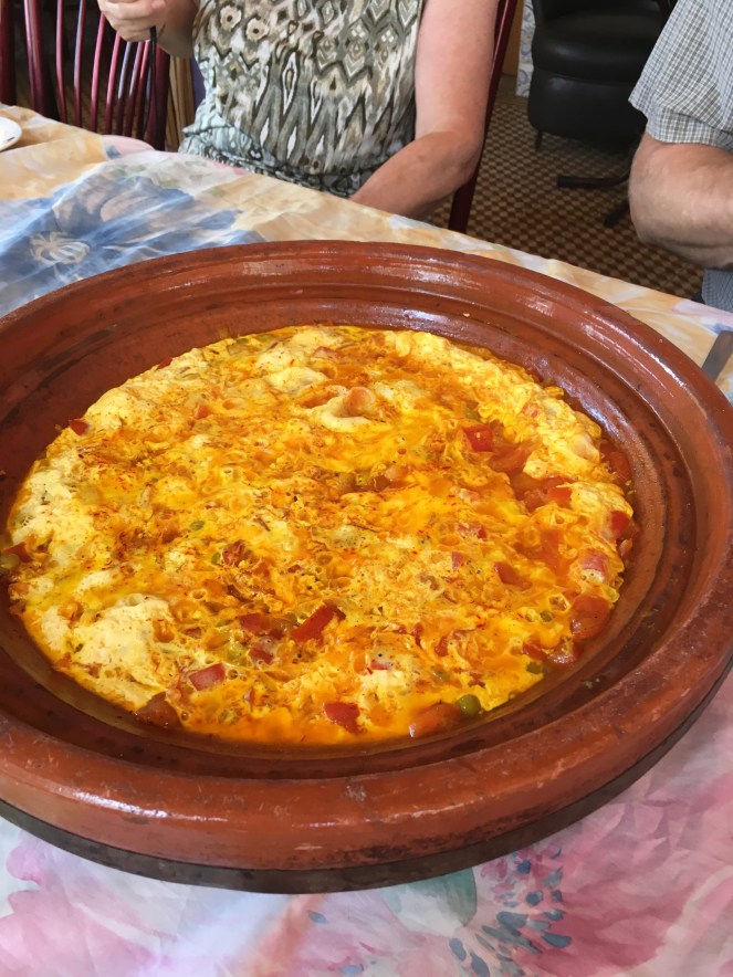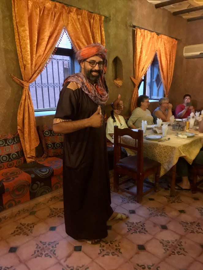 Our hotel here is “really basic”, which Abdul warned us several times, but we had a great dinner in a nice restaurant tonight which I think we all enjoyed as one of the best we’ve had. I had Kefta Tajine once again and it was even better than the last one I’d had. Dessert was sliced apples, bananas and oranges drizzled with honey and sprinkled with cinnamon. Yum.