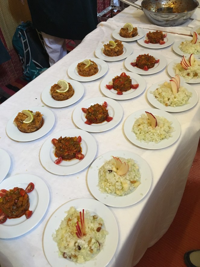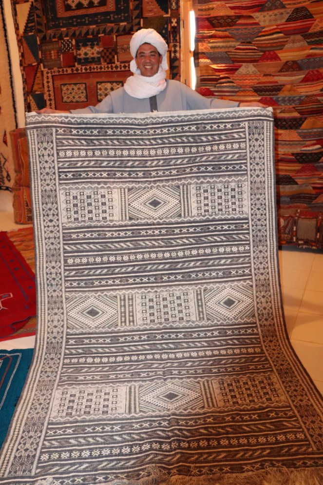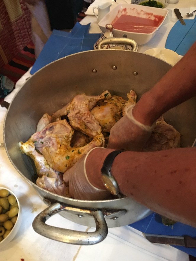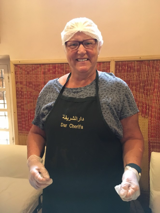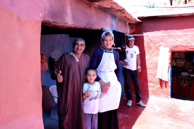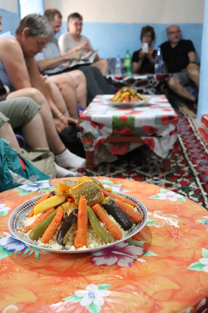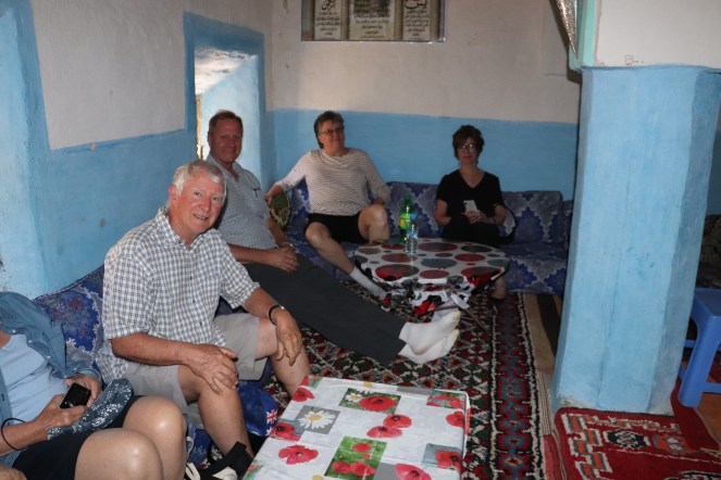He first produced a kettle of water and soap, and a special container to catch the water which he poured over our hands as we washed them, and a towel to dry them. This is a traditional comfort which hosts provide for their guests and since I was first, I was thankful we had experienced this before at the women and children’s cooperative so I knew the routine. We were seated on low cushions at low tables, in a room that was kept for special occasions. His wife prepared a fabulous Couscous dish with chicken and vegetables, and that was followed by the traditional mint tea and biscuits (which Mike on our tour really liked). Her cooking duties done, the woman named Sophia, came to meet us. She was so lovely, gentle and genteel. And their son, Said, also came around to handshake with all of us.