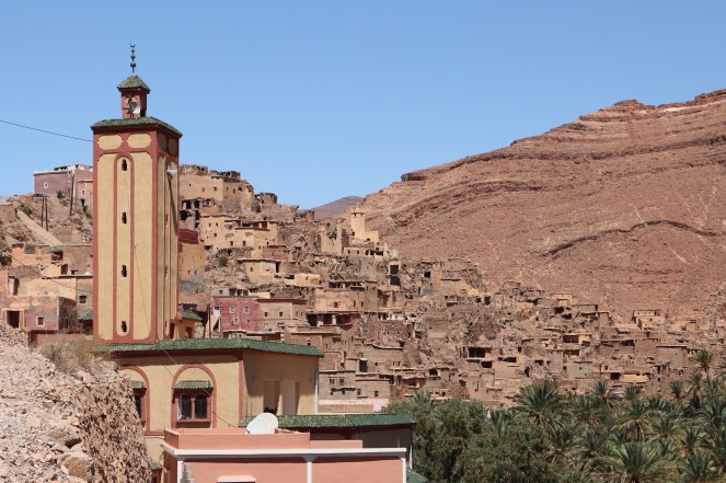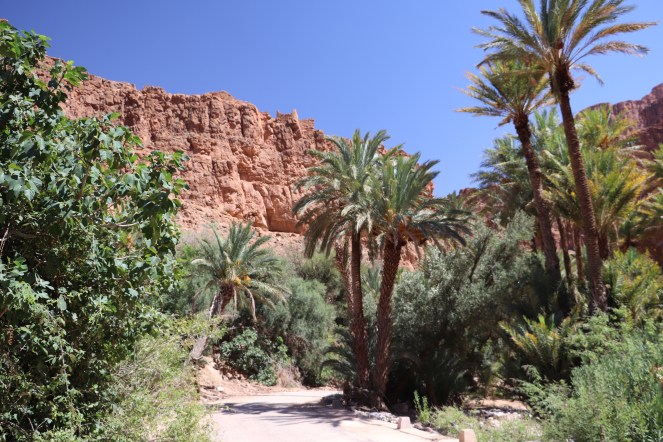 Just before lunch time we got to a place were we started down a long, winding road into the Ait Mansour Gorge. We went from approximately 1500 metres to 200 in the matter of 30 minutes. The views along the way were spectacular as the gorge has been cut out of the granite rock by hundreds of years of flooding after rain in the mountains. The contrast of the red earth and palm trees and other greenery made each turn in the road a delightful surprise.