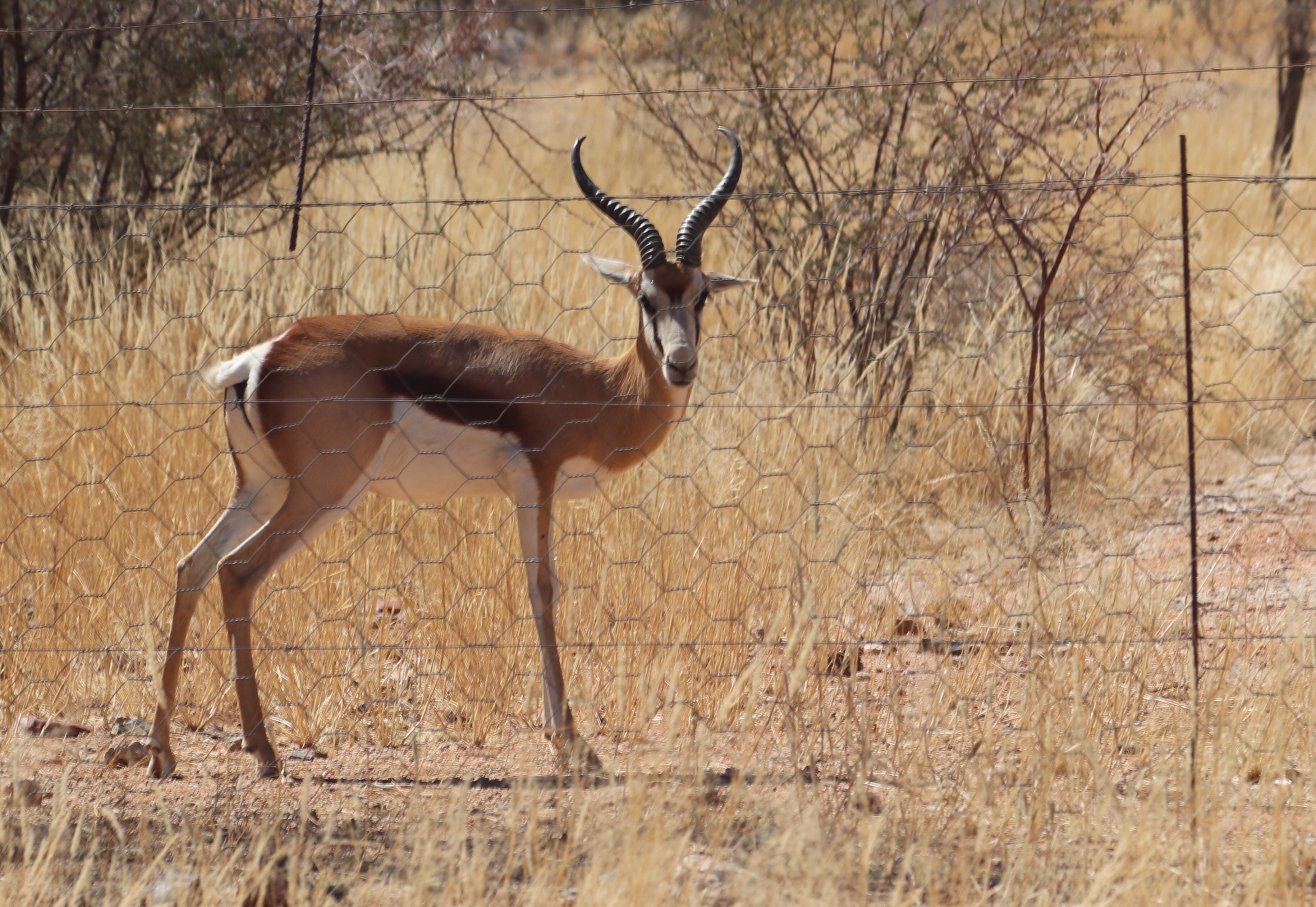 We stopped in a town called Bethanie for gas, and a bum break. This town was founded by the German Lutherans and has more churches per person than any other town in Namibia. The people here are San Bushmen and their descendants. They are very distinctive looking with high cheek bones, and a much lighter, and more yellow colour skin. Their ancestors were generally smaller than other tribes and that carries through to today. Here is a picture of a springbok which I took while we stopped for lunch. These guys are all over everywhere (much like our deer but with nicer colouring), springing along. It’s not great, but I thought it was ironic because it’s behind a fence, but it’s us that are in the enclosure and it was in the open field.
