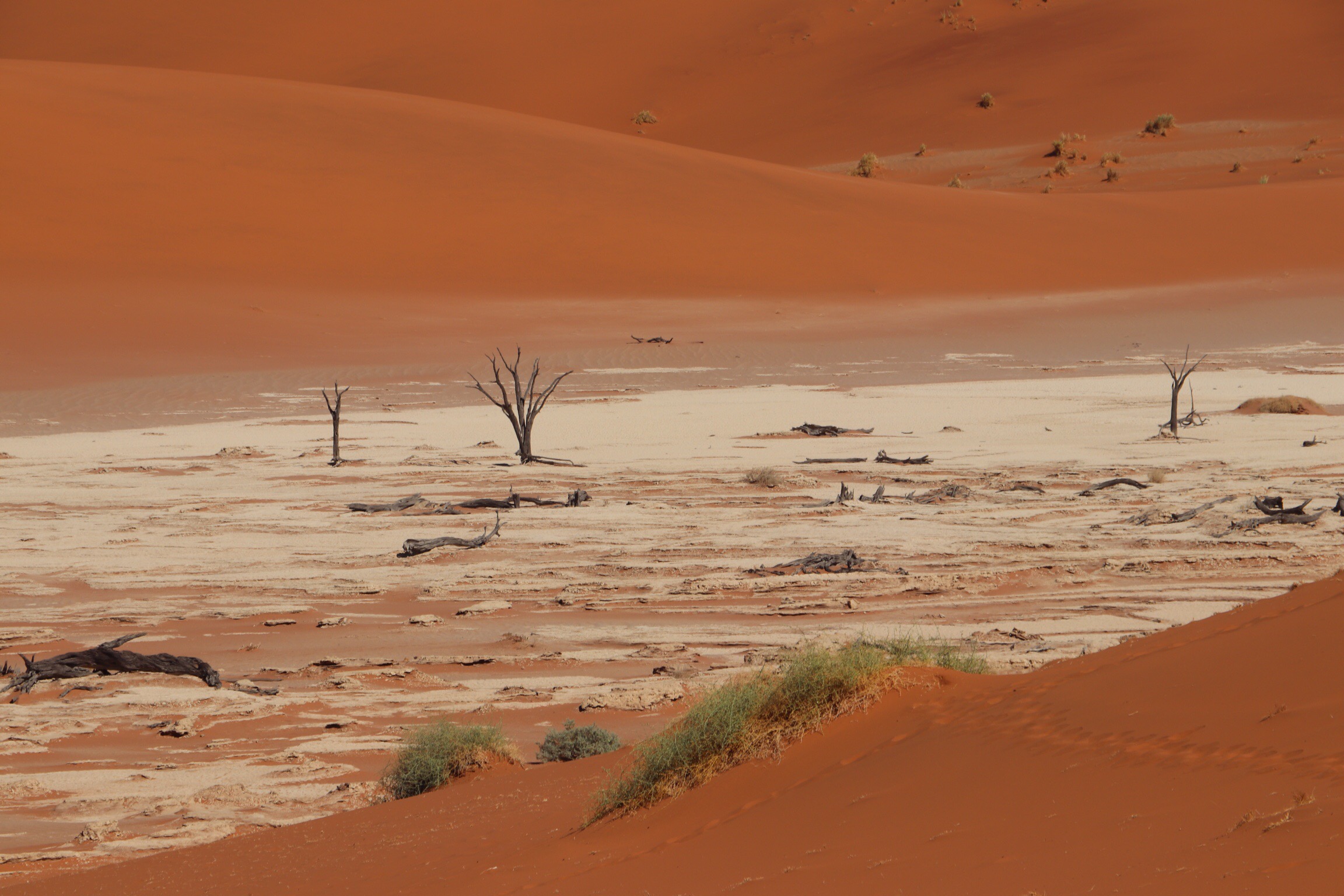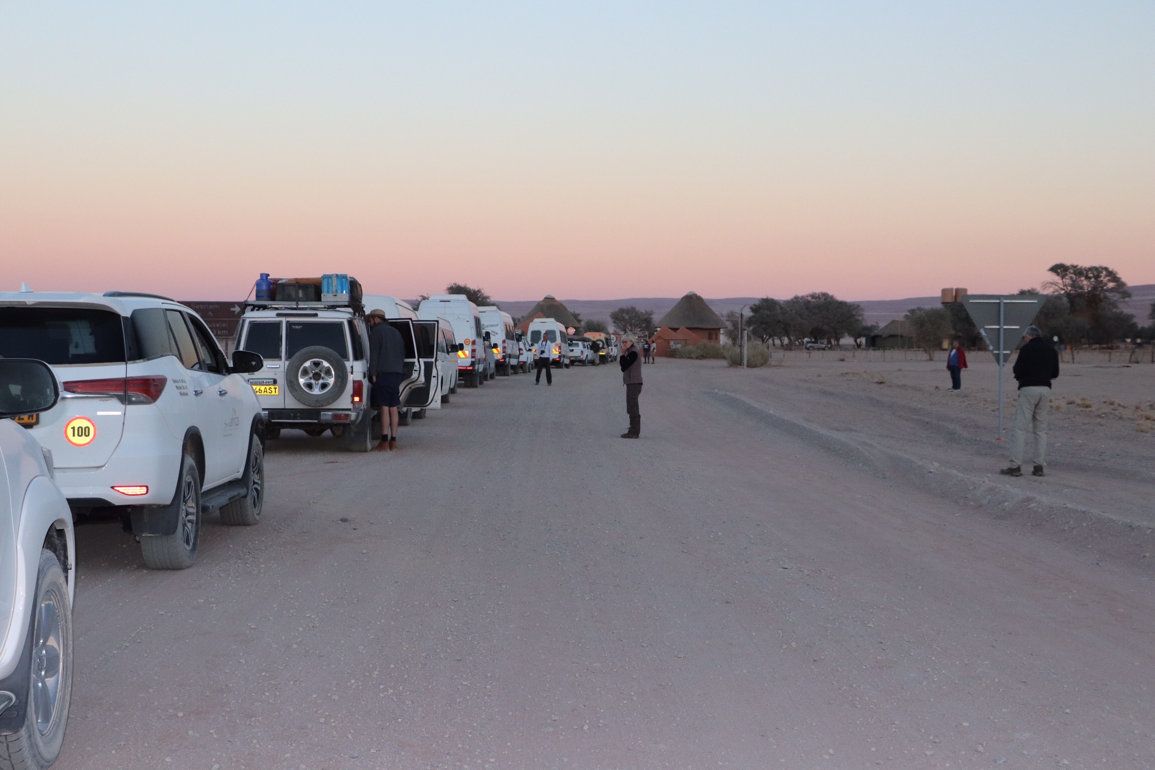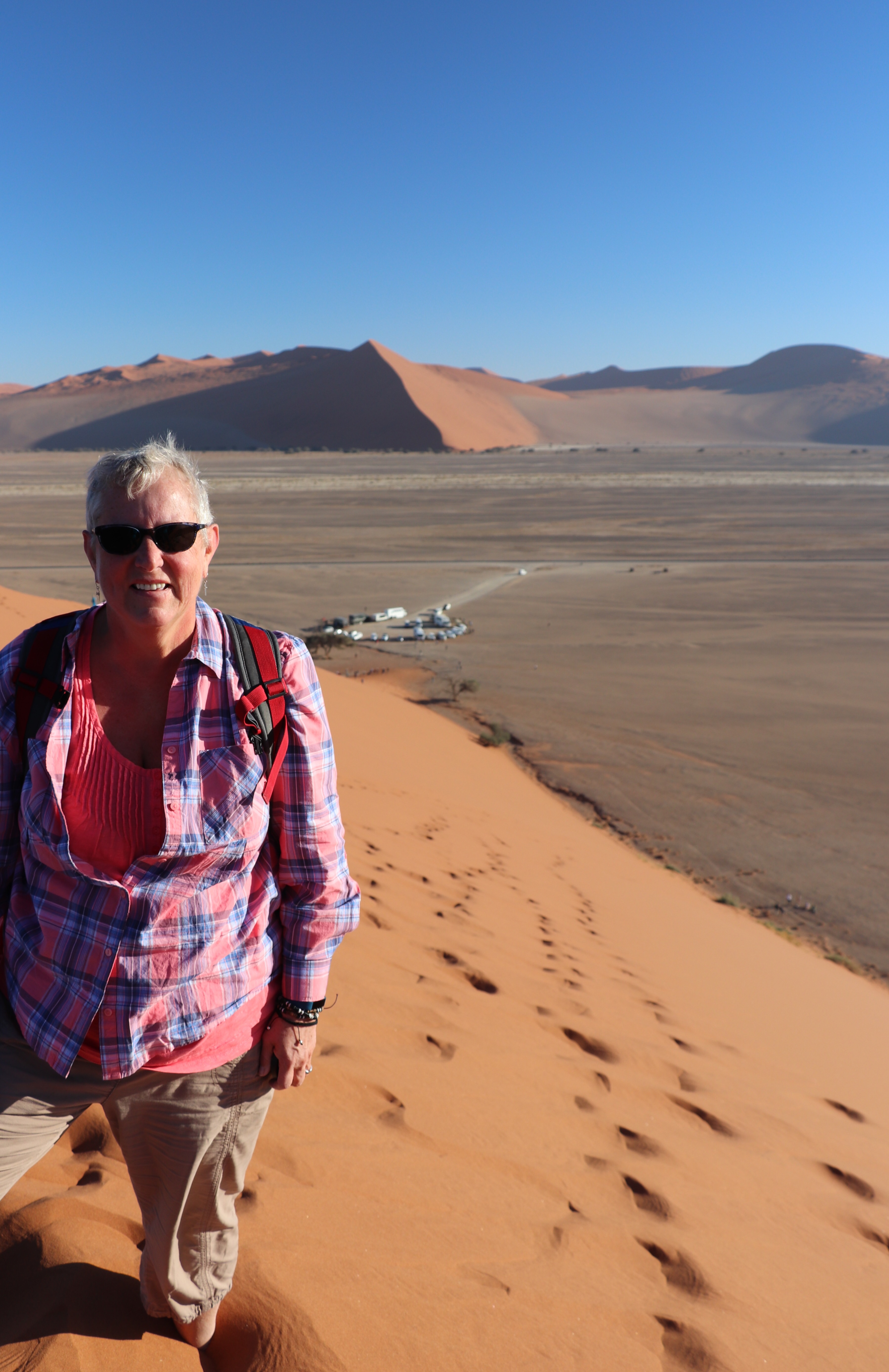 The first few nights of our tour have been just one-night stays and it has been hard to leave some of them without having had the opportunity to really appreciate their facilities. But we stayed two nights in Sesriem so that we could visit Namib-Naukluft National Park in the Sossusvlei area, (roughly translated to dead-end marsh) sight of these amazing huge, and old sand dunes. Our guide wanted to be in line when the park opened at 6:45 am so that we could get out onto the dunes before it became too hot and crowded, which meant a 4 am wake-up call. Ugh. But believe me by afternoon, we were grateful for the early start.