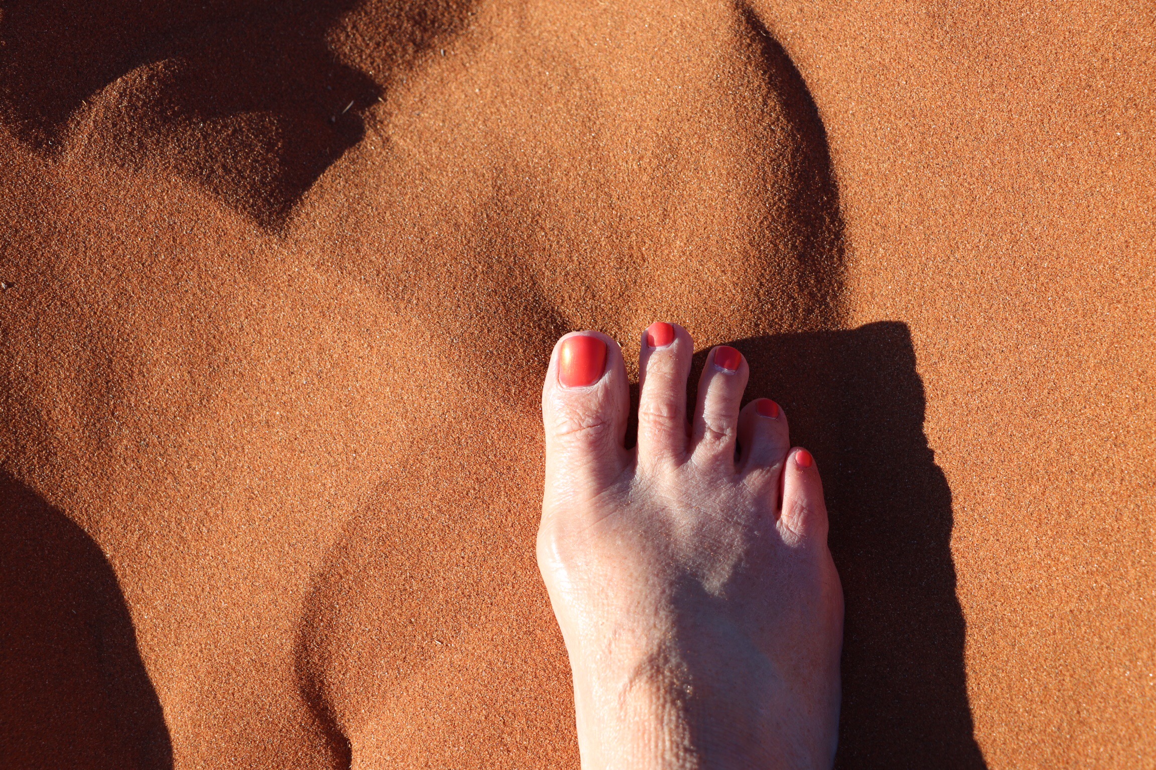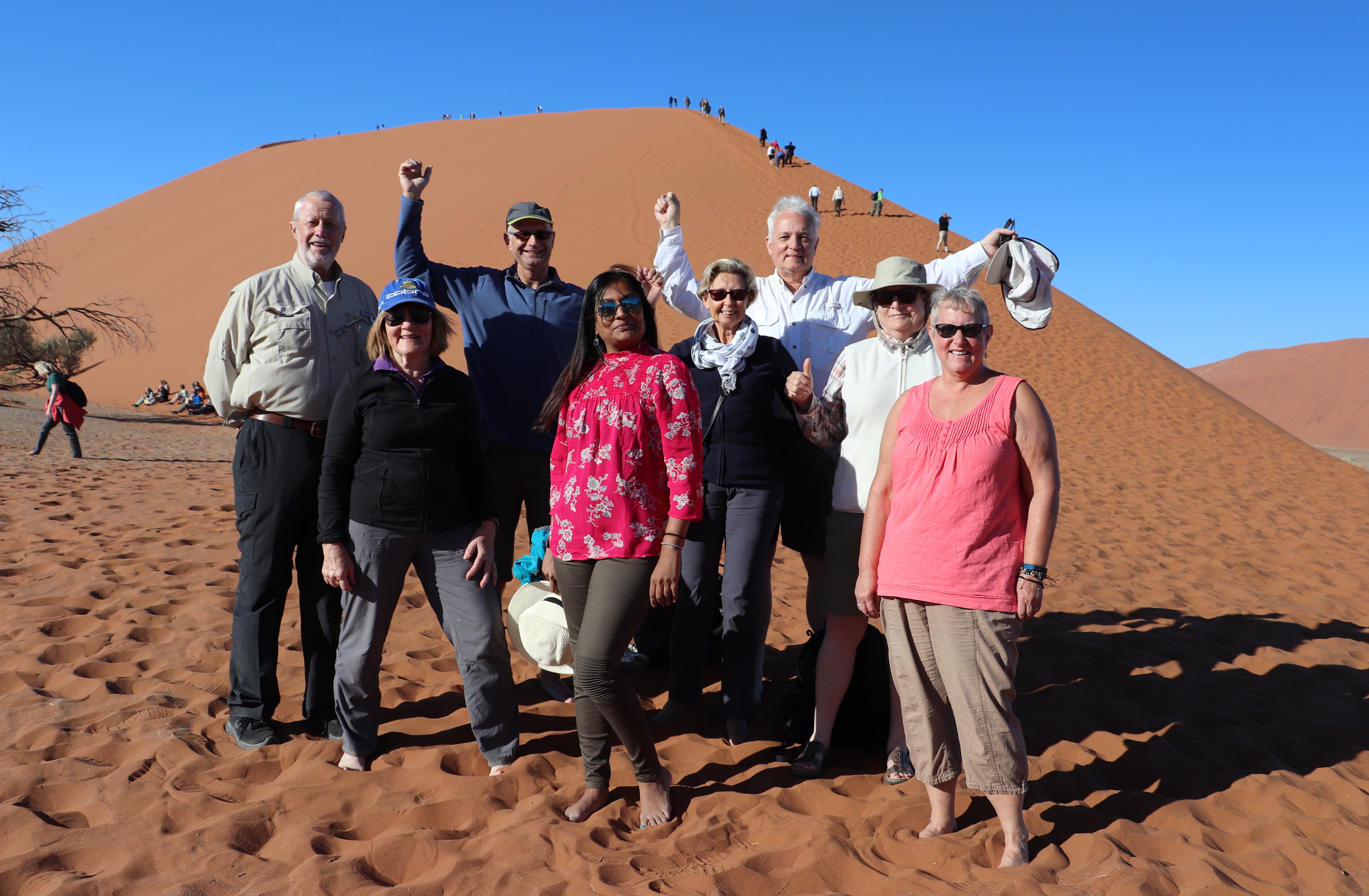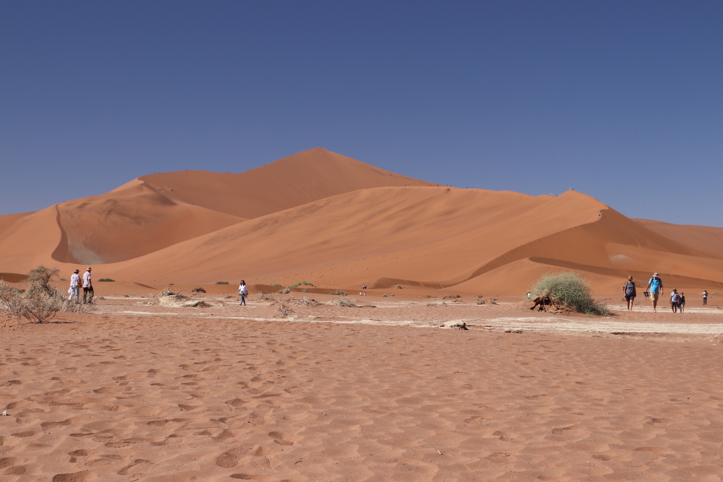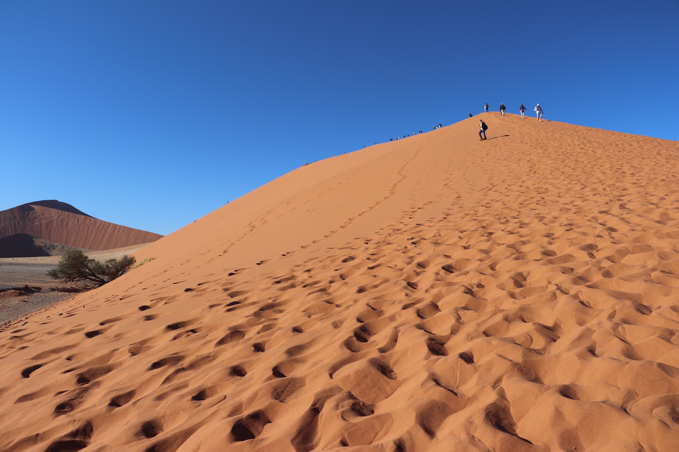 Our guide gave us some great advice about going without shoes to do our climb and to follow in someone else’s foot steps as we climbed. The sand was silky smooth and at this early hour, still cool to the touch. Imagine how difficult it is to walk on loose sand, and then add a high incline! And we’re talking 560 ft. And walking in the footsteps of someone else really did help. The first part of the trail was quite broad, but as we climbed the path became narrower and passing people coming down was a little challenging. You didn’t want to get off the path because the sand was loose there, and the slope was pretty significant. It wouldn’t have taken much to tumble all the way down to the valley floor. I didn’t climb all the way to the top. I knew that I had more walking through sand to do and didn’t want to completely ruin my SI Joint. Several of us rested on a bit of a plateau, took pics and then headed back down. Two of our group made it to the top and get top honours. When we returned, our guides had tea prepared for us. They’re taking such good care of us.