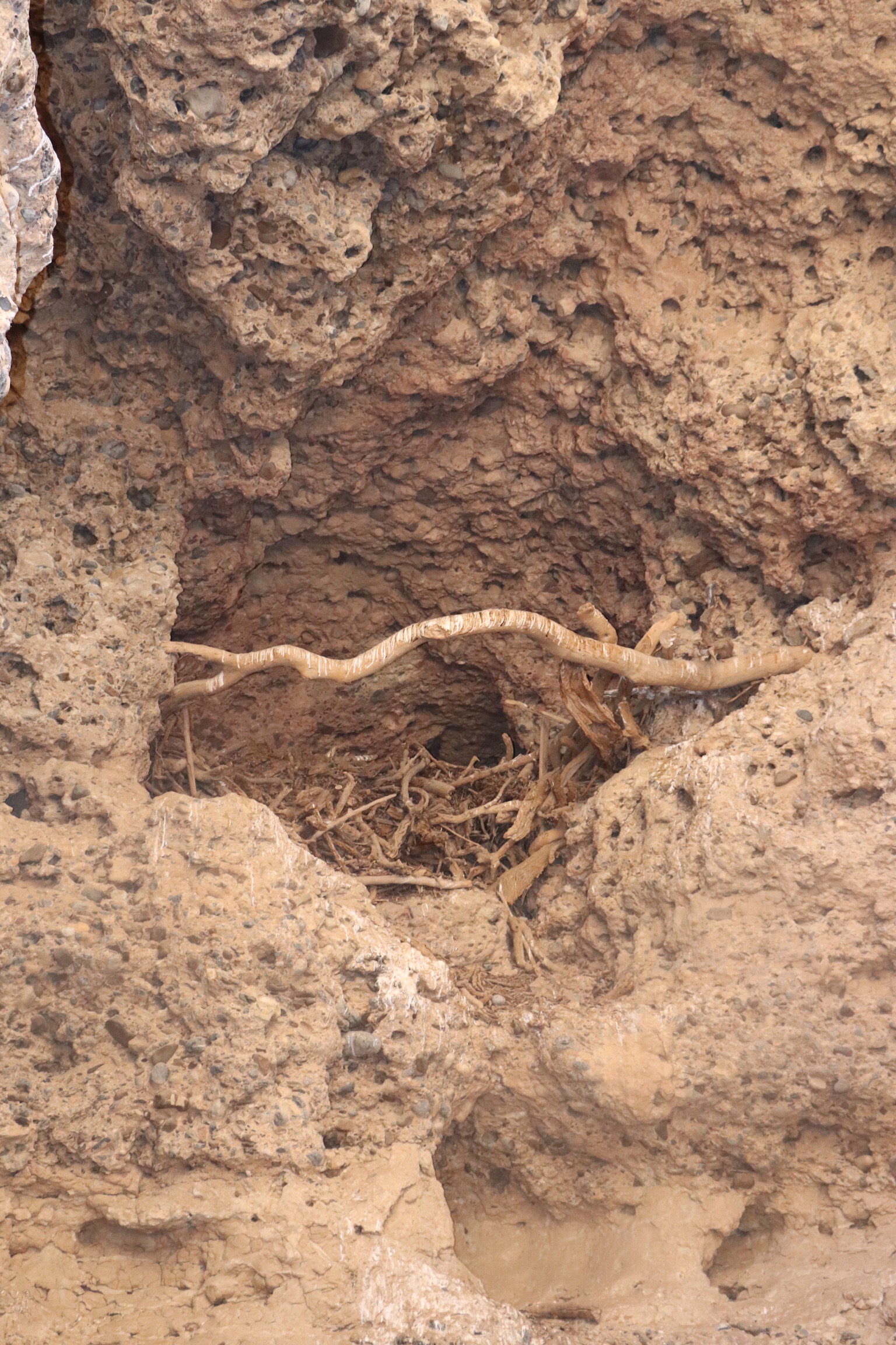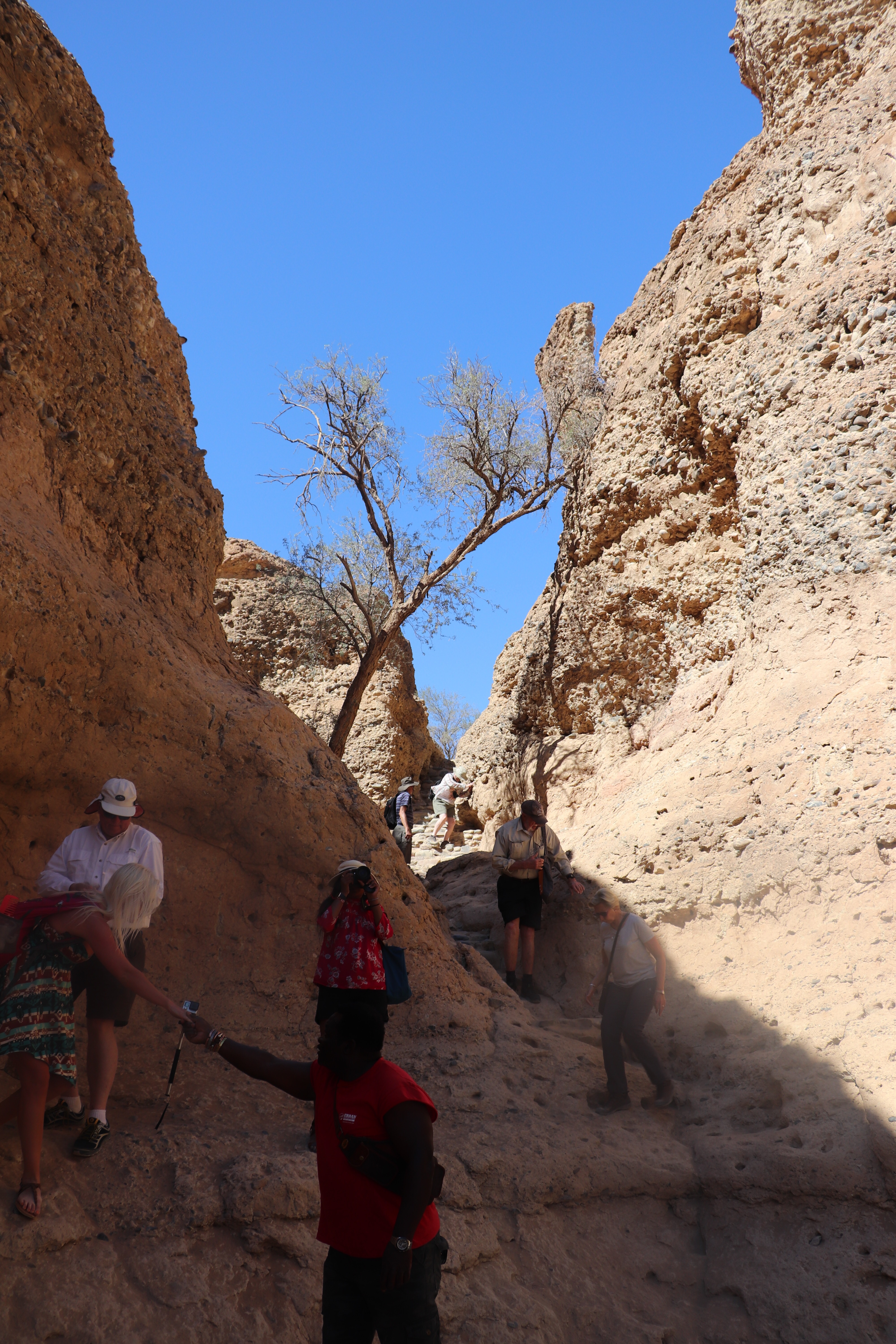 Our very resourceful guide managed to secure our return to the parking lot with a drive-by some other areas without having to wait for another lift. We left the park to have lunch just outside the gate and then re-entered to head to the 3 million year old Sesriem Gorge. Sesriem means “six belts” in Afrikaans and the gorge was named Sesriem because it took 6 knotted belts to reach down to the bottom of the gorge to get water from the river bed. We were able to get down into the gorge over some pretty rough steps, with the able assistance of Innocent, to walk along the floor of the gorge. The gorge only floods every 8 – 10 years and it’s overdue so we were hopeful that it wasn’t our misfortune to be there for the next instance. But it was shaded and a much-appreciated cooler temperature, and a very enjoyable walk. The erosion of the sides of the canyon over the years, showed layer after layer of flooding and placement of rocks.