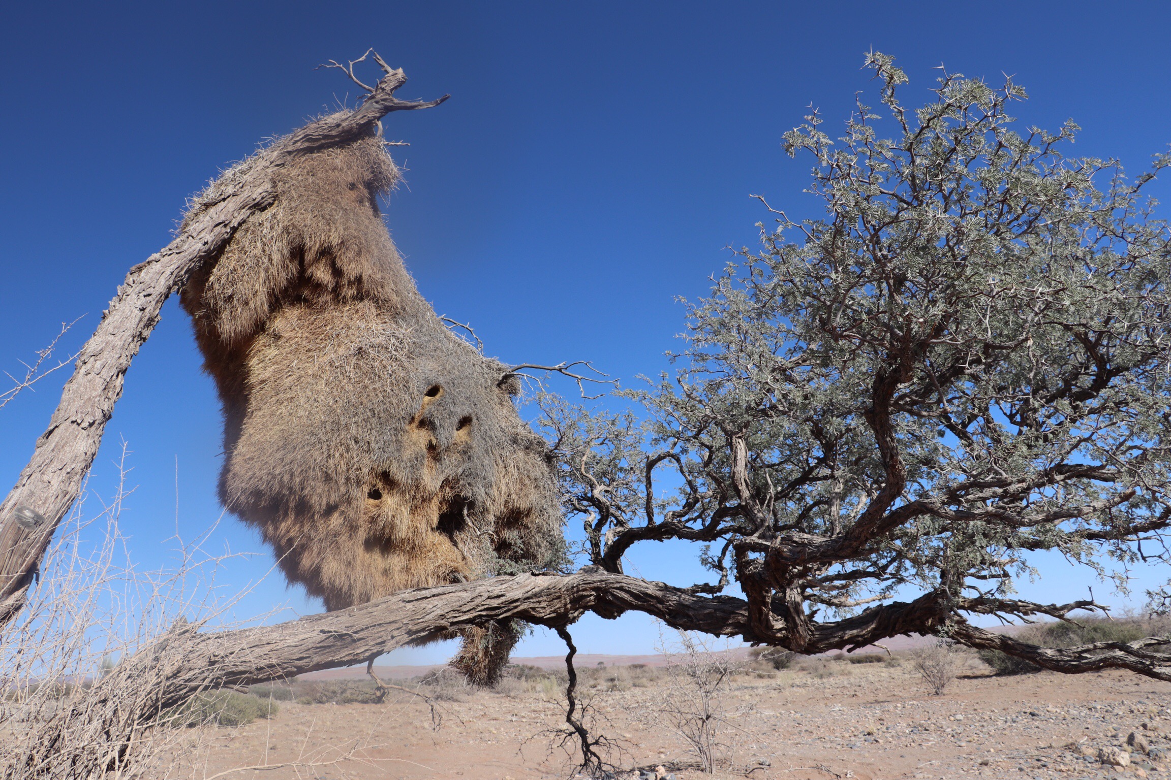 Sandile pulled over for us at one point to have a closer look at this huge “growth” in one of the Acacia Trees. This is one of the largest Social Weaver’s nest we’ve seen. These little Sparrow-like birds build their nests collectively from grasses and it builds and builds. This one is likely 15 – 20 years old. Underneath you see the individual entrances.
