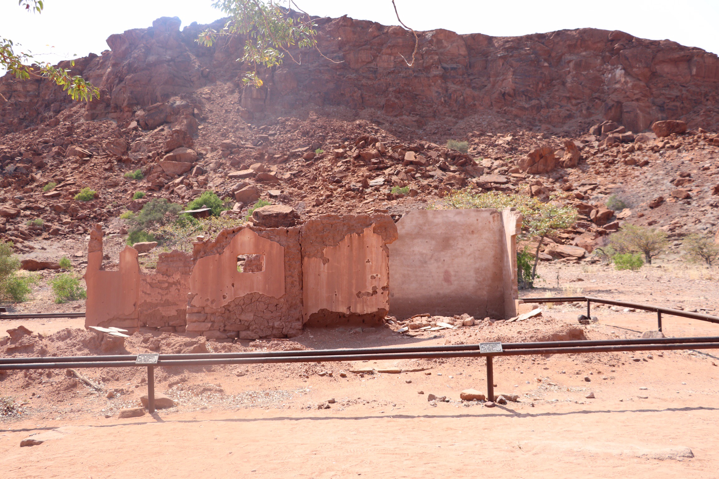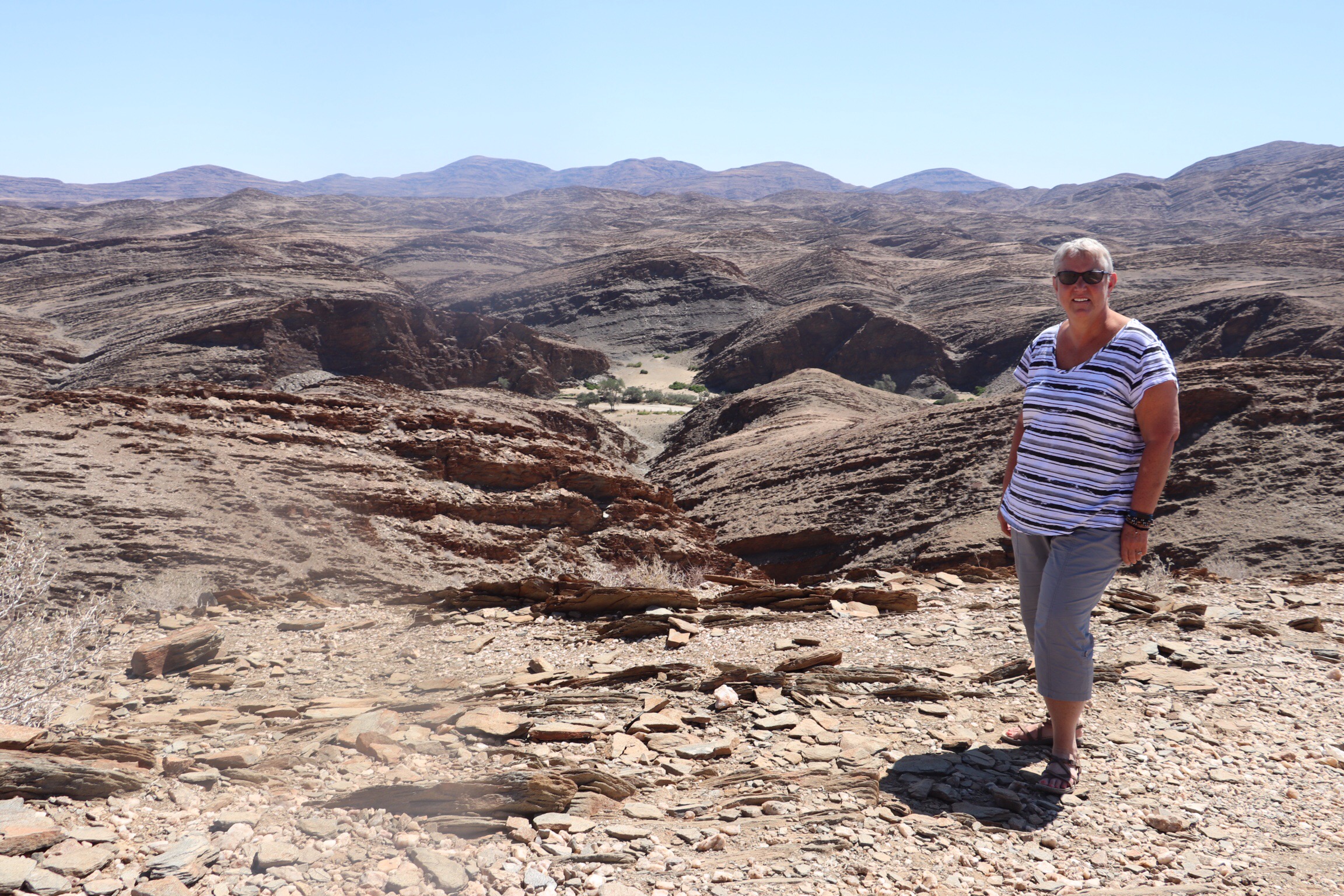 We had to hike a short bit from the visitors centre out to the site and then scramble over some rocks to be able to view the various pieces of sandstone, now resting on the valley floor or among other rocks. They also had built some metal viewing platforms. Along the way a couple of our travel companions fell, one of top of the other. Everyone scrambled to help, especially our guide as it appeared the one on the bottom might have hit her head on the rocks. Finally this very practical Aussie spry grandmother said, “OK then, who should get up first?” Everyone started breathing again, and after their limbs were untangled their injuries were assessed. Some scrapes and bruises but thankfully, no broken bones. The episode proved to remind us how far from any services we were. Our guide said later he was already thinking quickly about how we’d evacuate anyone with any broken bones, etc. He has already had to rescue a passport left in a safe back in southern Namibia, and arranged to have it brought up to meet us in Windhoek. I’m sure he was relieved not to have to challenge his logistics skills once again.