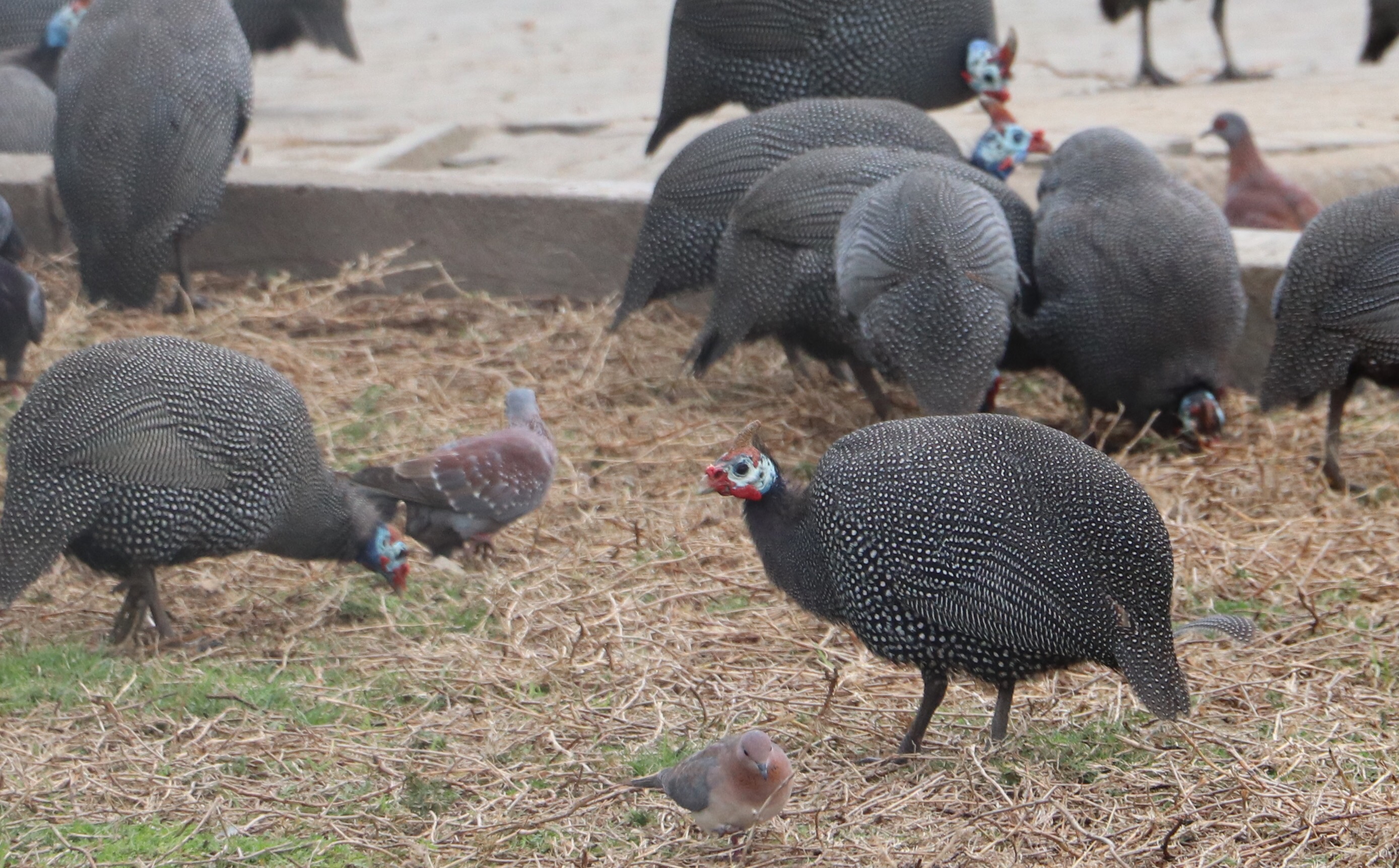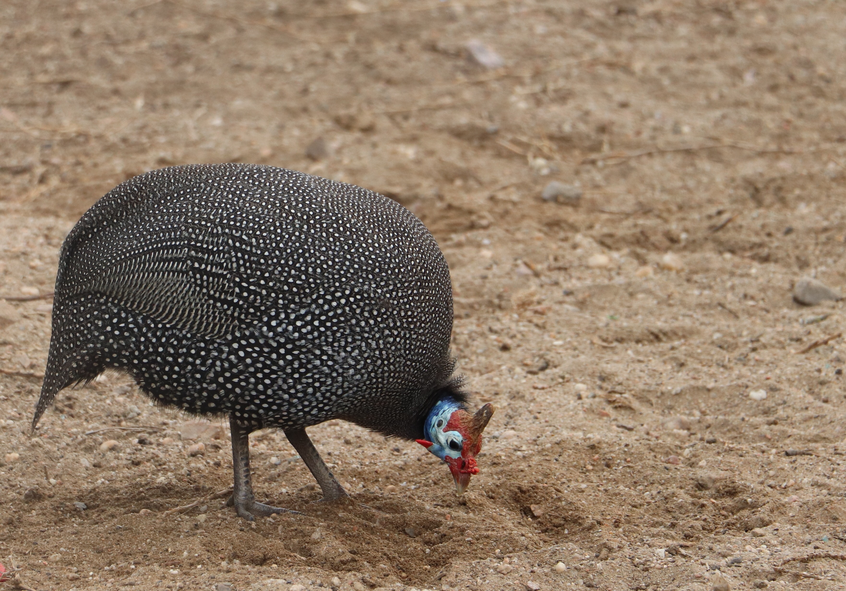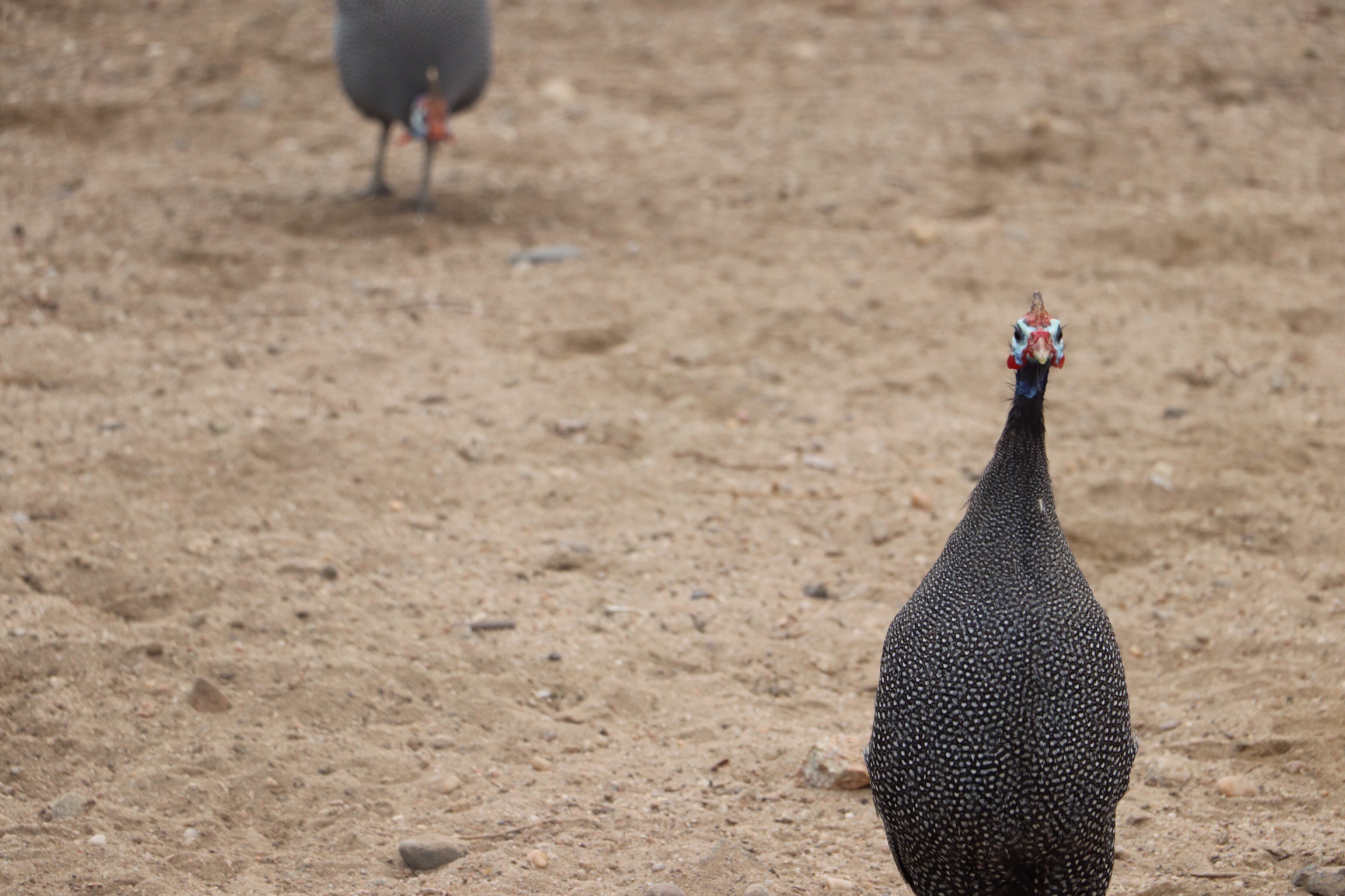 We headed toward the market area to see what they had for sale there, and midway there we encountered the guinea hens that we’d seen yesterday on our way in. It was quite funny yesterday to see them scurrying across the road, obediently in a pedestrian walkway. Today they were busy scratching at the earth looking for their dinner and didn’t take any notice of us.