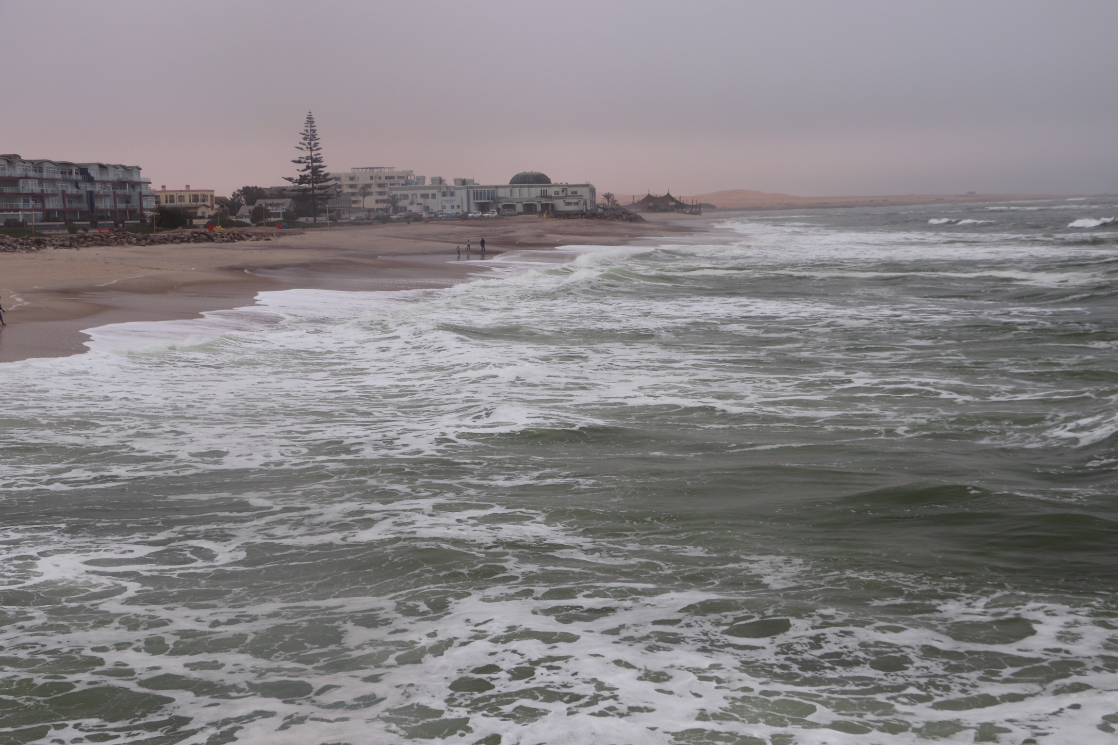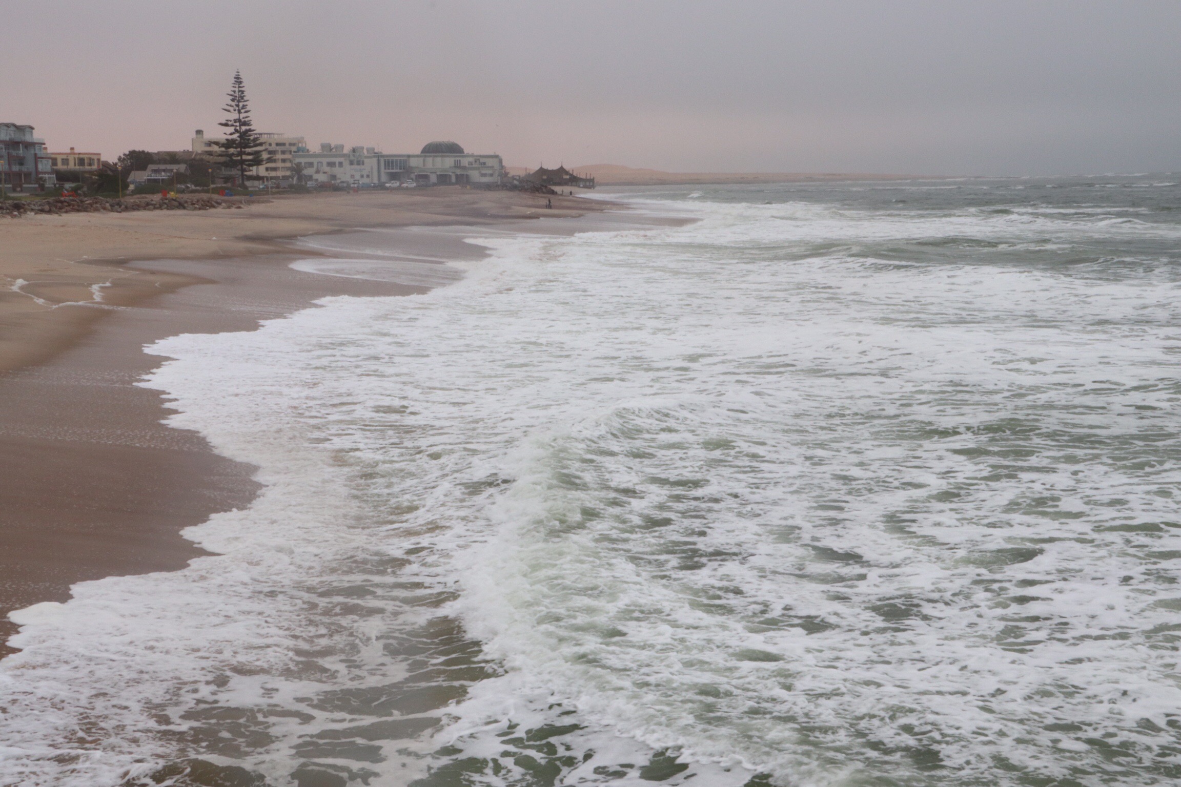 As I mentioned yesterday, Swakopmund is a beach town along the “Skeleton coast” of Namibia, so-called because of all the ship wrecks that can be found here. The coastline is unprotected from the Atlantic and its storms and the water is cold the whole year. It is now winter and cool, so the town is quite quiet, but it looks like it would be hopping with beach goers in their summer months.