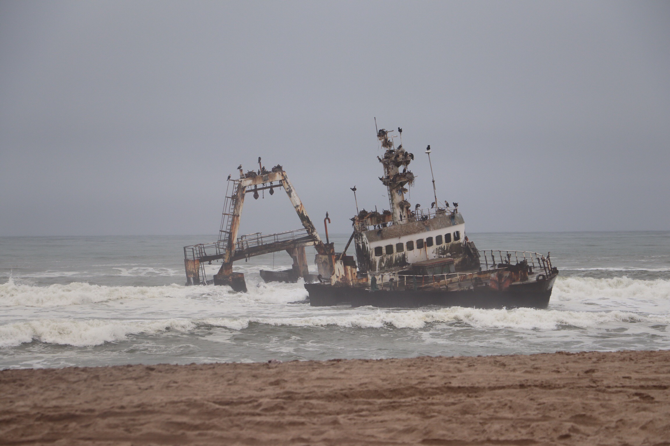 It was so great to get back to the Atlantic, but a bit of a shock to the system since the temperatures were quite a lot lower and it was foggy and overcast. Just outside the industrial city of Walris Bay, we passed by the site of what will be the largest uranium mine in the world when it’s completed. In Walris Bay we did some shopping and stopped at a park by the ocean for our picnic lunch of barbecue chicken and salad. There were flamingos in the bay, but they were different than the ones I’d seen in Florida and other places. They weren’t as pink except under their wings.