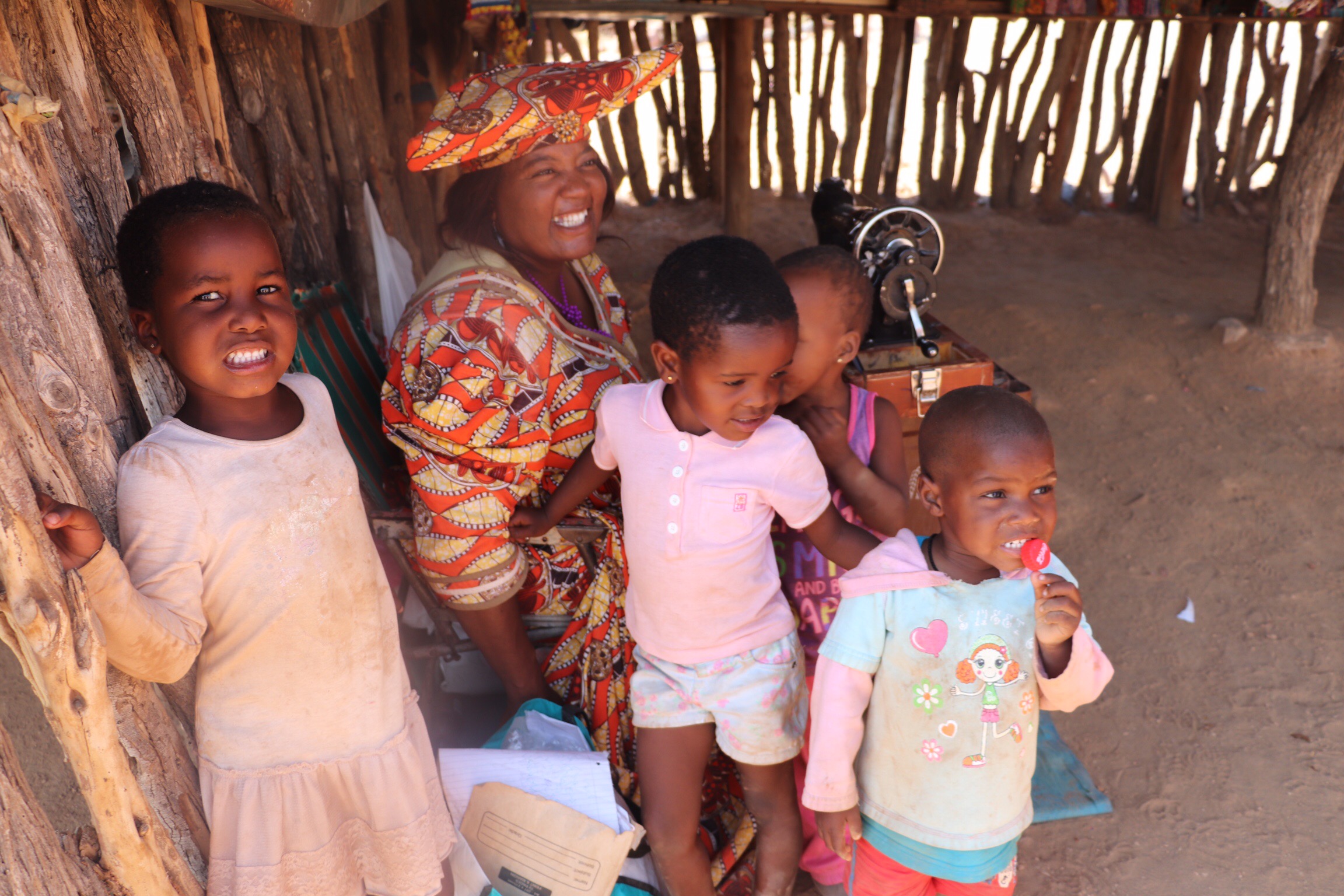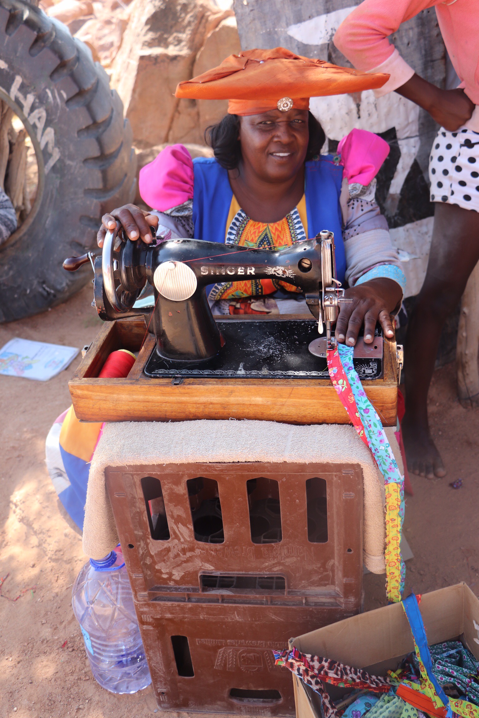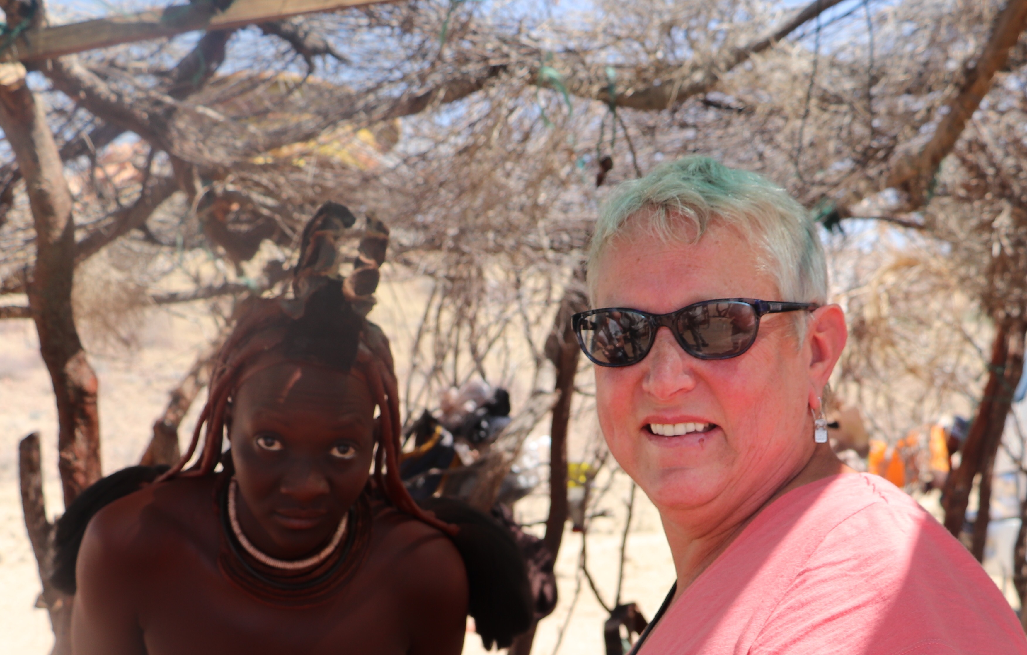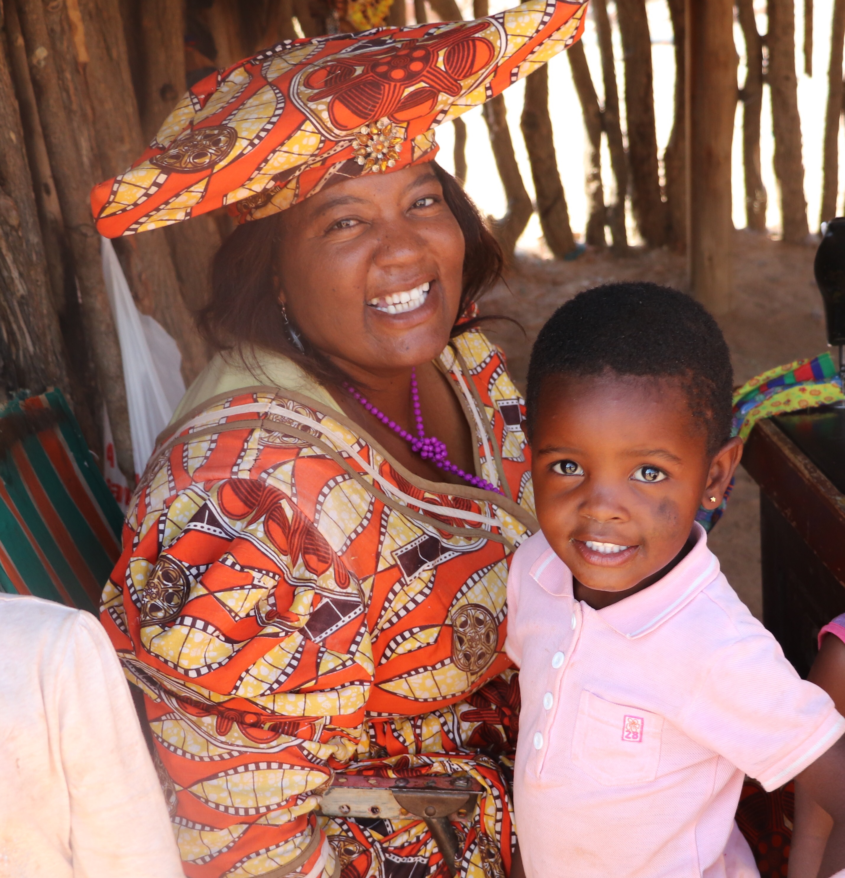 Next it was on to the Hereras Market. They were much less aggressive, and happier lot. They cheerfully posed for all our pictures without expecting payment, and they were selling little dolls made up in dresses like themselves.I got chatting with one of the young Herera women dressed in traditional bright dress and headgear to discover that she spoke perfect English and was home visiting her family on break from university in Windhoek. She’s in first year studying for a degree in logistics and transportation. Another was on crutches and showed us her leg had been amputated just below the knee, and we were told that she had been bitten by a puff adder snake and had to have the leg removed. It was a colourful and interesting afternoon.