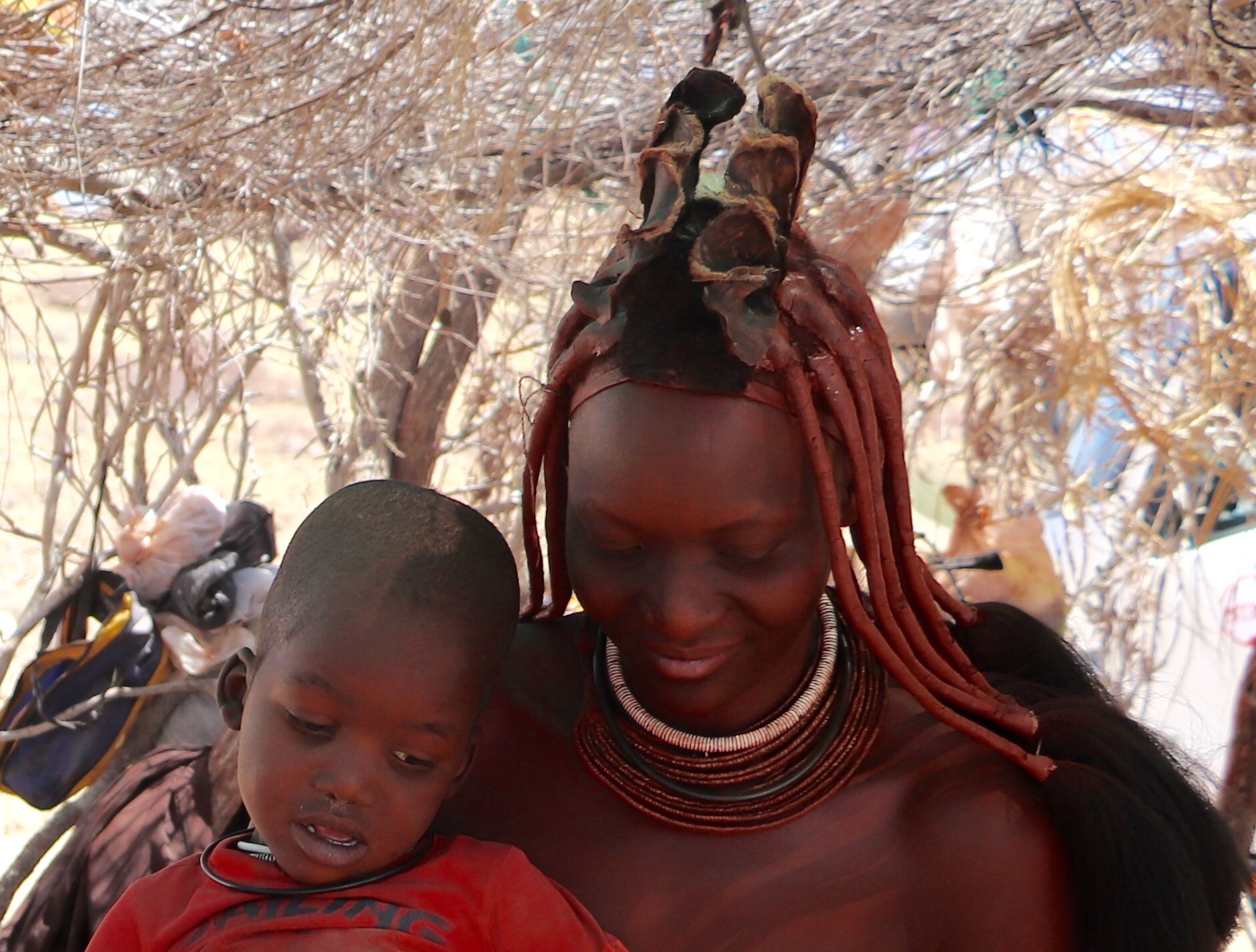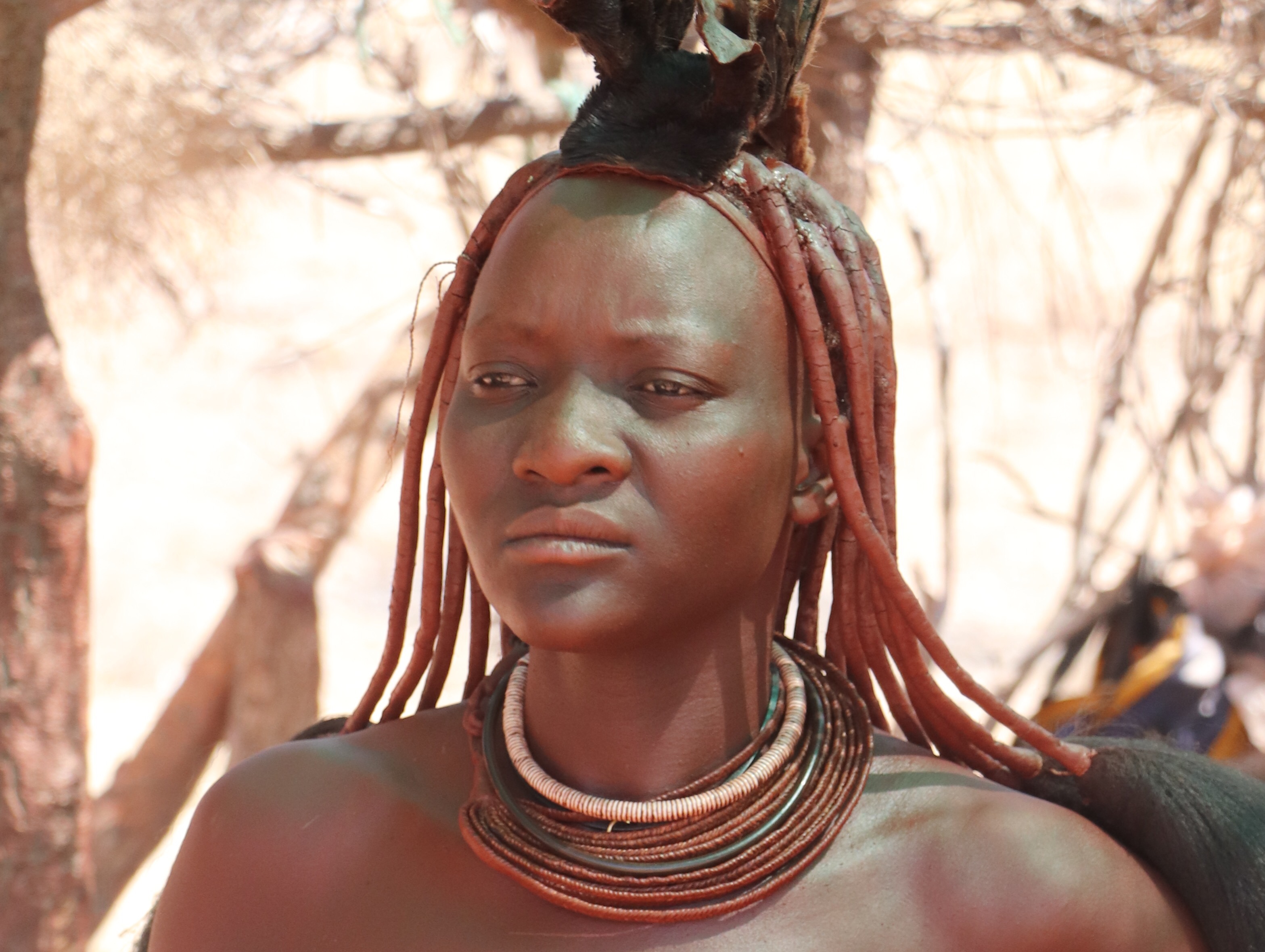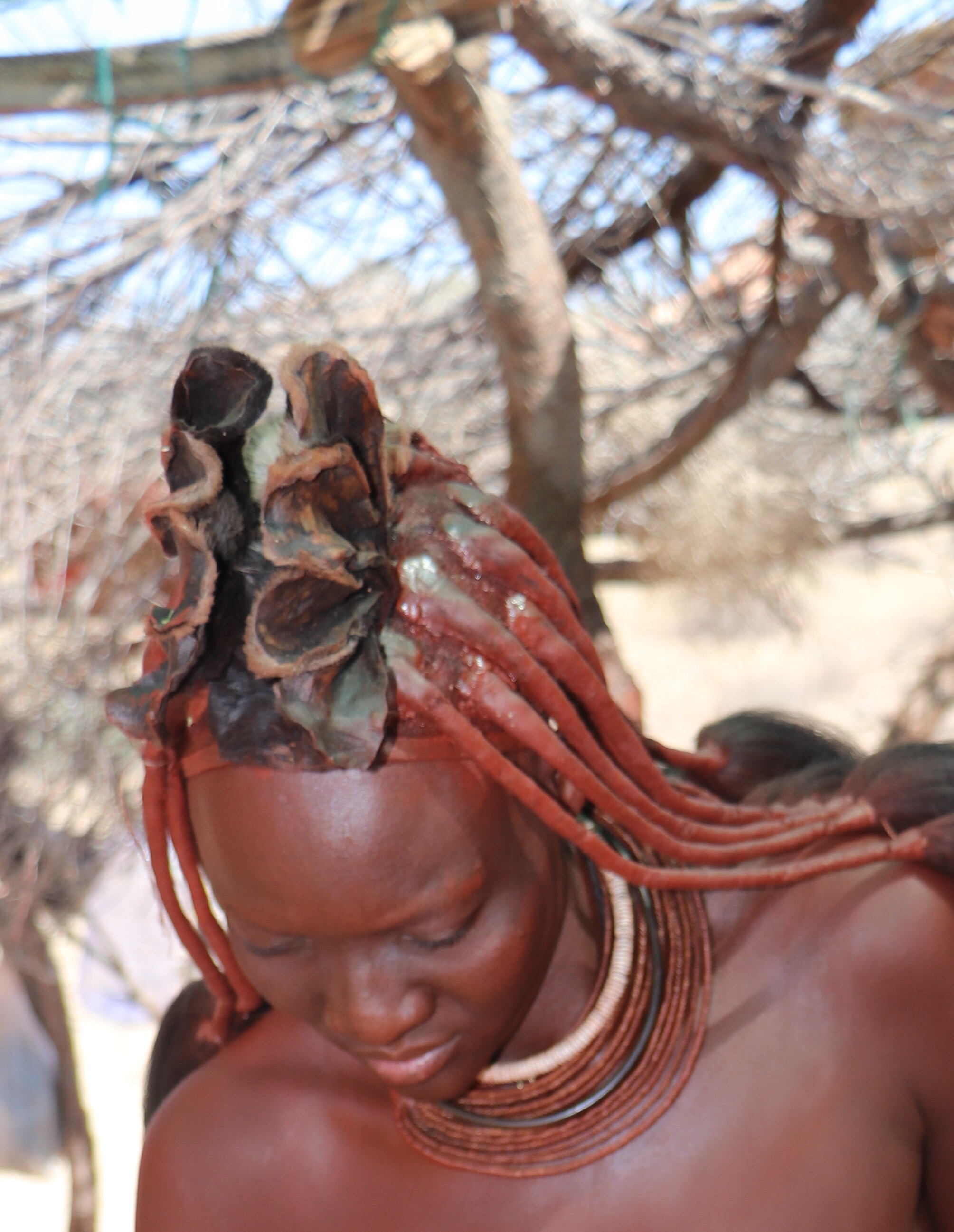 A subset of the Herero people went in the opposite direction. The Himba are cattle ranching people in the north near the Angola border, but the woman have come down to the tourist route to help augment the family income. The women have maintained their traditional costumes which includes elaborate hair and jewelry adornment, loin cloth and little else. The adornment and style of their hair tells the story of who they are, ie. if they are married, if they have children etc. They don’t ever wash their bodies or their hair and they use a concoction of ochre clay, with herbs and butter and smear it over their bodies to protect them from the sun, and they use it in their hair to cover their long braids. The young girls wear two plaits coming forward and the boys wear their’s long in the back. When the girls are about 15 they remove their front teeth because they believe they are more beautiful without them.