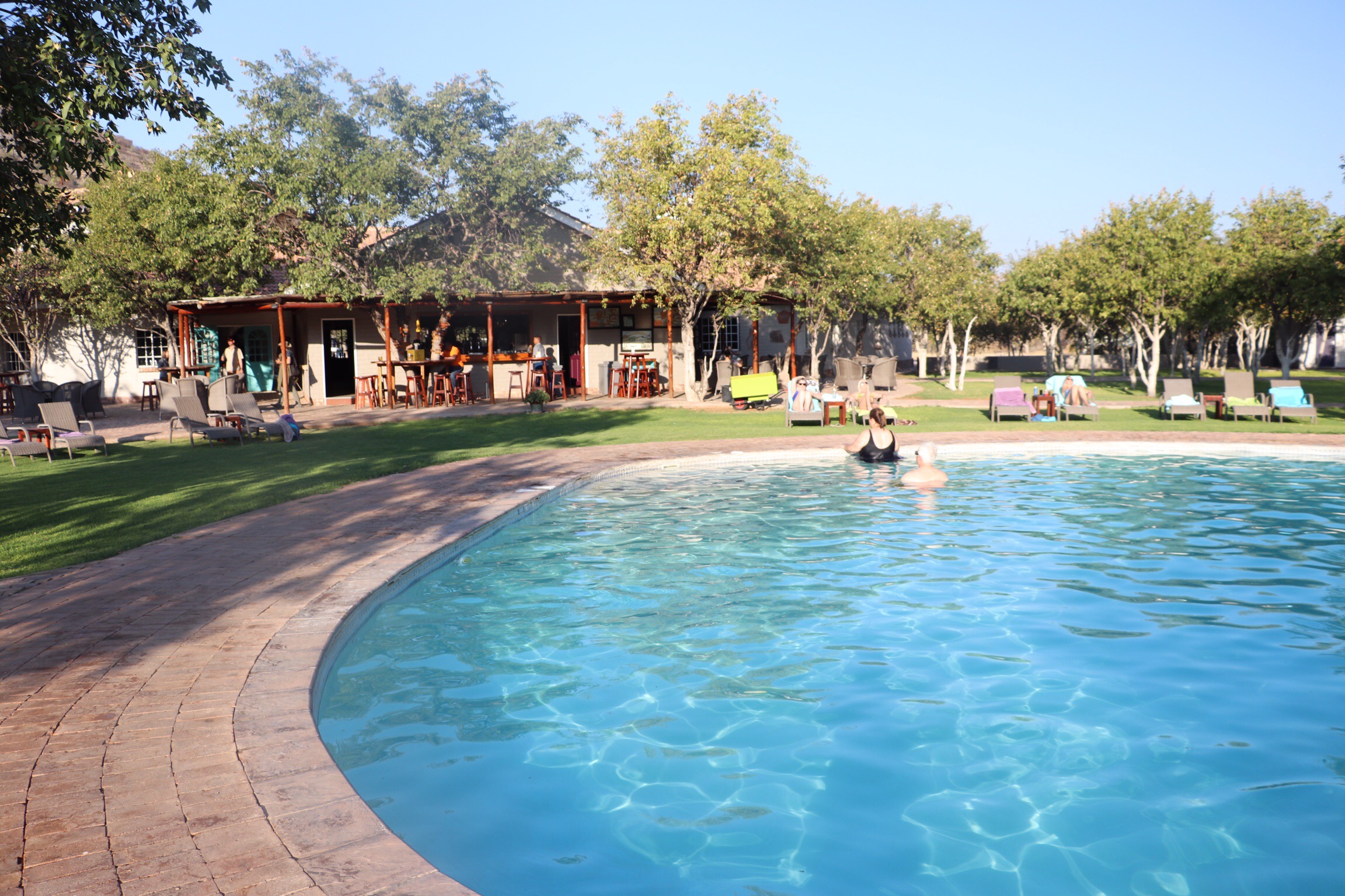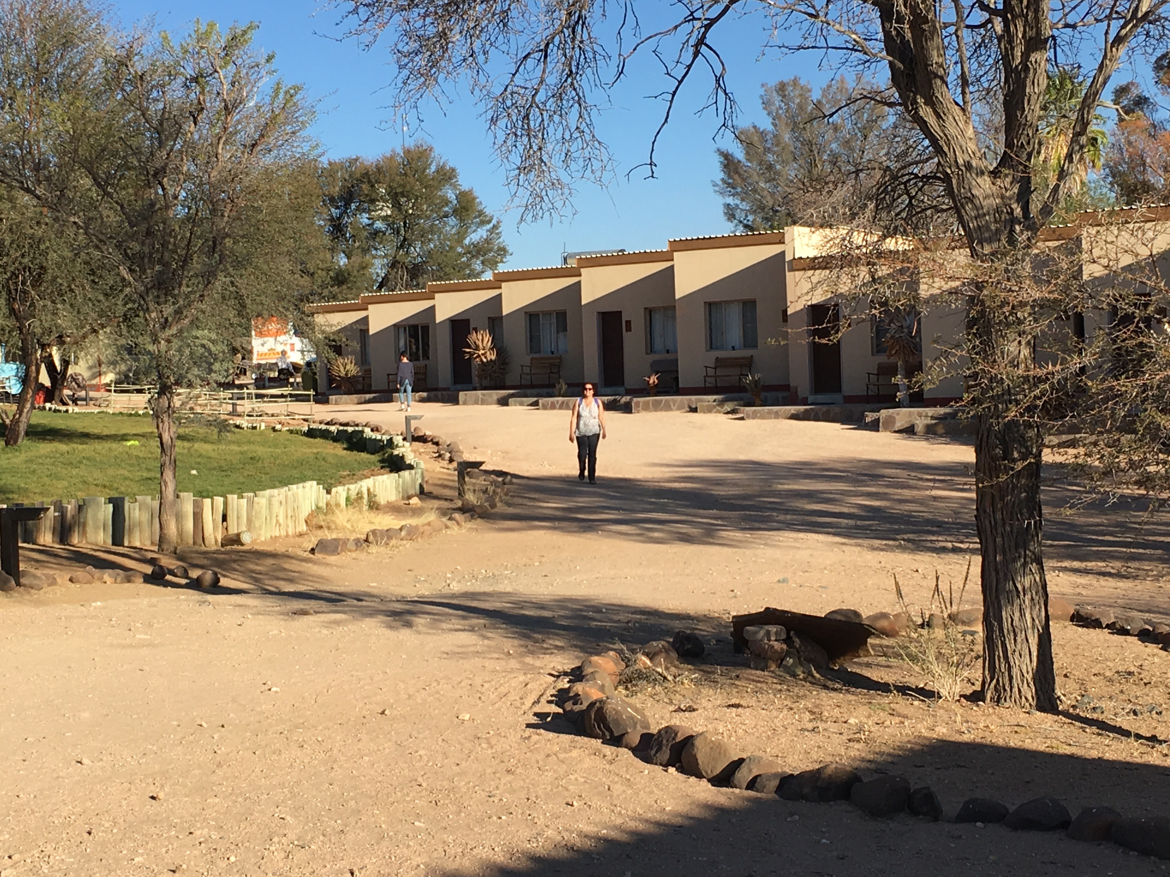 The landscape constantly changed as we travelled along through the Namib Desert, one of the world’s oldest deserts. I am sometimes reminded of Utah, and the SW USA. After a long and dusty day we arrived at our destination, a “guest house” near Sesriem, called Hammerstein Lodge. This was to be our home for two nights. It was quite a large compound with blocks of rooms. The facilities were great, with a large patio for enjoying sundowners, or a quick dip although the pool wasn’t heated. Because we know it’s going to cook right down at night, I haven’t felt the need to partake of the pool yet even though the days are hot in the afternoons. Nanci is being challenged to go swimming at every opportunity to one of our English travelling companions but so far she has resisted.