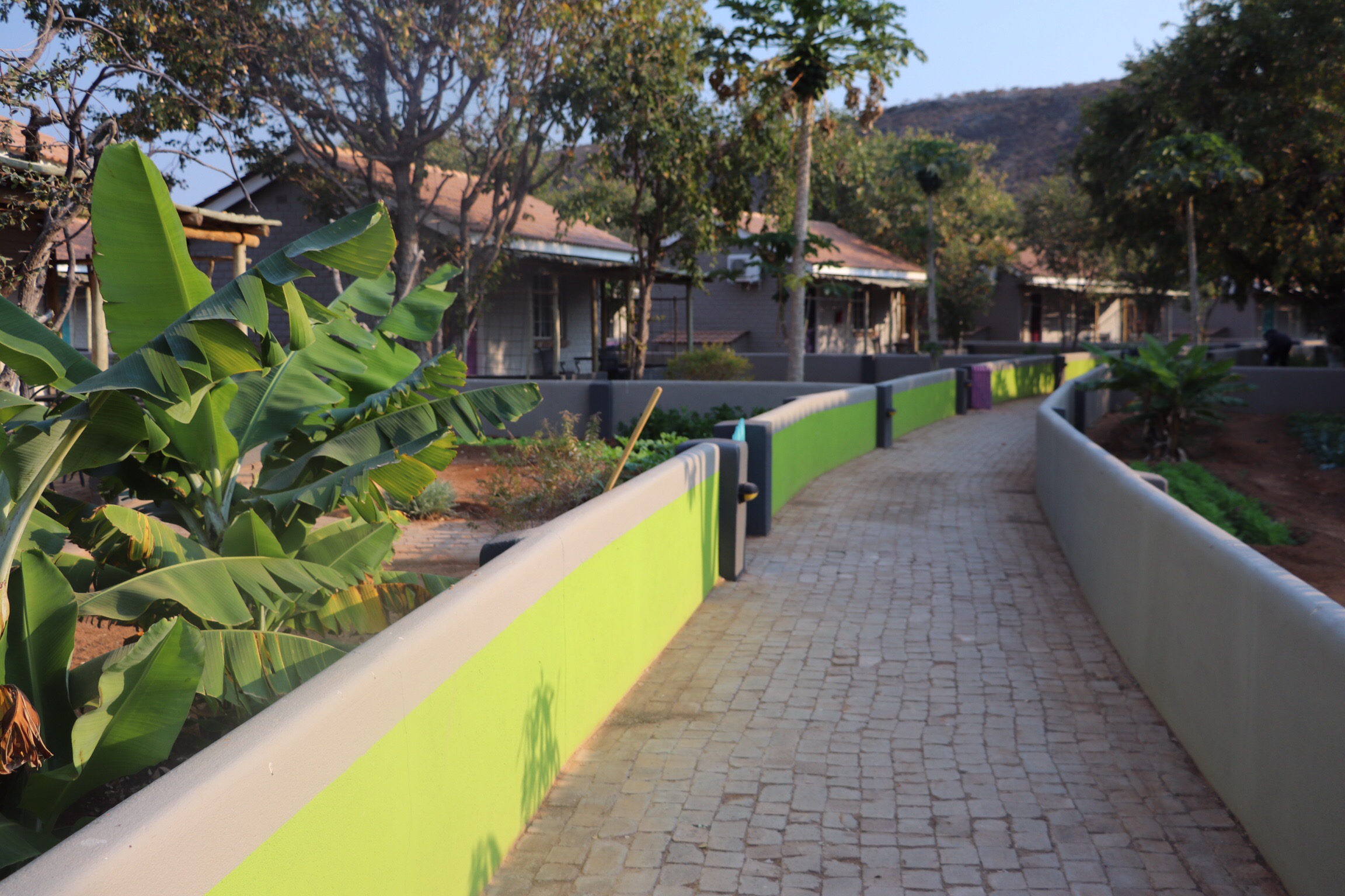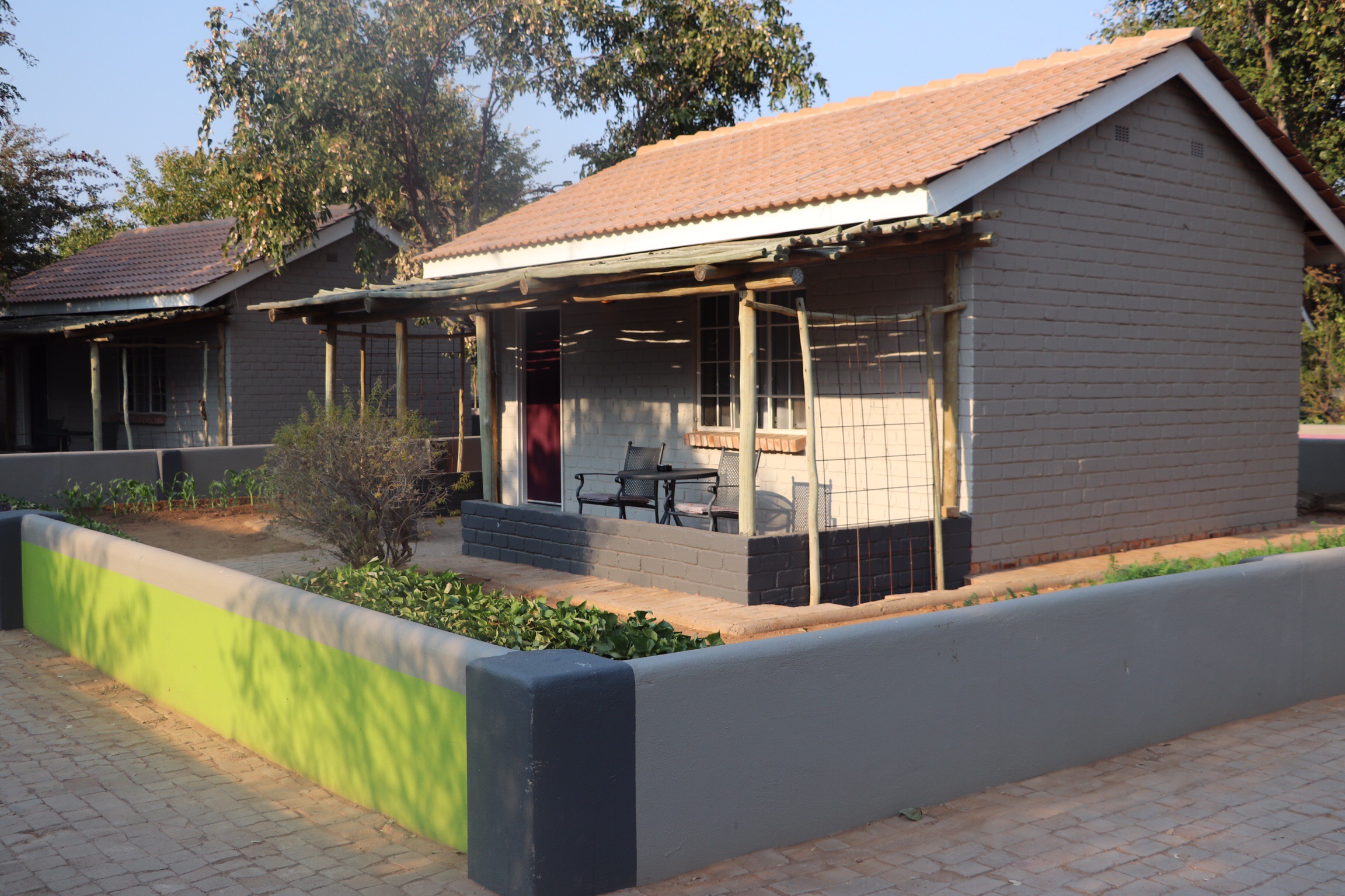 We arrived at our lodge in Damaraland and pretty promptly decided we didn’t want to leave. It was set up with little “houses” in concentric circles around a huge centre common garden and pool area, surrounded with short little fences, complete with gates. Each yard was planted with various lovely vegetables. (Corn, carrots, egg plant, peppers, cucumbers, etc). I was afraid we might have to hoe a row before dinner, but the tending of the gardens is left to staff, and the kitchen makes use of the abundant fresh veggies in their cooking.
