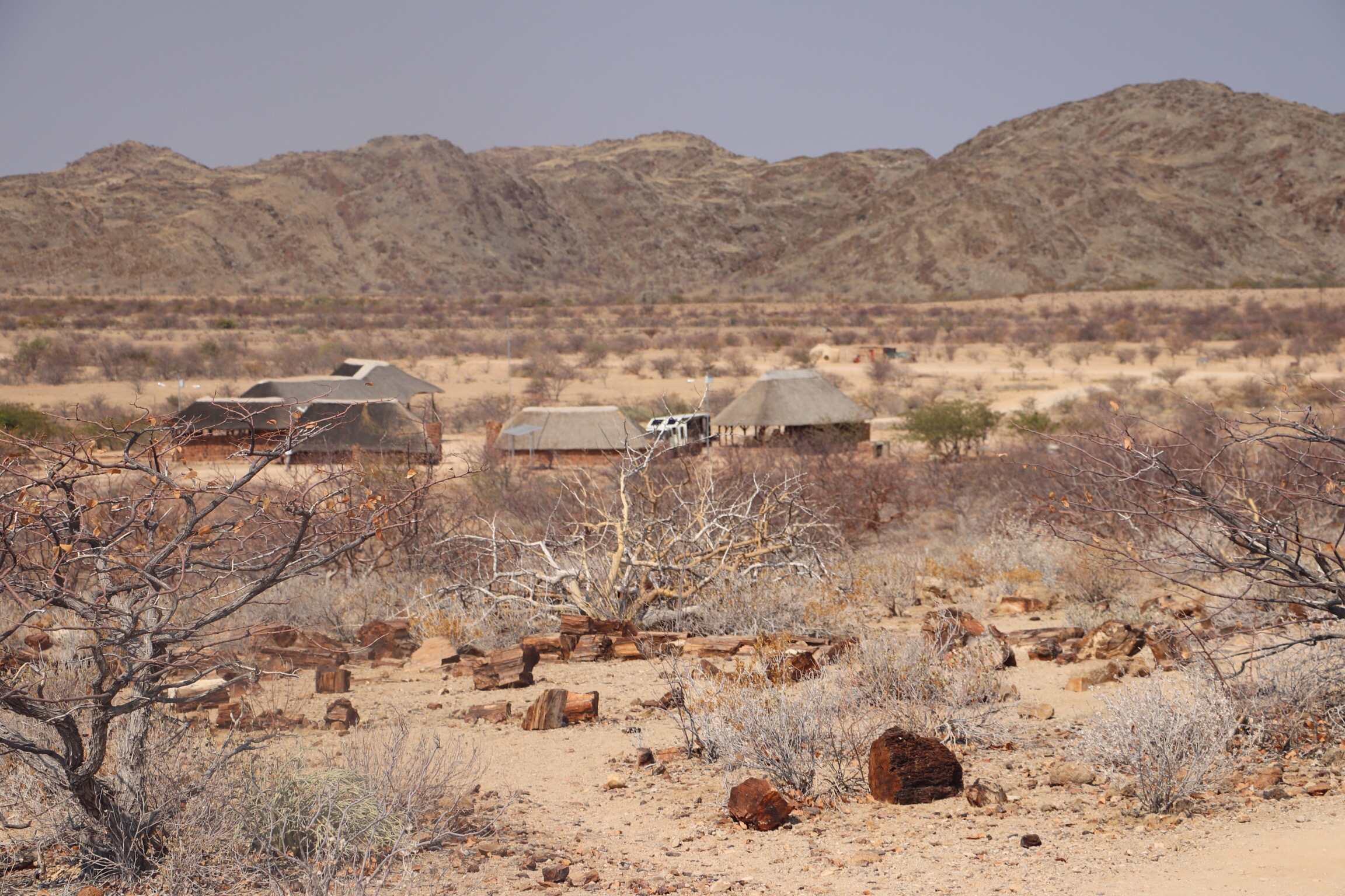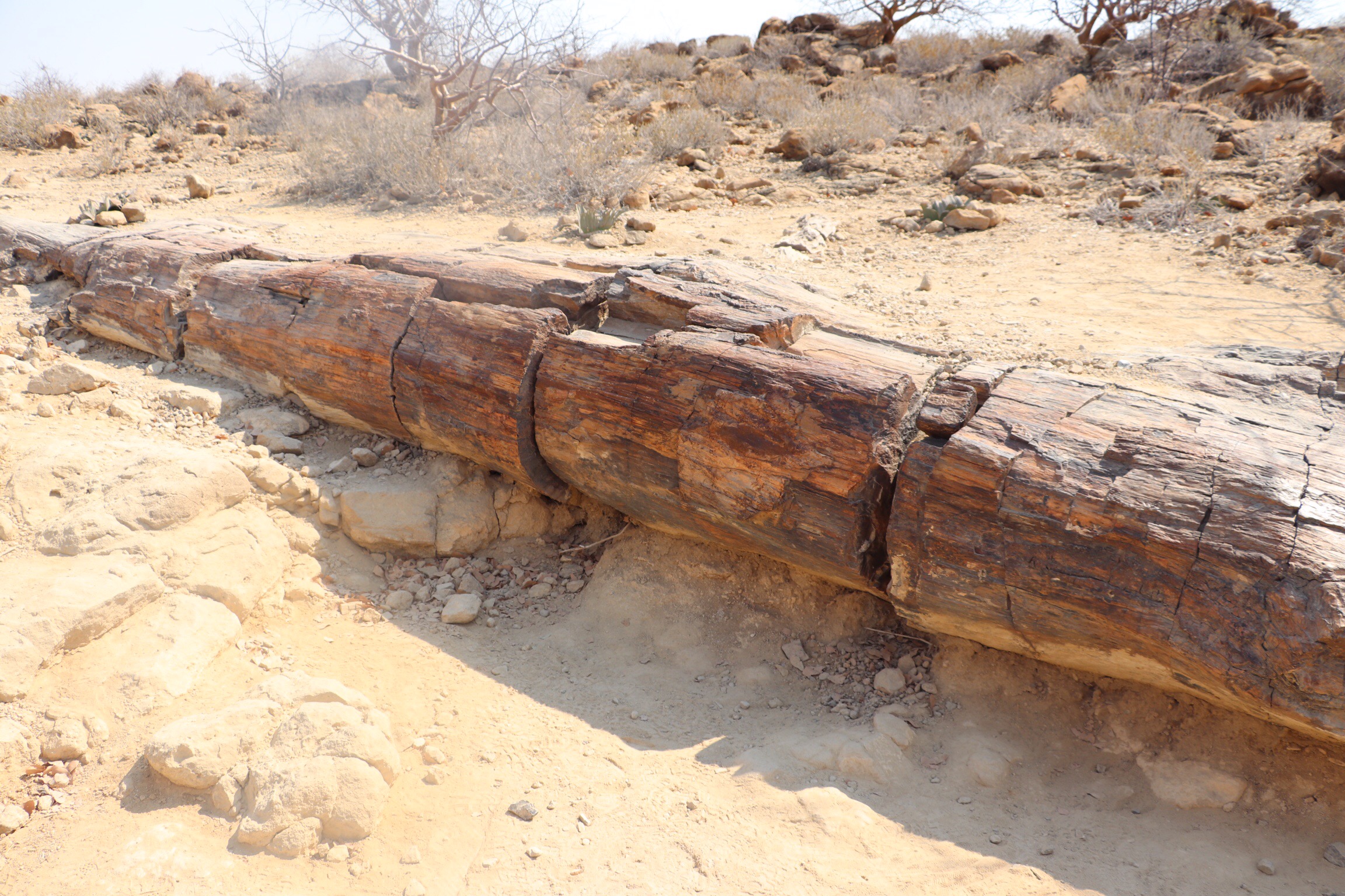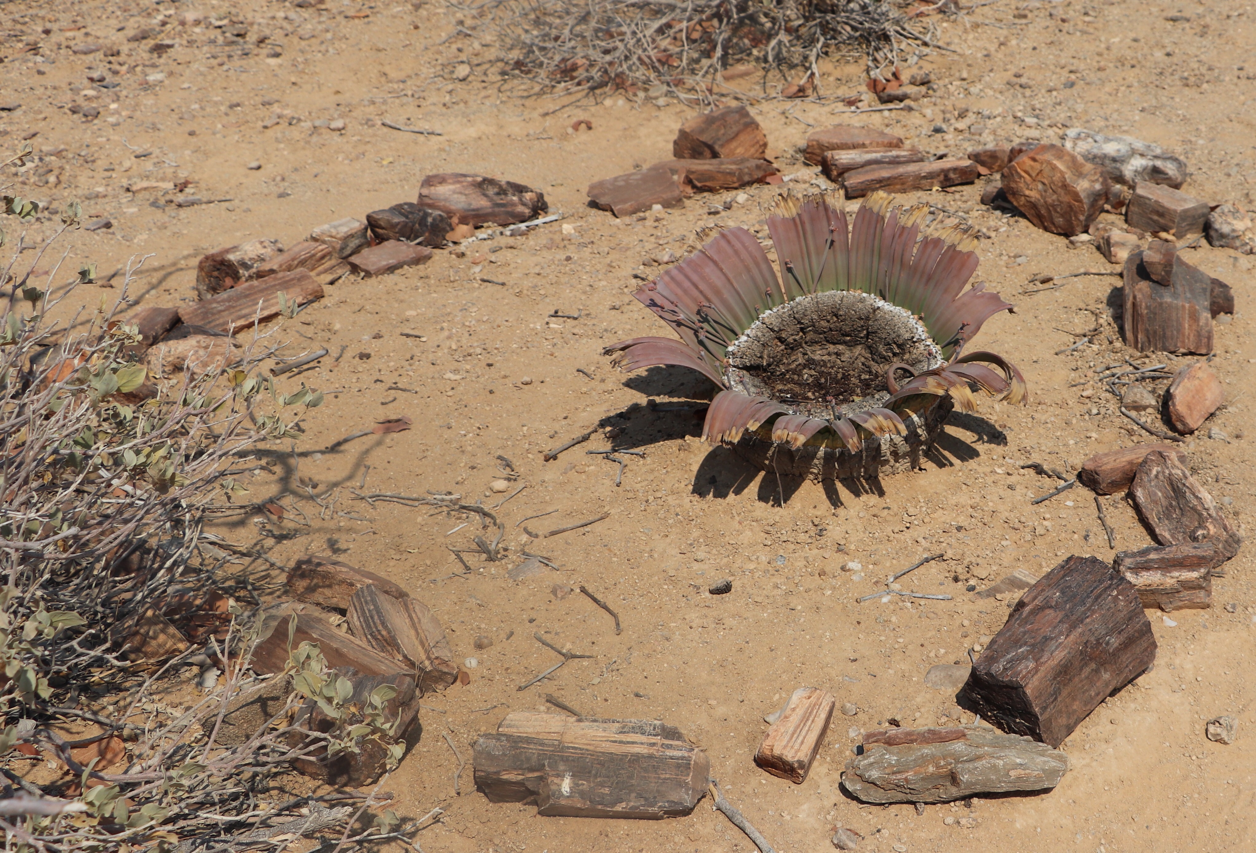 Next we were off to visit the Petrified Forest National Park. As the Ice Age receded, huge trees (which I think our guide said they figure had stood for 1000 years), from central Africa were deposited in this area, and they were compressed under tonnes of debris and the wood became Petrified. There were pieces of the wood spread over the surface of desert and in some places there were larger trunks of trees, even with some bark still left on the tree. The guide also pointed out a plant surrounded by a circle of the wood, the Welwitschia that was the national plant of Namibia.