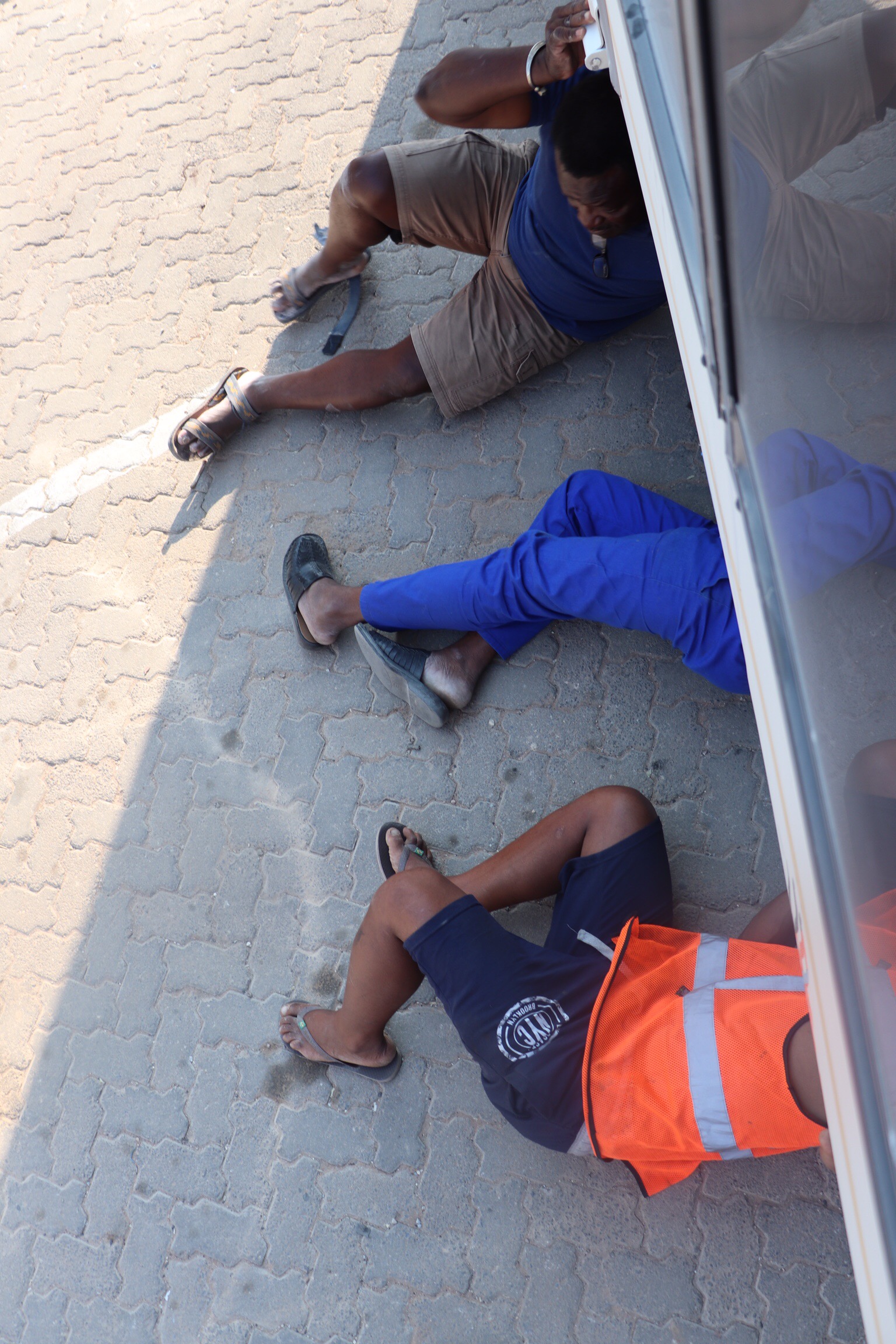 Then we were off back to our lovely lodge to enjoy a swim before heading up to the Sundowner deck to enjoy the sunset, drink in hand, before dinner. Well, that plan came off the rails as a rattling noise coming from the undercarriage of the truck that was assessed several times, got worse and worse. Turns out the bracket holding the water tank on the bottom of the truck had broken and although a fast fix was done with wire holding it up, that didn’t last long and something was rubbing on the drive shaft. Luckily it held until we hit the “bitumen” road (we’d call it “sealed” road) and limped into a town just a short distance. And more luck, there was a welding shop that was still open for the day. So we all headed off back to a gas station in town for ice cream treat and sat on a curb in the shade and chatted while the welding job was done and we were on our way again. TIA – This is Africa, and so travellers need to remain flexible, and we all took it in stride.