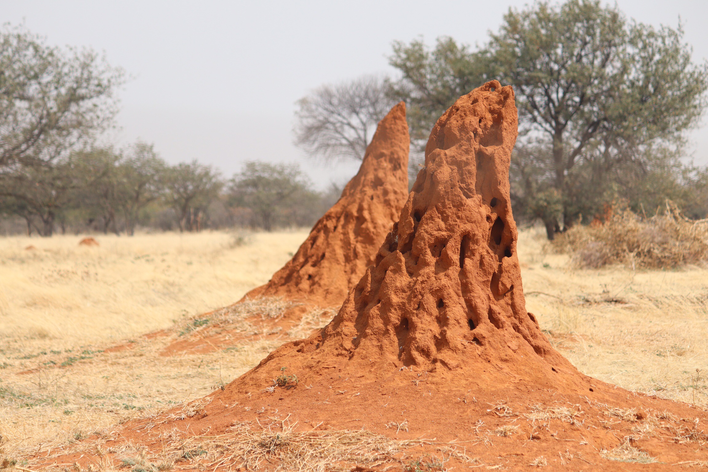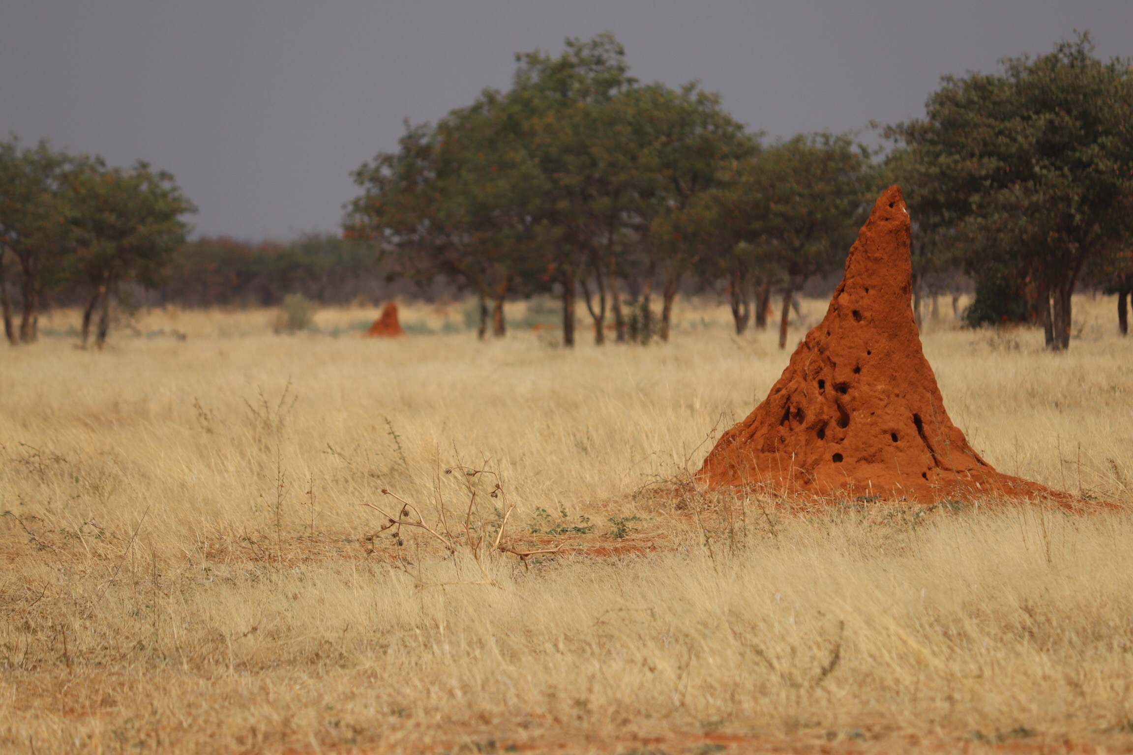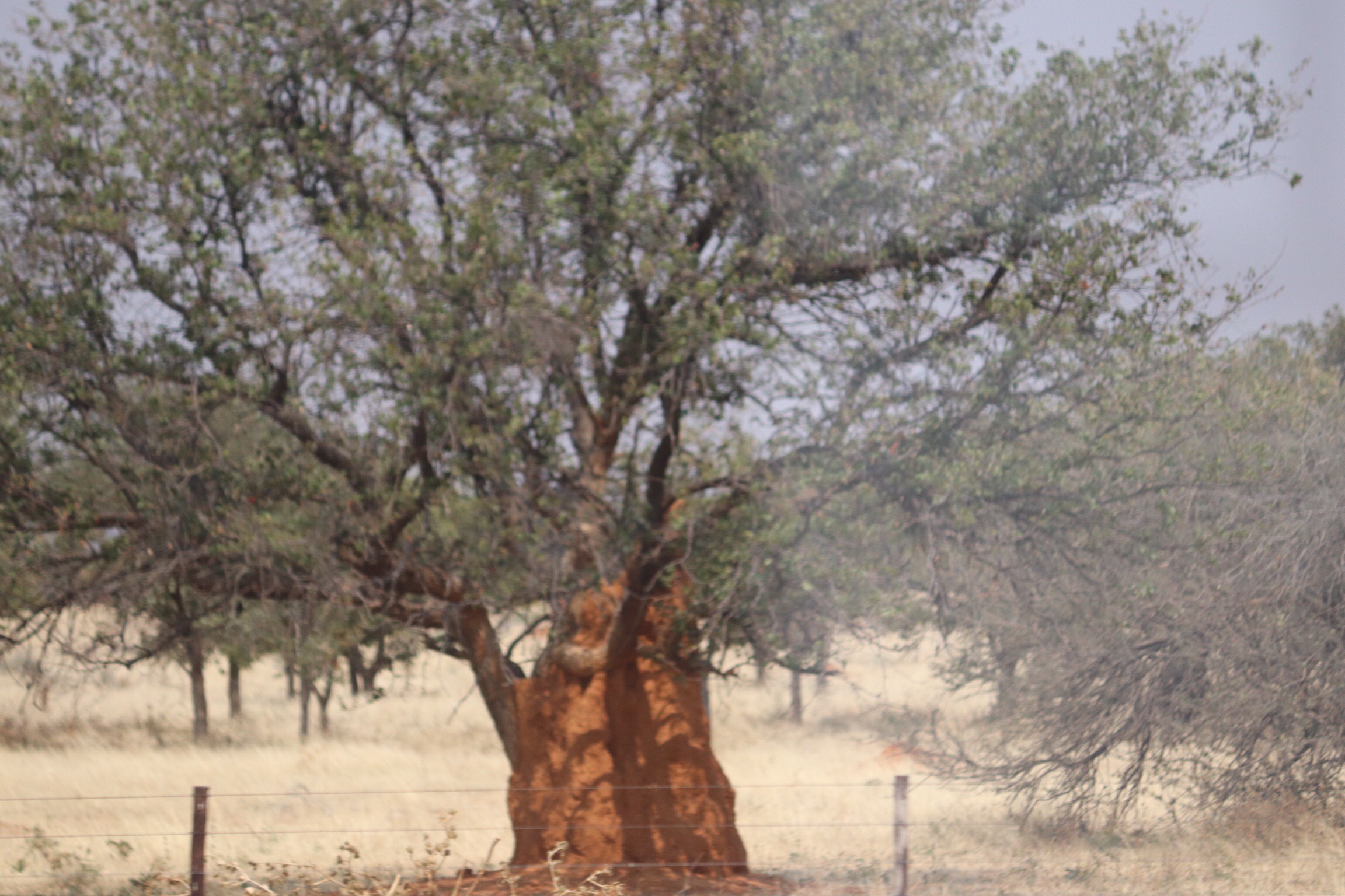 The drive north was a pretty easy one, with a first stop by the side of the road while Sandile explained the growing number of large mounds we’d seen scattered in the landscape. Termites build these using secretions to bind the soil together into these upside-down cone shaped mounds. The mounds generally lean toward the west somewhat and the Bushmen use that as a direction indicator. Some of them encapsulate trees and eventually kill the tree. There are tunnels and compartments for various uses within the nest
