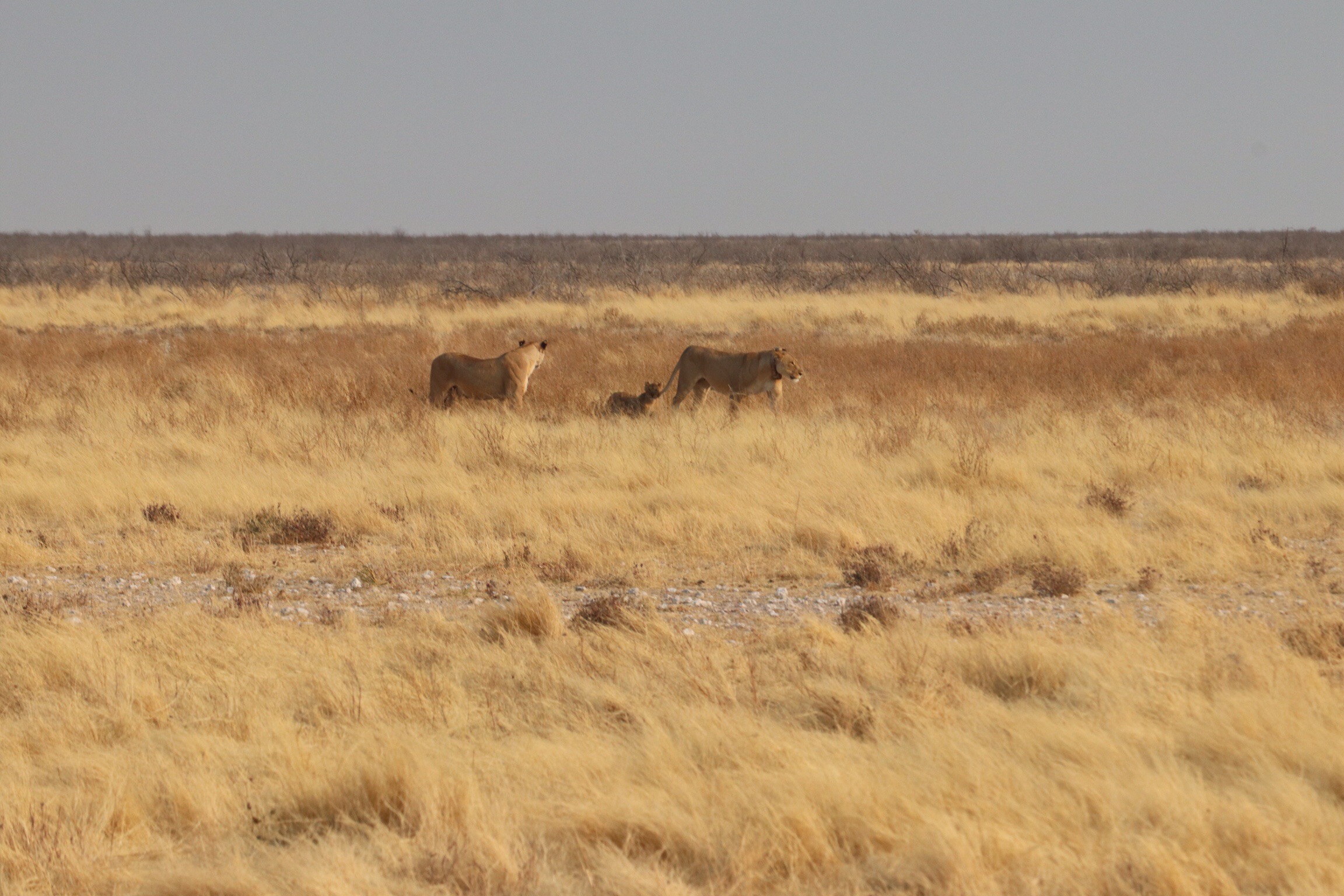 Innocent told us to watch the animals behaviour because it can tell us much about what might be nearby. When we arrived at one water hole we noticed there were lots of zebra and springbok nearby but not at the water hole. And they were all spread out standing looking in the same direction. Sure enough, minutes later the zebras all ran into a bunch all facing the same way with the springboks behind them doing the same thing. Innocent said it was a defensive position as if to tell any predictors that they had been seen and and they couldn’t be surprised by an attack. Minutes later, 2 lionesses with a cub poked their heads above the horizon and wandered nearby. We watched in anticipation. The lions didn’t spend much time there, as they knew they had been spotted and wouldn’t have success hunting.