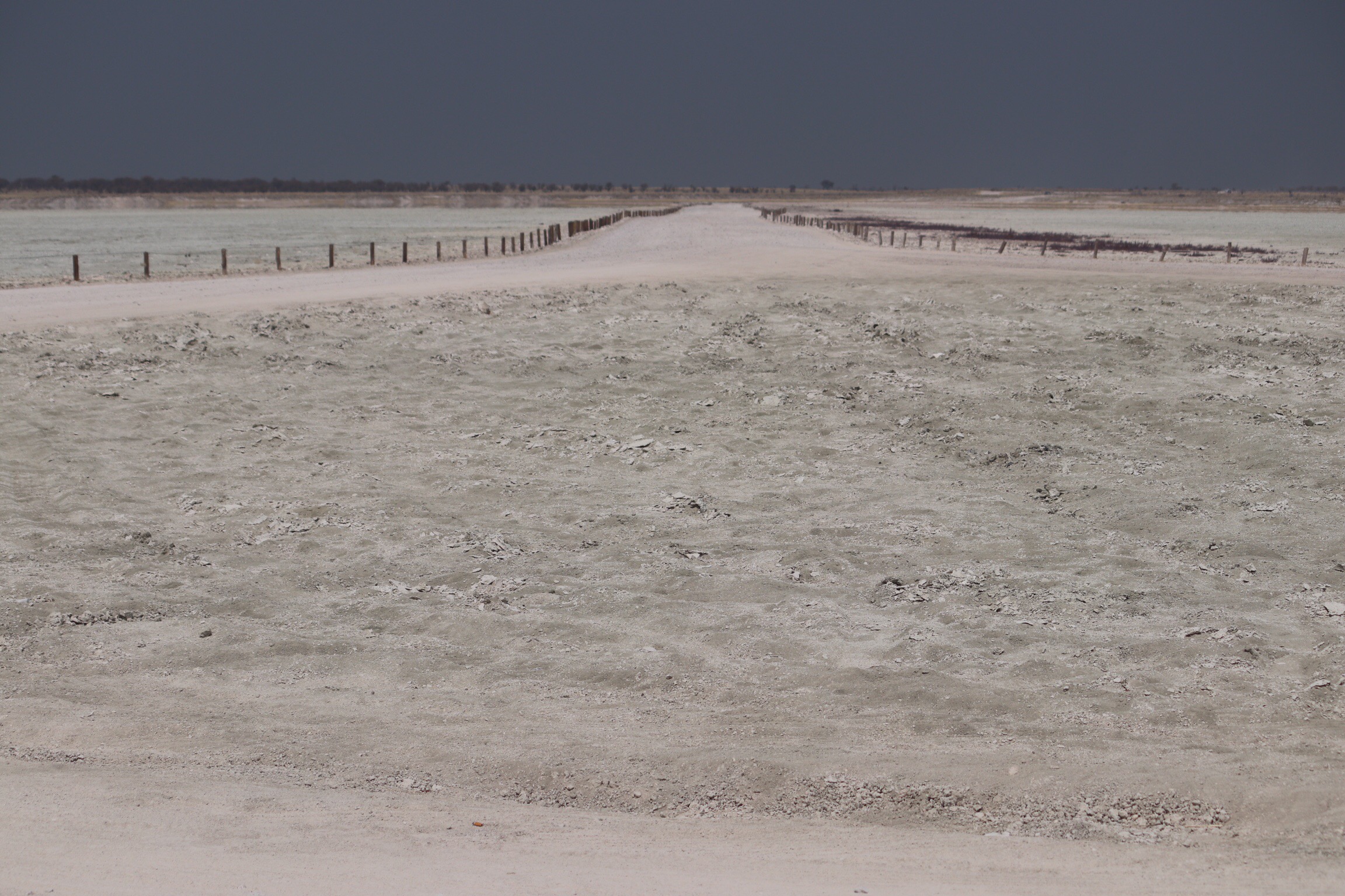 We had worked our way to toward the salt pan at one side of the park, and so we stopped at an overlook where we were able to get out to stretch our legs and take a look at absolutely nothing, as far as the eye could see. Flat, white and devoid of any sign of life. It is 120 km by 60 km in size.