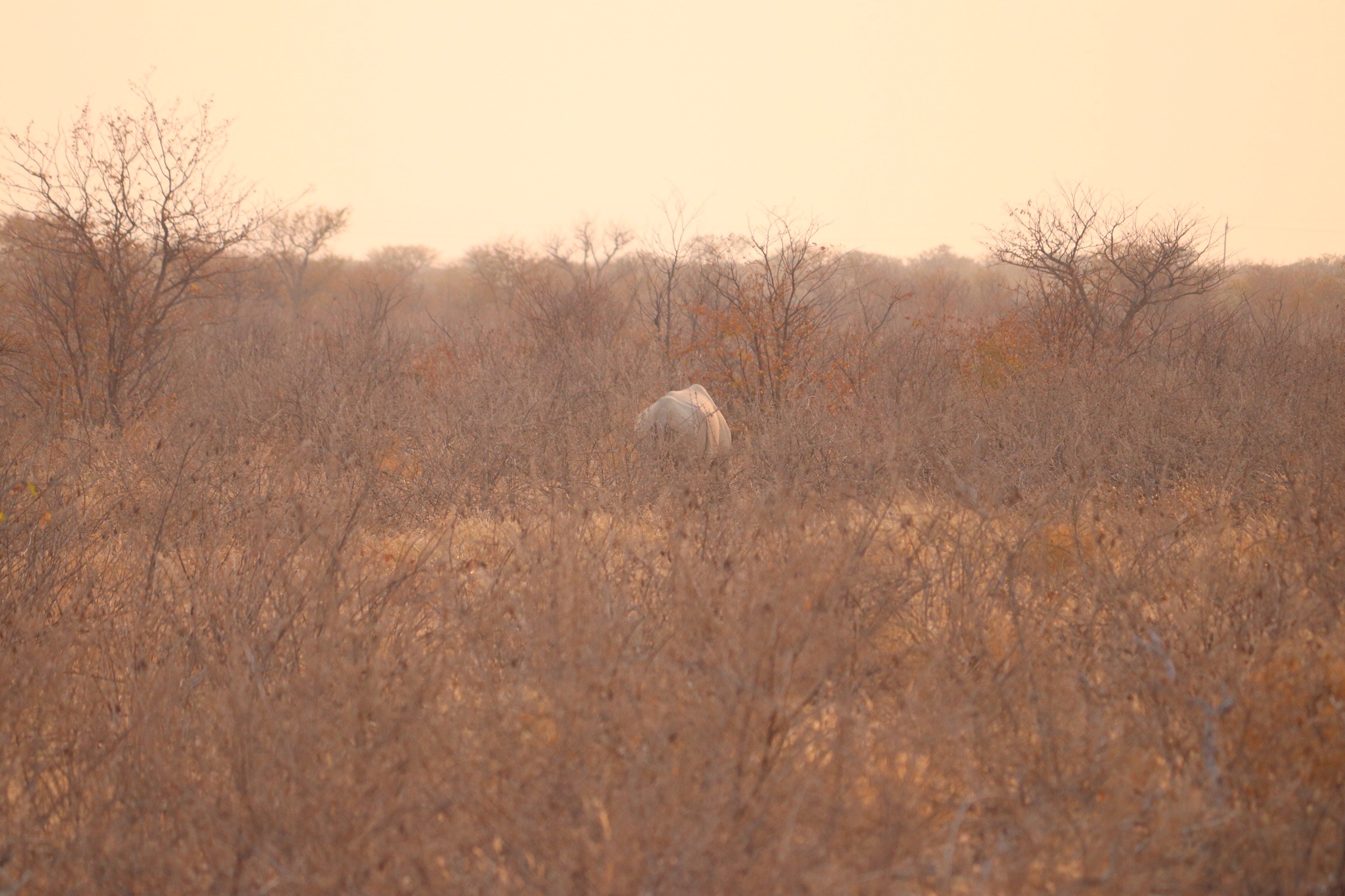 As we neared Anderson Gate Innocent, who was driving at the time, asked Sandile to check out what he thought might be a rhino in the very far distance with the binoculars. I couldn’t see what he was looking at with my naked eye but I took a picture with my zoom lens and then looked at the picture blown up. There it was. How on earth Innocent could have seen it is beyond me. And then even closer to the gate still was another white rhino quite near the road but with it’s back to us. At first I thought it was a huge boulder, but then it moved and I realized it was indeed a rhino.