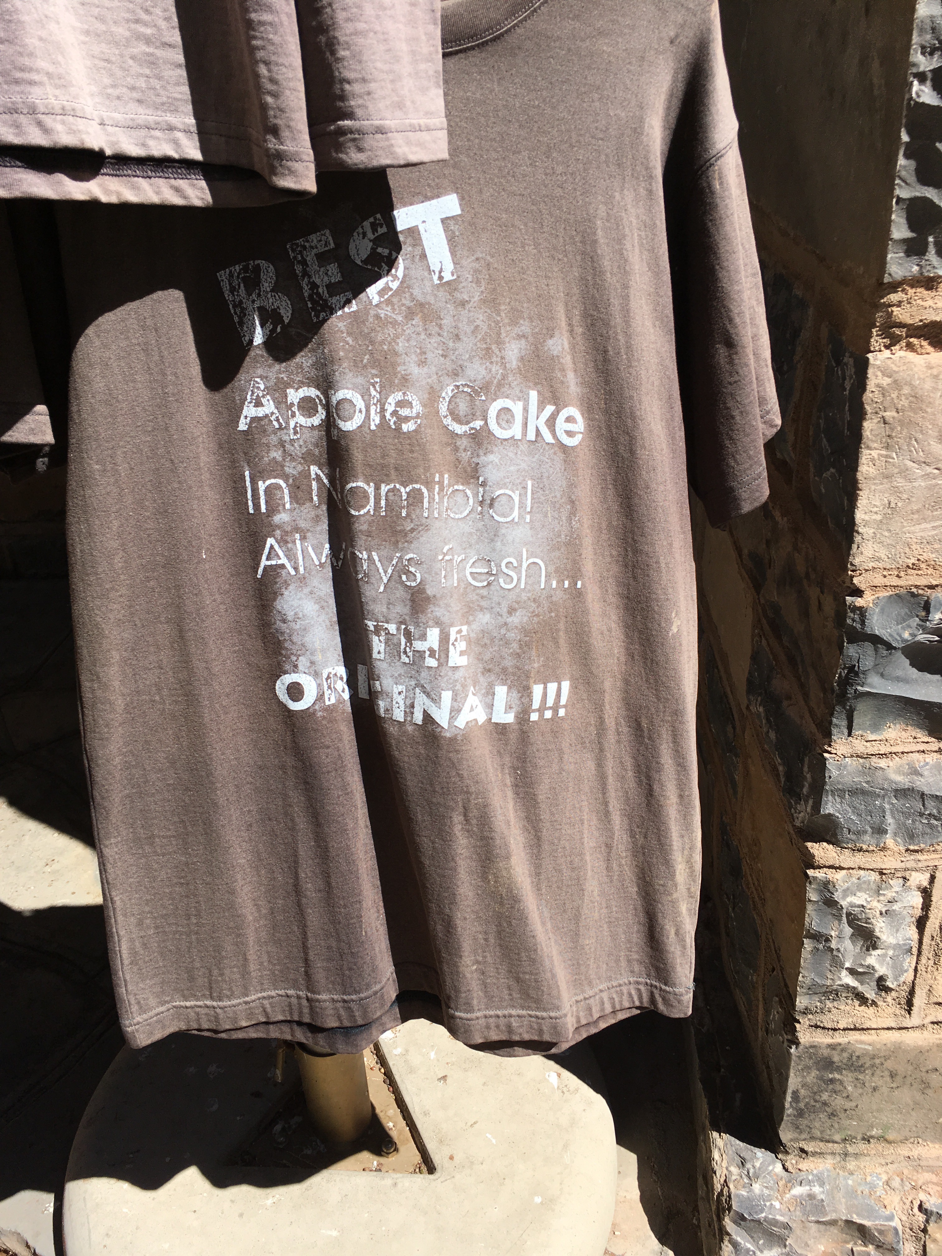 Part of the way from Sesriem to our destination was a remote little town, appropriately called Solitare. A fellow, Mr. McGregor, now deceased, recognized there was an opportunity because there weren’t any services between these two spots. We stopped for gas, toilet break and to try our second version of Apple Cake. The consensus was that this one had a better filling, but the crumble wasn’t as good as the original and the overall winner was the first. We also discussed how weird it was that we were actually in Namibia comparing apple cakes!