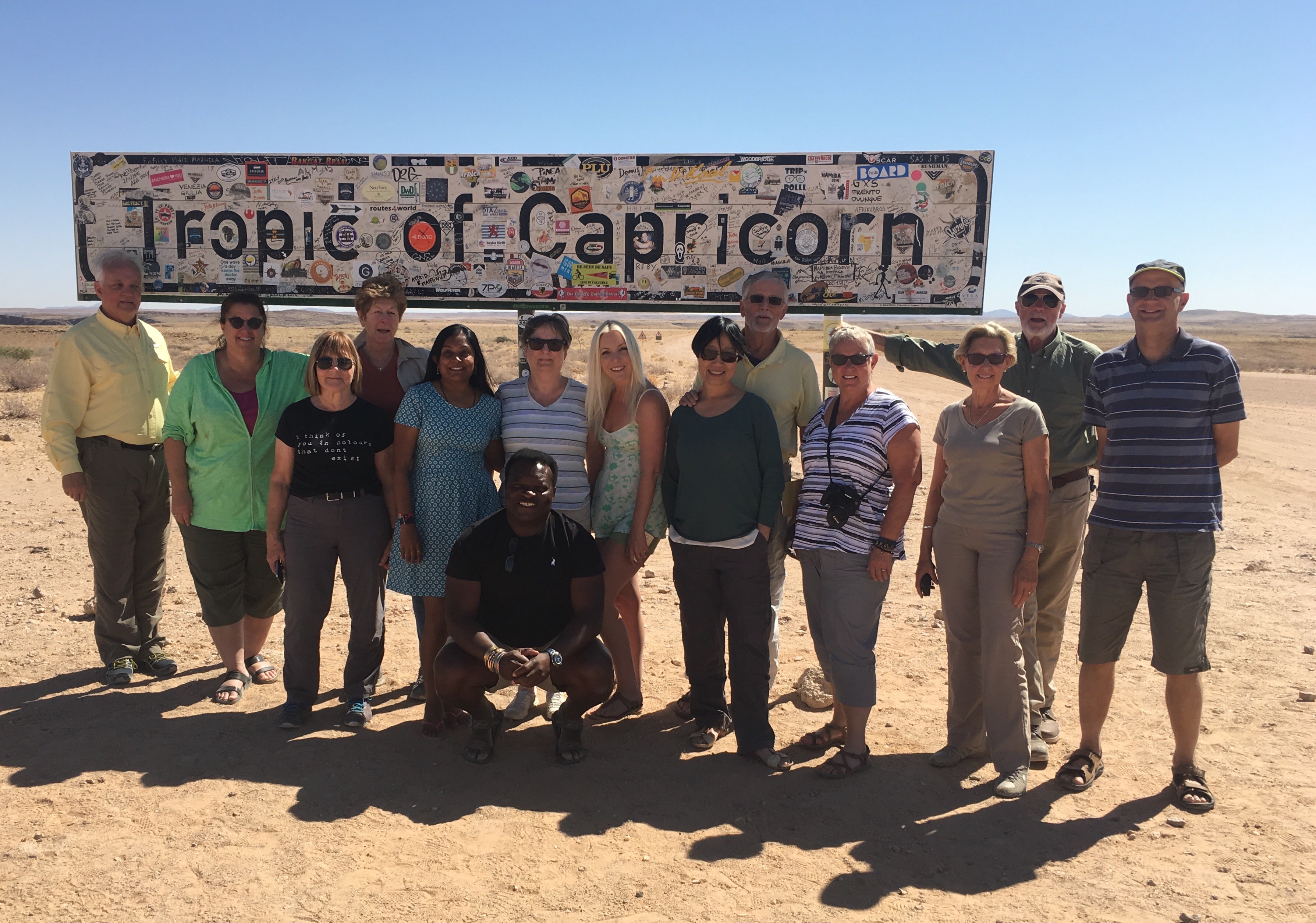 Somewhat further along we crossed the Tropic of Capricorn which was not at all exciting for the Australians but was for those of us from the northern hemisphere. Out in front of the group picture is our guide Innocent. One of the nicest people you’ll ever meet. Kind, gentle but firm. “Happy Days” is his favourite expression.