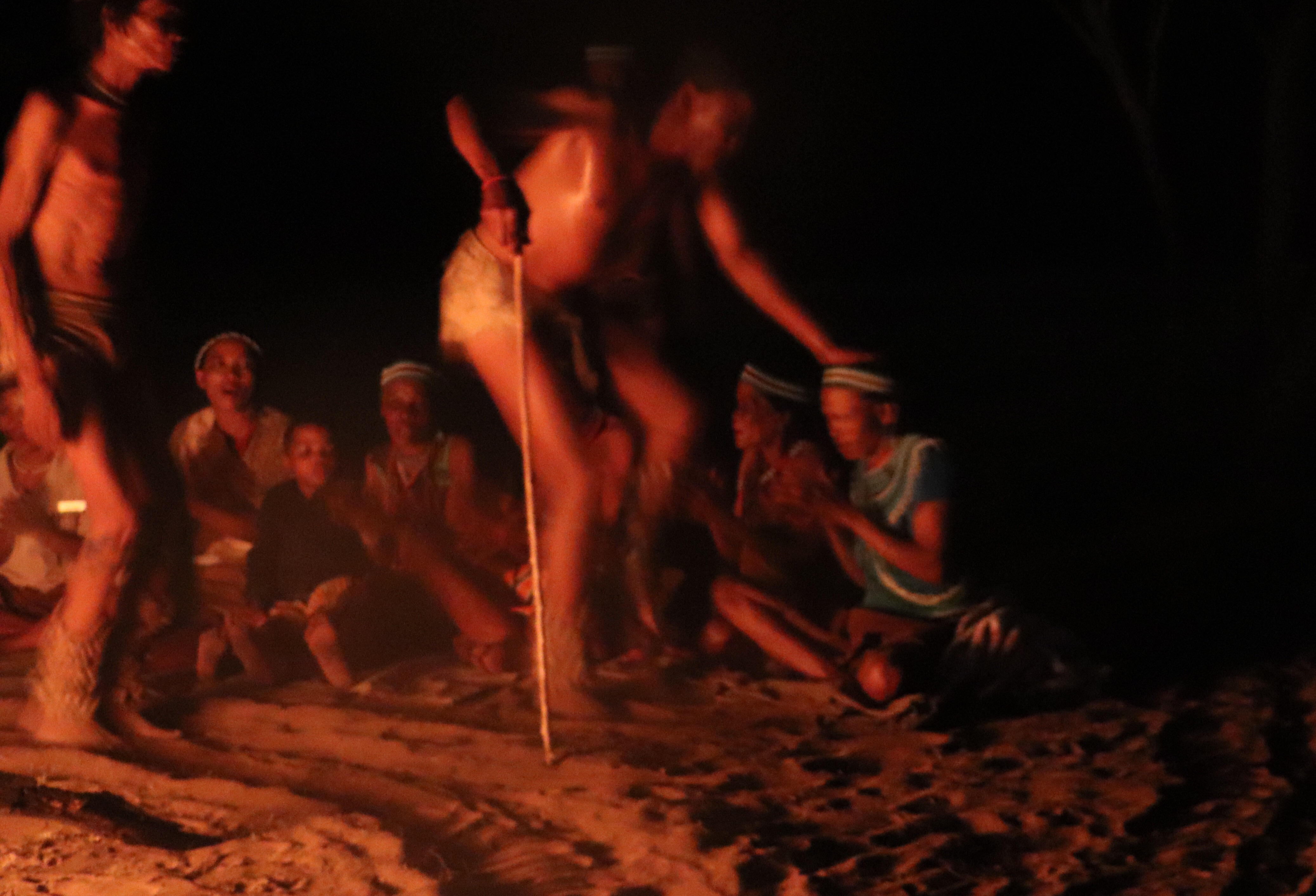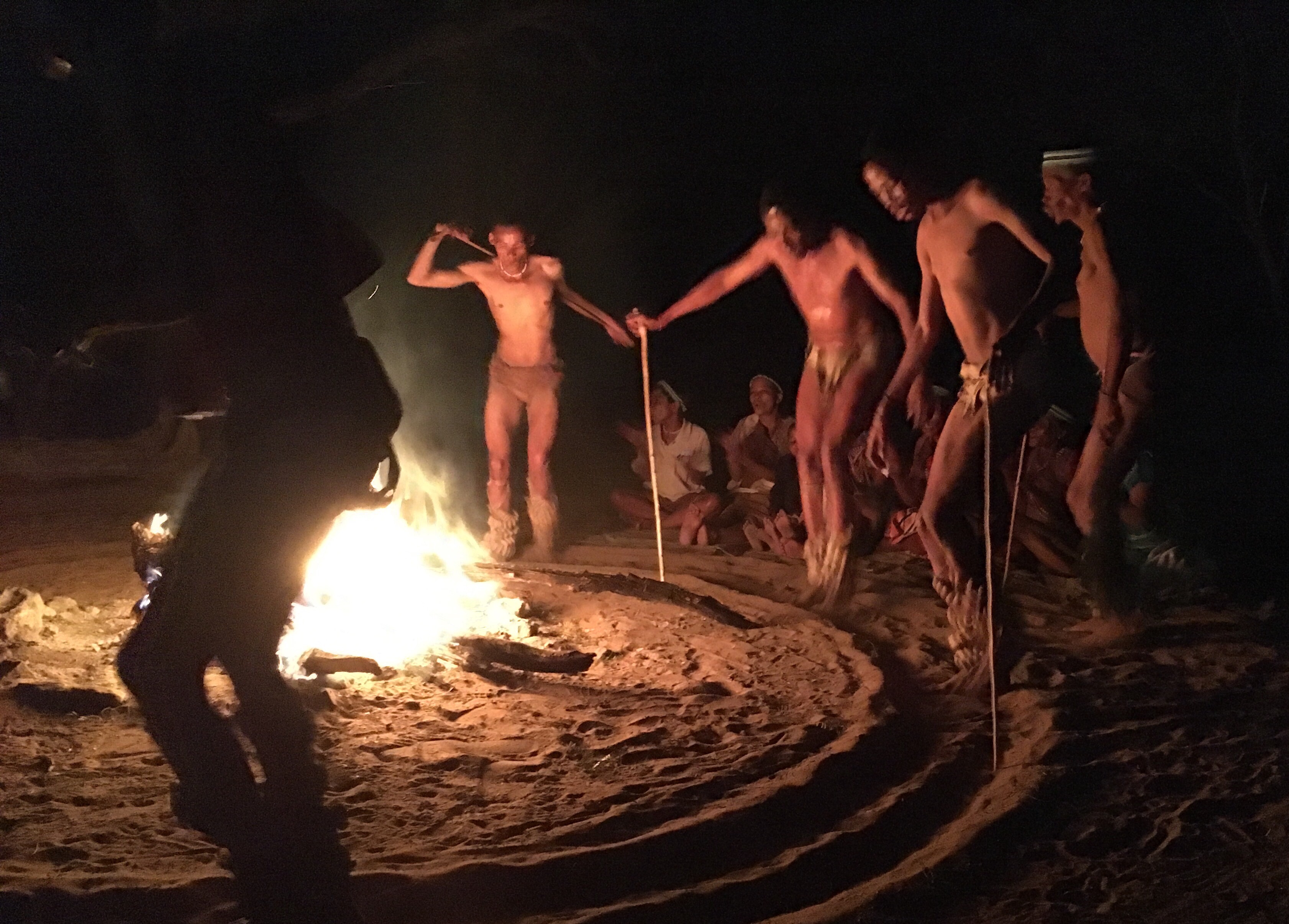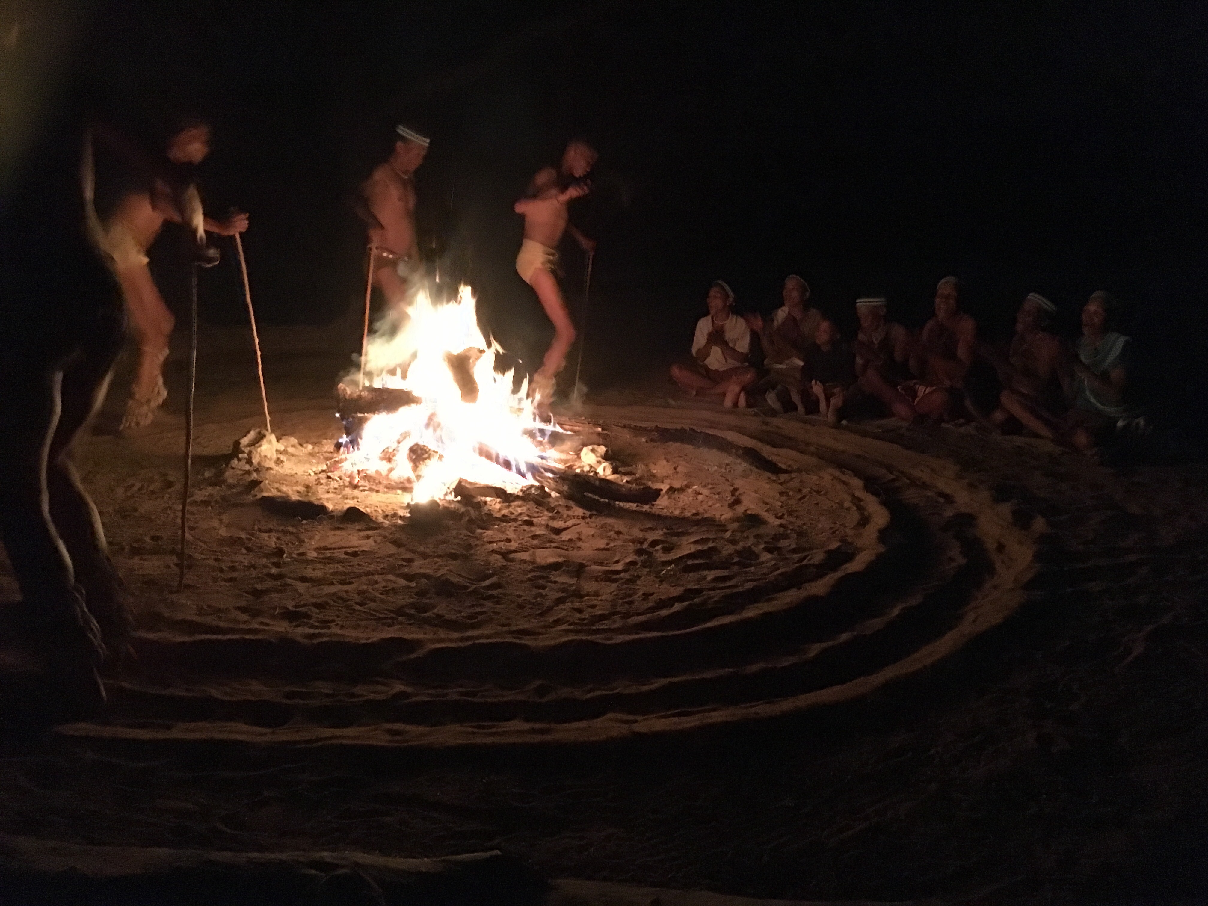 The dinner they prepared and presented to us in an outdoor gazebo in the courtyard, was one of the nicest we’ve had. It was very western in our honour- comfort food-beef goulash, rice, sweet potato, cauliflower with cheese sauce and greek salad. After our delightful meal we were invited to camp chairs set up around a huge fire to experience an evening of traditional story telling, dance and song of the San. Several of the San women were sitting in behind the fire, chatting among themselves. They were dressed in traditional San attire as were the 5 men who would be the dancers. The leader started by explaining what the presentation would be. The song and dance were part of a healing ceremony and typically the “shaman”-type healer of the group used the song and dance (and some recreational marijuana) to get into a trance and the laying on of his hands to heal any ailments in the participants. Nanci and I figure Eli, our physiotherapist, should add this to his repertoire. Innocent had arranged for their leader to tell a couple of traditional stories, and for them to do 4 – 5 song and dances for us, but because it would have been rude to leave once the dancers had entered into a trance, they ended the demonstration before they got to that point. The healer was a frail-looking older gentleman, who we were worried would keel over and fall into the fire. It was great to see that the younger people were being schooled in the traditions though. It was all a little surreal, especially when some of the staff came to watch and were sitting looking at their iPhones. We were grateful to be able to learn more about the Bushmen and be invited to watch some of their rituals.