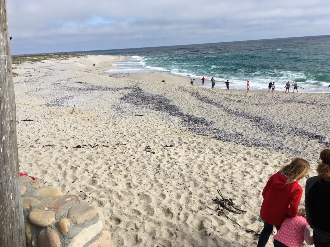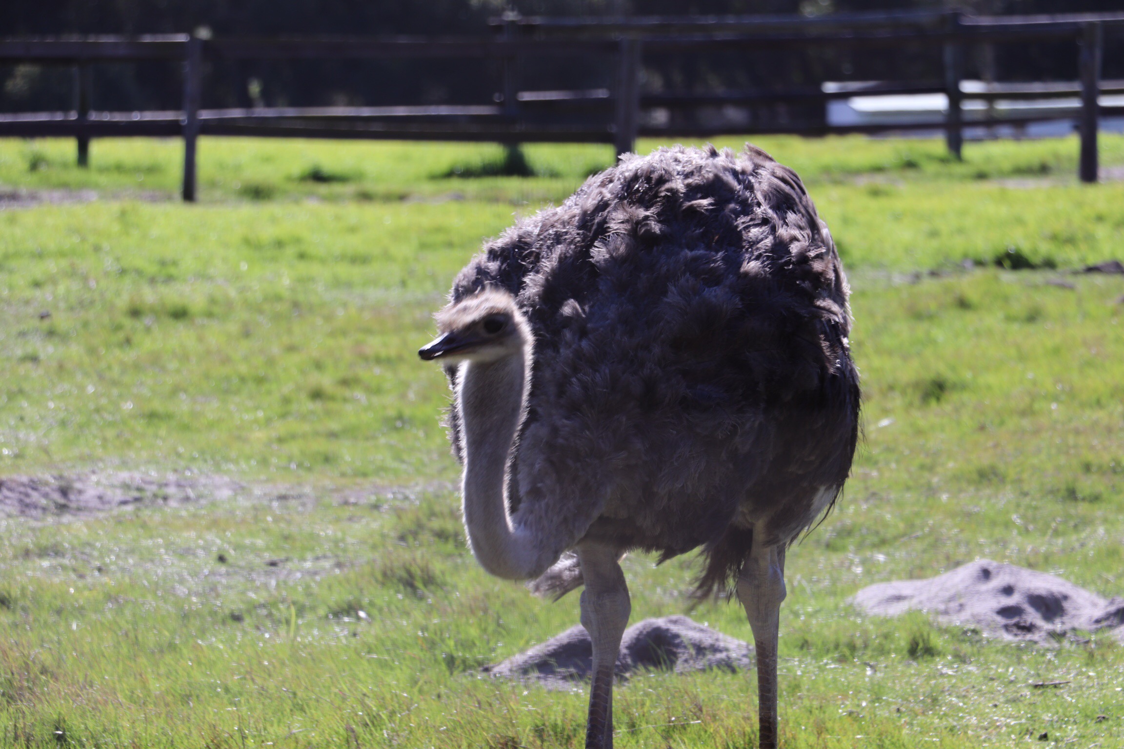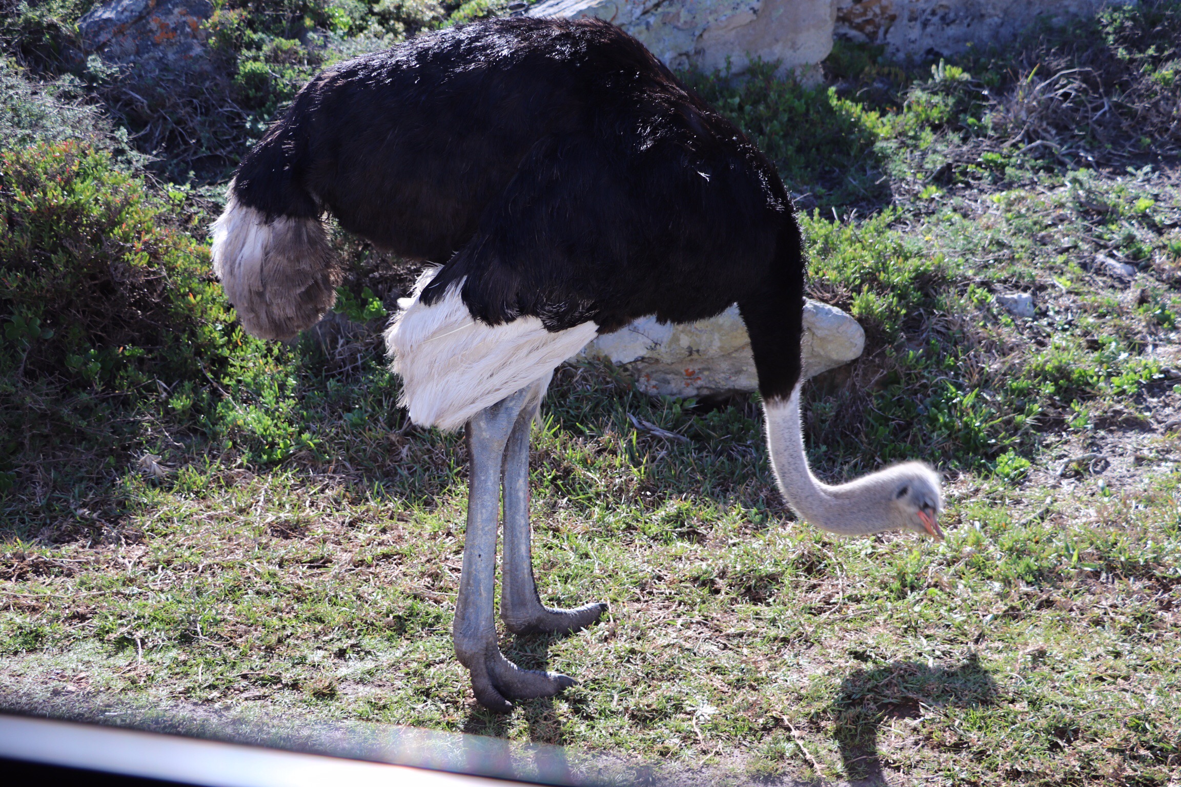 As we neared the southern most tip of the Cape we stopped to see an Ostrich farm and I learned a lot about them! The hens lay an egg a day until they have a full nest to sit on and of course they sneak the eggs out from under them to encourage continued laying. The gift stores are full of ostrich eggs, painted and etched and adorned for sale. They are huge – 6 inches high and weigh about 3 pounds (20 times the weight of a chicken’s egg). Imagine the omelet! When the females, which have grey feathers vs the males black and white, are in breeding season their necks turn pink. Pretty darn obvious! They mate for life, just like Canada Geese I pointed out to Xavier. Not sure he knew what a Canada Goose was.