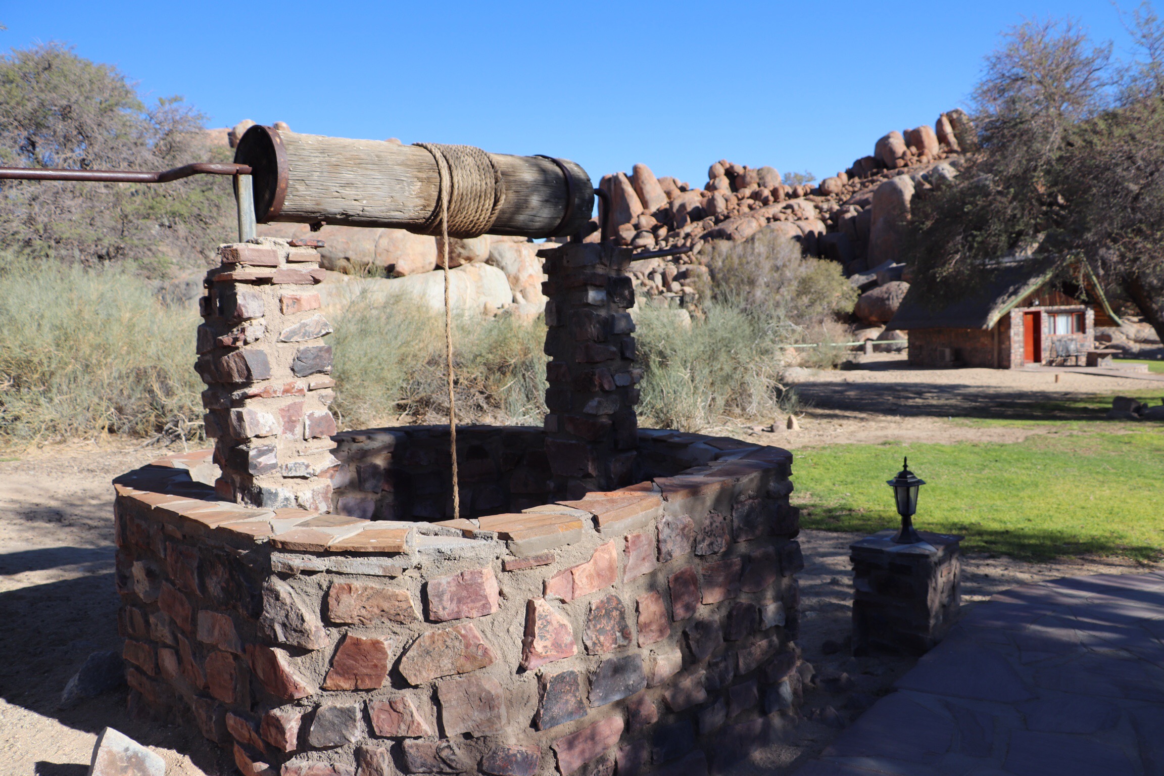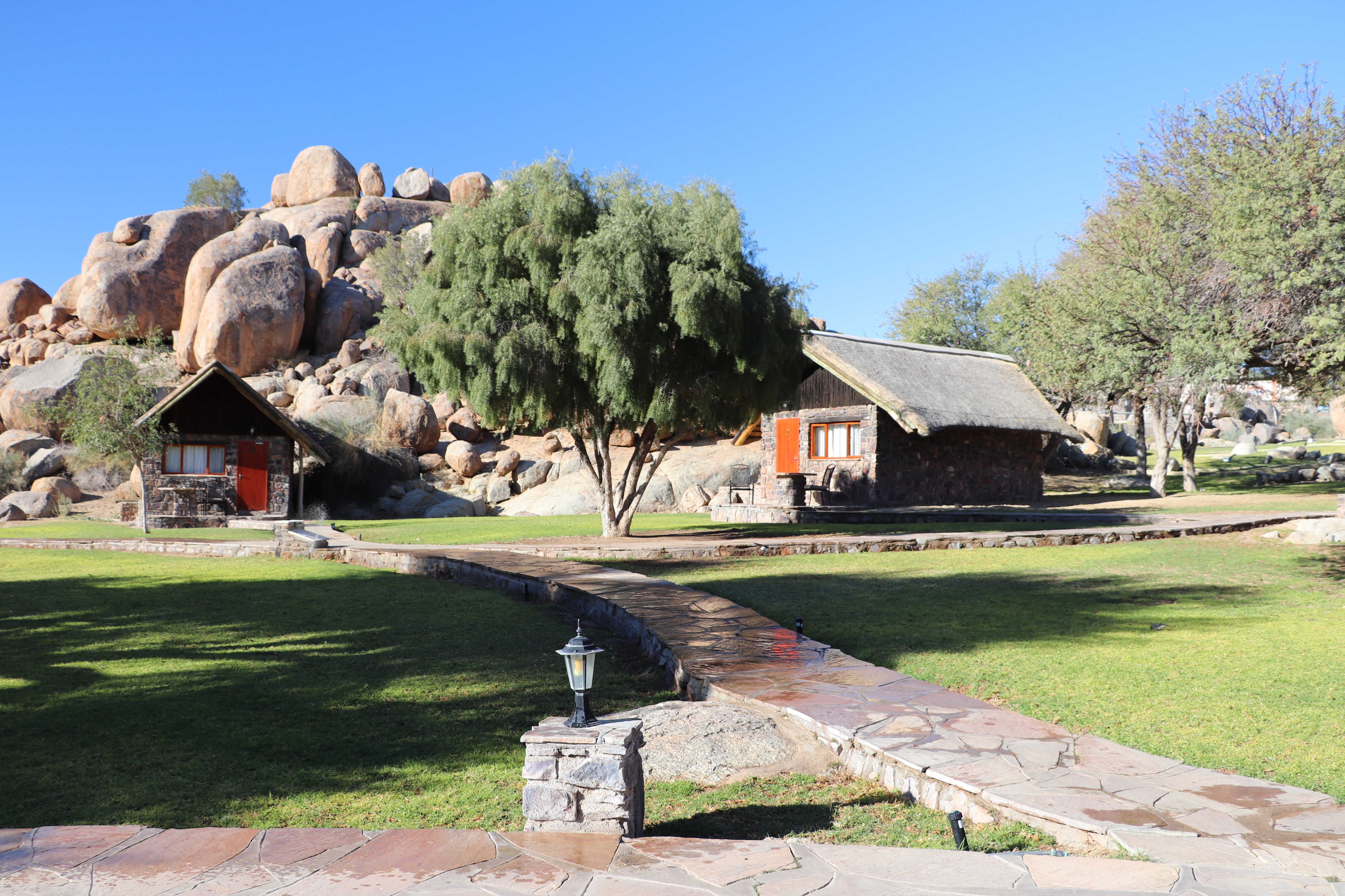 By late afternoon after many kilometres of “African massage” (washboarded and bumpy gravel roads), we came in sight of the amazing Fish River Canyon in the distance. We carried on to our Lodge, a real oasis in the middle of the desolate but truly interesting landscapes. The lodge consisted once again of little cabins but this time nestled among huge boulders, and beautifully landscaped grounds. It is rated as one of the best lodges in one of my tour books on Namibia. The rooms actually had walls built around the boulders, and other walls were made of stone, both of which were sealed with clear lacquer of some kind. For the first time the room included mosquito nets over the beds. We don’t enter malaria area for a few days so we’re not taking medication yet. It seems pretty cold at night for there to be mosquitos around but it was suggested we use the nets just in case and so happily complied. Even if there is no malaria, who wants a bunch of bites? I didn’t hear any of the tell-tale buzzing at any point