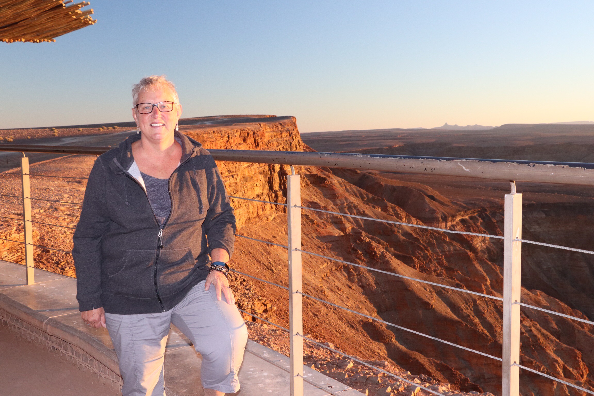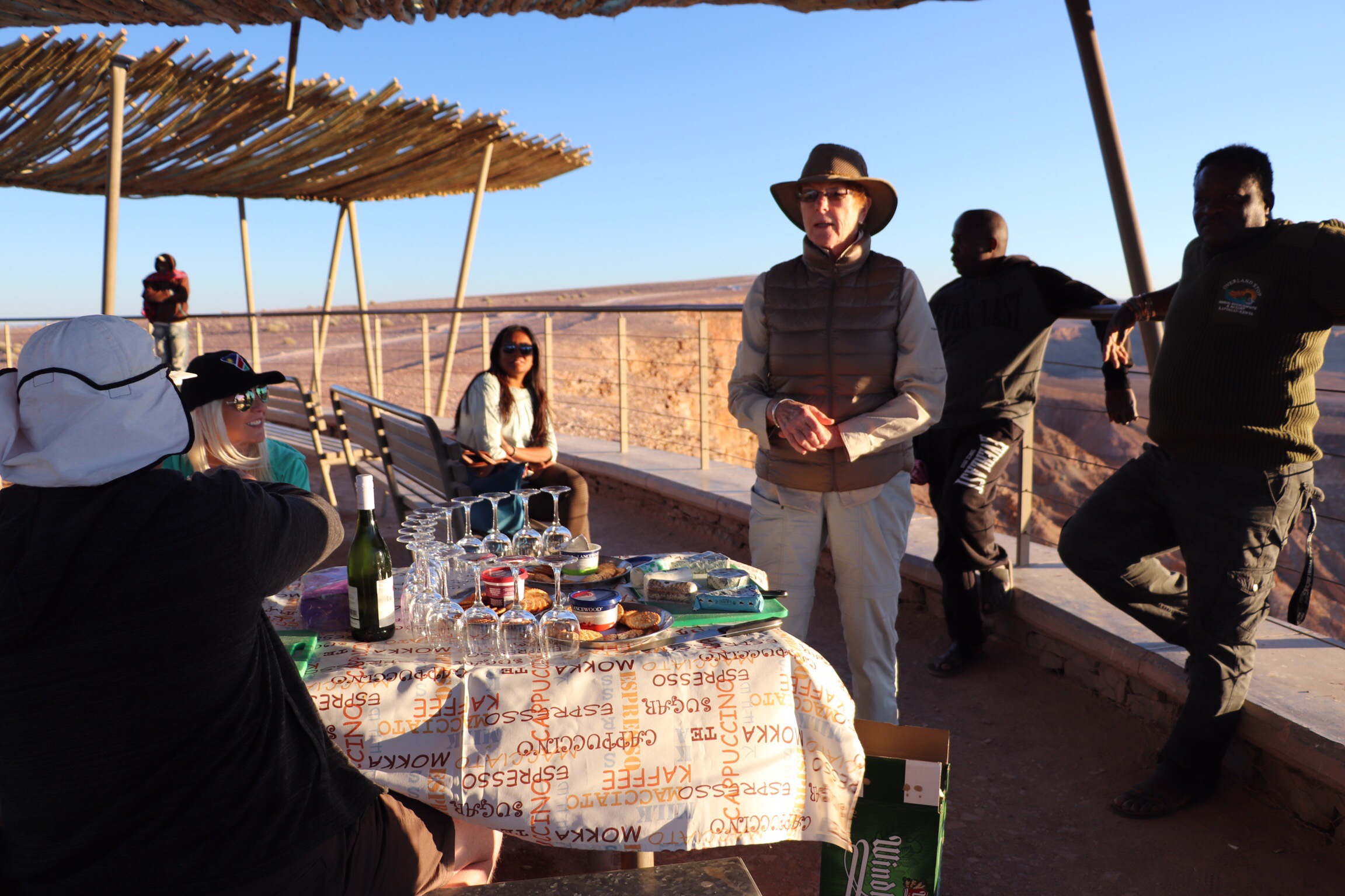 After just a quick chance to unpack a little and freshen up we piled back on the truck to go the 10 km to see the Fish River Canyon. This canyon is not like the Grand Canyon in the US with it’s dramatic vertical, deep walls, but it is really stunning. It measures 160 km long, is 28 km wide in places, and is up to 550m deep. It is a popular hike and a route along the river bed covers half the length of the canyon and takes 5 days. We arrived an hour before sunset and we walked around one side of the highest point to view the canyon with the tiny Fish River far below. There were no fences and one misstep would have been disastrous, but there were the usual, “just a little further back” jokes as we took pictures of each other. When we arrived back at the observation deck at the appointed hour to watch the sun go down, Innocent and Sandilay had laid out a lovely surprise, a wine and cheese feast with glass wine glasses and all. What a civilized way to watch the sun set over one of the largest canyons in Africa.