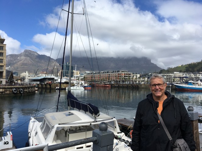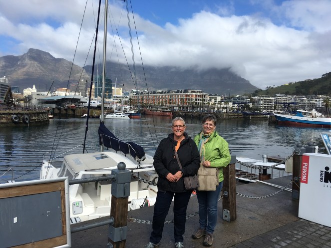 Both Nanci and I had a great sleep last night and even felt human when we got up this morning. We did, however, get a slow start because it was cool, rainy and overcast and so we weren't motivated. After a nice breakfast at the Cape Milner Hotel, our comfortable home away from home this week, we decided to head for the Victoria and Alfred Waterfront where we knew we could at least see some shops in the shopping mall. It's a relatively new development along the busy Cape Town harbour. Old marine buildings and some new builds have been turned into an eating and shopping Mecca. There are over 450 shops and services with building still continuing. Much to our delight, the day took a decided turn for the better and the sun came out, and there were mostly big white fluffy clouds milling about. We were even lucky enough that the "Table Cloth" of clouds that normally surrounds Table Mountain lifted so we were able to see the whole mountain.