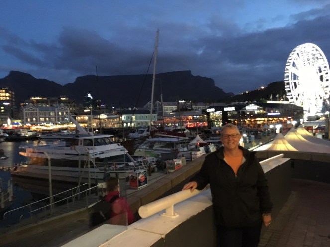 Surprisingly enough we got hungry once again, and Nanci had picked up information on a South African cuisine restaurant at the Wharf area. We figure, when in Rome……. It was an excellent choice. We started out on the patio looking out over the luxury and working boats in the marina with Table Mountain and the Cape Wheel, now lighted, as a backdrop. But after it started to spit rain a little, we got moved closer to the building out of the rain. For an appie, we went wild and tried Ostrich Carpaccio. It was served sliced very thin and was a little like chicken. Just kidding, didn't taste like chicken at all. I had the fresh line fish of the day, whose name escapes me as it's something completely alien to me. It was described as being similar to Mahi and it was lovely. Nanci managed to save room to have her first ice cream of the trip for dessert. I expect there will be more of that to come.