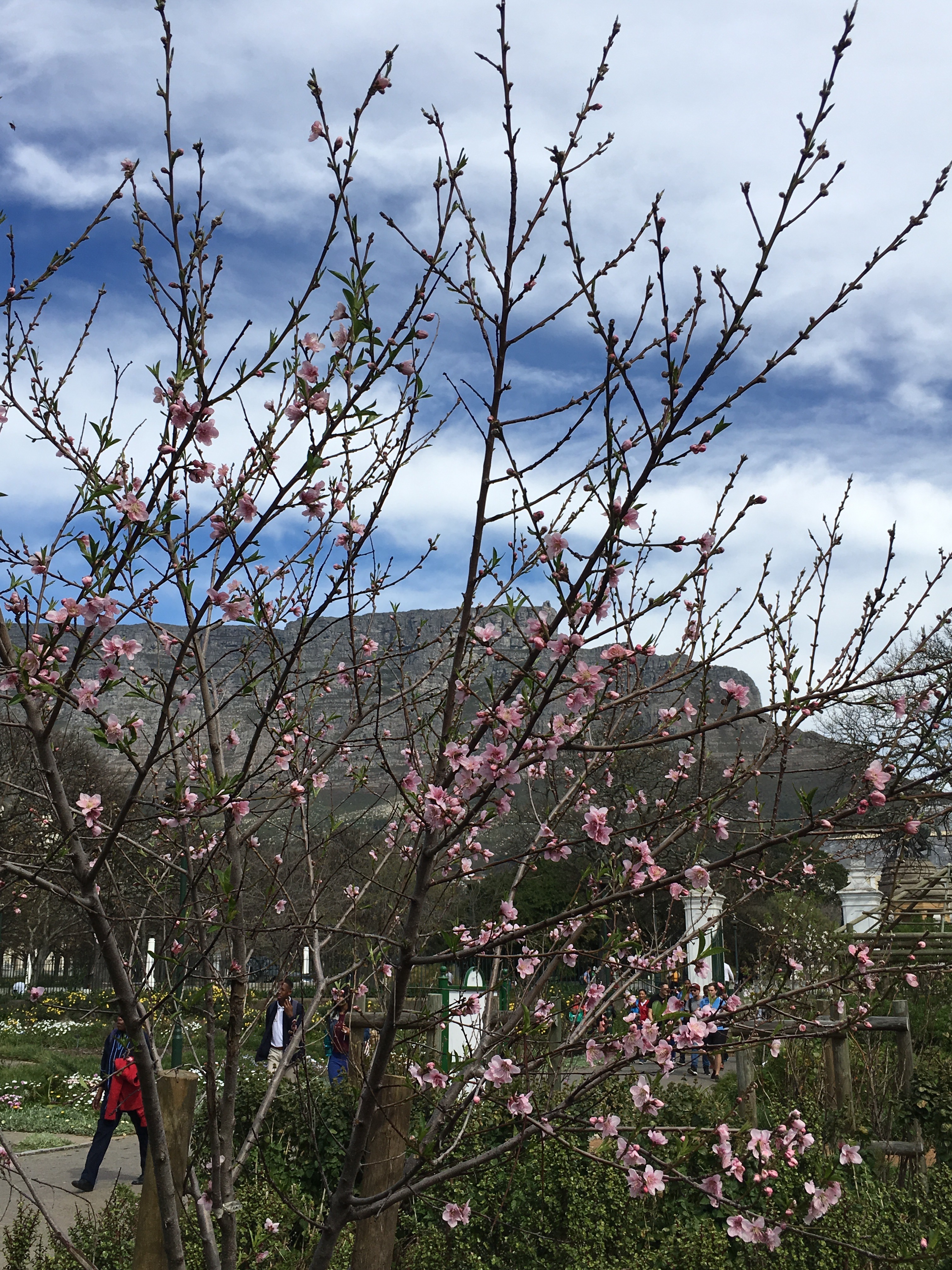 We had gradually been making our way toward The Company Garden, in the centre of the city and adjacent to the Parliament buildings. The Garden originated in 1650 and is the oldest garden in the country. It was started as a garden for the founder and Dutch colonial administrator of Cape Town, Jan Van Riebeeck but is now a really lovely public garden which I bet is really busy at lunch time during the week. Today it was full of families and couples and groups of friends enjoying the warm winter day. You can see Table Mountain from the garden, as you can from almost everywhere in Cape Town. You see it sneaking through the branches of this picture of some pink blossoms on some trees in the garden. Nice to experience spring twice in one year.