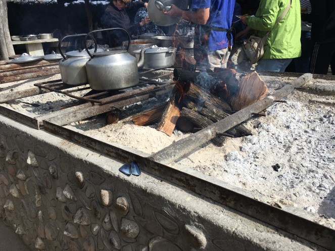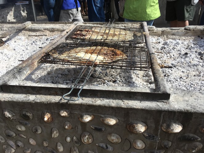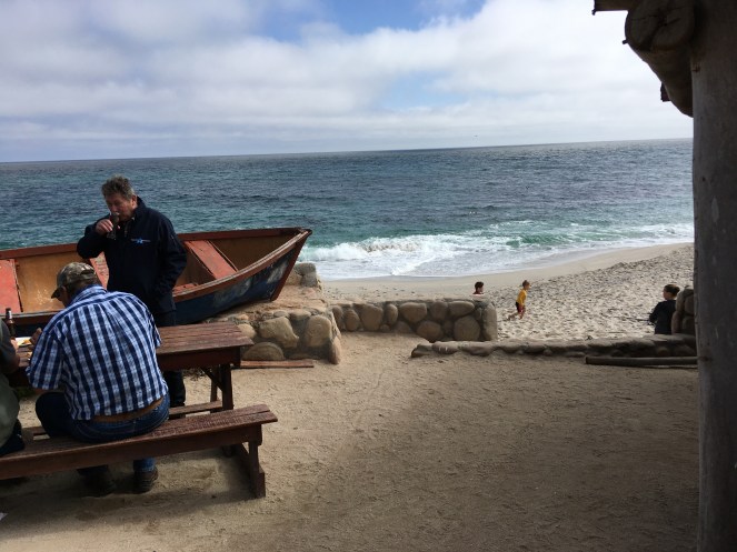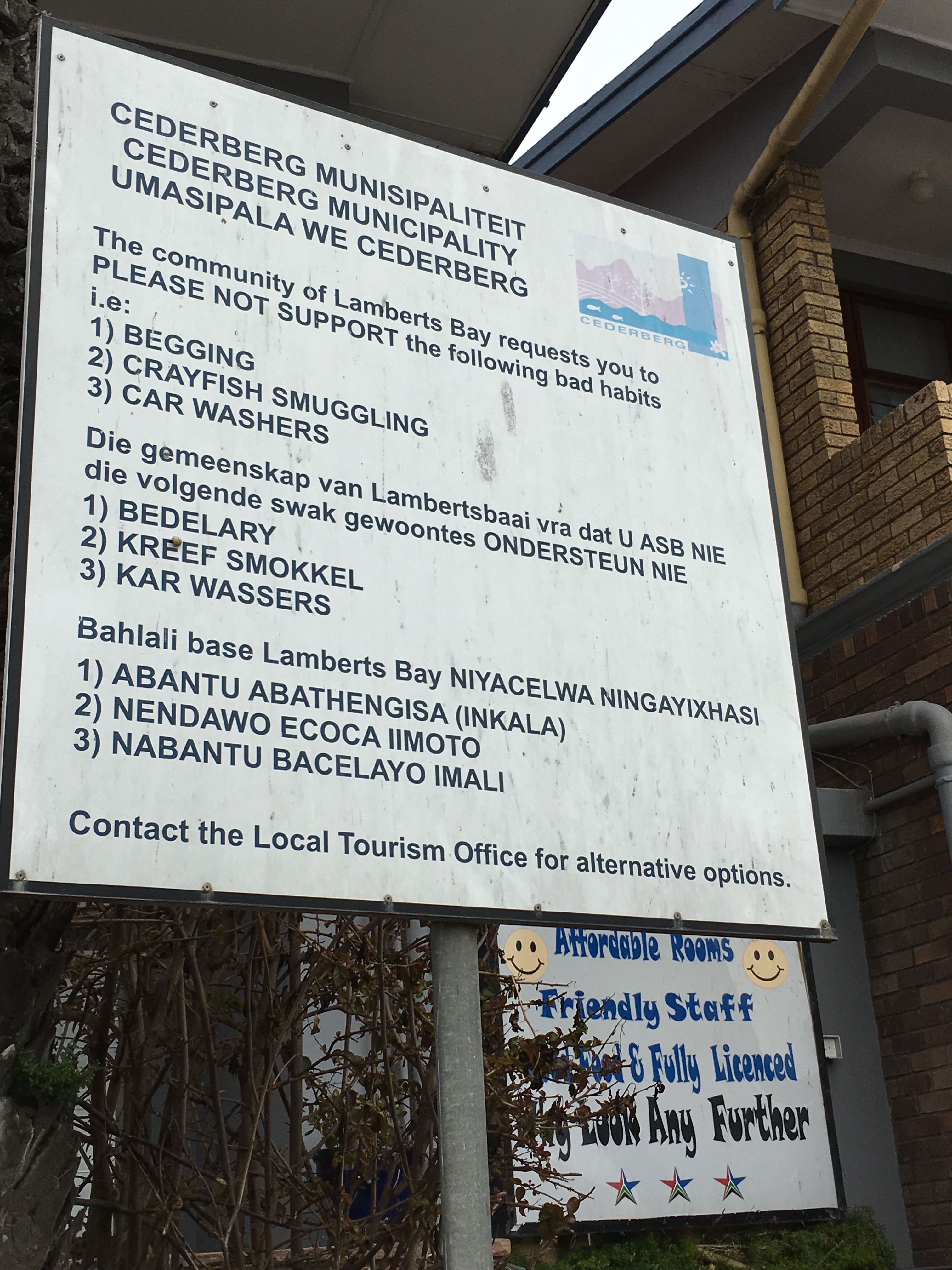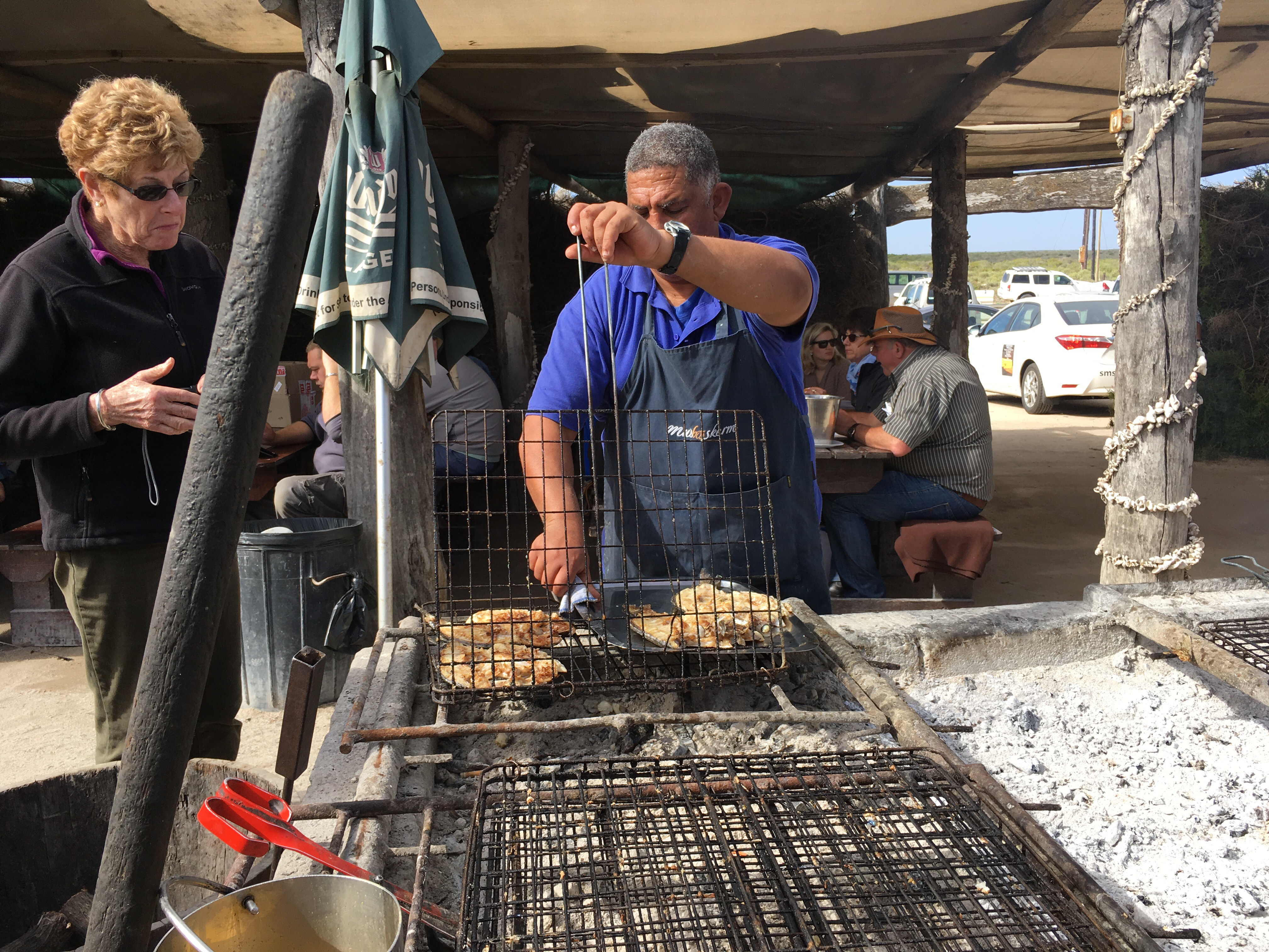 Just after noon we turned west towards the ocean on to rural highway R364 towards Lamberts Bay. After driving through the small town of Lamberts Bay we pulled into a parking lot that was already packed with cars and trucks. We walked in to a seemingly chaotic scene of cooking smoke and music and piles of people at a restaurant on the ocean. The music was an eclectic mix of Afrikaans songs and cowboy harmonica music. It was an all you can eat BBQ buffet or braai as they call it here only open on Sundays. Aside from us, the guests were all local farmers. We joined the queue and dug in and then scattered throughout the venue to find seating. After filling up on several kinds of fabulous barbecued fish, salad, bread with fig preserves, sweet potato, rice with muscles, and stir fried veggies we discovered there would be more courses! Curried beef and lamb and even lobster (which was at a premium price).  We all waddled back to the bus to carry on.