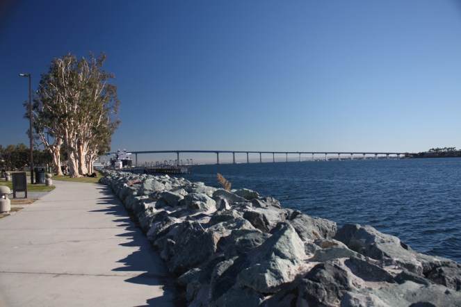 Today I did some laundry and then headed to the Seaport Village and Embarcadero area of San Diego. My temporary home in Chula Vista is near the southern most part of San Diego Bay, just south of National City. At National City there is a huge car/truck port and there are hundreds of cars stored along the shoreline, and a mile of car dealerships along one of the main thoroughfares. I headed north towards San Diego on Harbor Blvd, which passes through Naval Base San Diego. It’s huge but you can’t see much along the way. I do hear the helicopters overhead on a regular basis throughout the day, but I think they stopped around 10 pm last night.