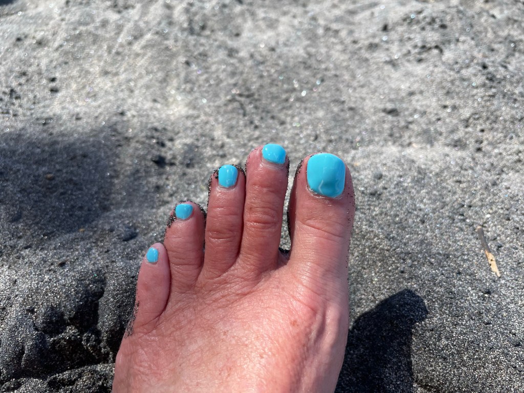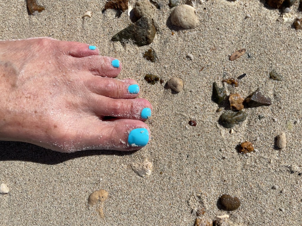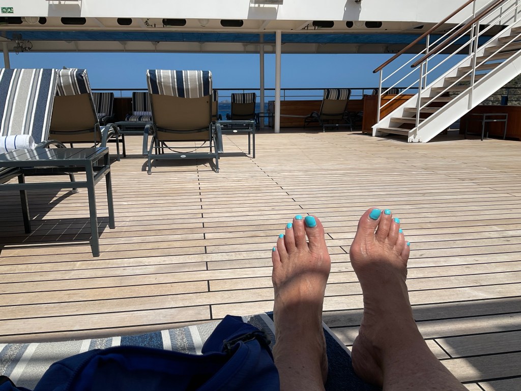 Many times you’ve seen a version of my painted toes in pictures of my travels. Today I decided that I needed to get a picture of them with our beautiful Star Pride in the background. Unknown to me, I was giving some of the loungers on the beach some entertainment in watching my antics as I tried to get my toes and the ship in the same frame, both in focus, all while waves were crashing down on me on the beach. In fact one of the observers took a picture of me in action which I thought I’d managed to get from her today, but it didn’t come through. So I’ll have to share it with you tomorrow. Apparently some of the observers comments indicated they thought I was aiming for Sports Illustrated Swimsuit Edition shots!