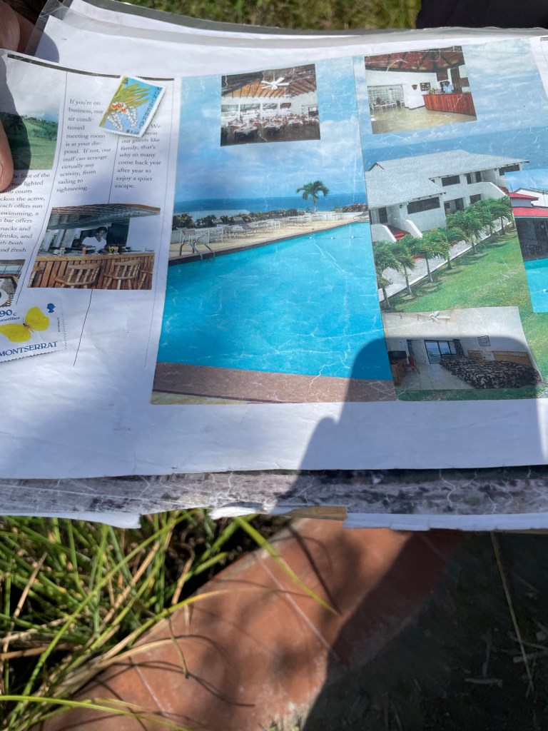 We drove to our first stop which was a very fashionable and well known hotel called the Montserrat Springs Hotel (previously the Emerald Isle) on the hillside over looking the ocean and Plymouth. The guide said it used to have a spectacular view at night with the lights of the city twinkling below. Apparently when it was the Emerald Isle they discovered there were hot springs around them, and they took advantage of that and transitioned into a spa with hot springs. They had the biggest pool on the island and the local kids were taught how to swim there when there were no tourists in residence. It was owned by a Rotarian and the Rotary events were held there. Many islanders learned the hospitality industry there and were able to get jobs at other paces on the island. The guide showed us pictures of its one-time glory days. Now it sits in ruins. The pool is filled in with ash, the jungle has moved in and taken over. The property did provide a great view of the volcano and the area it destroyed. The profile of the hills in the background has changed and the eruption created a new peak as well as several acres of new land at the base of the hillside where it enters the sea.